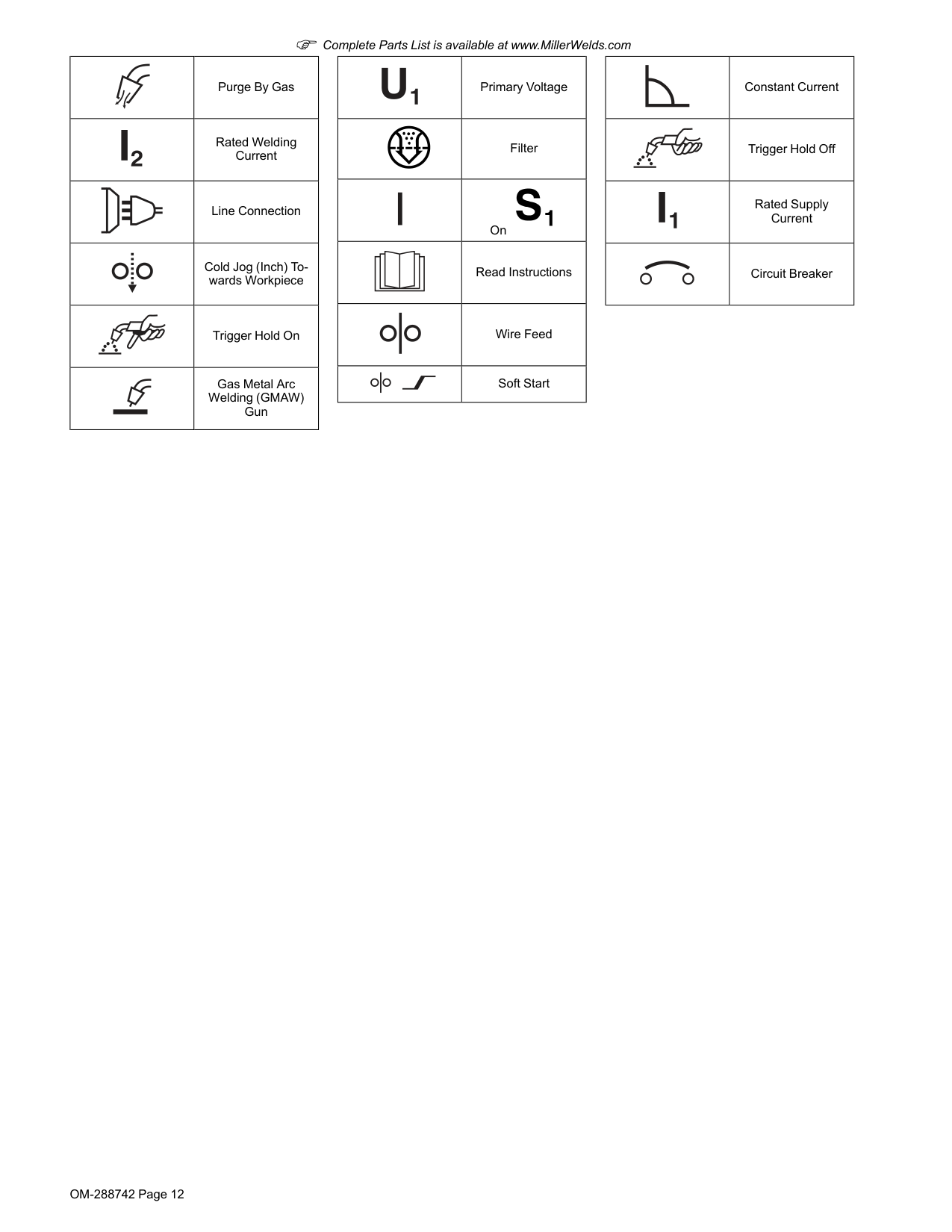 OM-288742 Page 12 F Complete Parts List is available at www.MillerWelds.com Purge By Gas Rated Welding Current Line Connection Cold Jog (Inch) To- wards Workpiece Trigger Hold On Gas Metal Arc Welding (GMAW) Gun Primary Voltage Filter On Read Instructions Wire Feed Soft Start Constant Current Trigger Hold Off Rated Supply Current Circuit Breaker