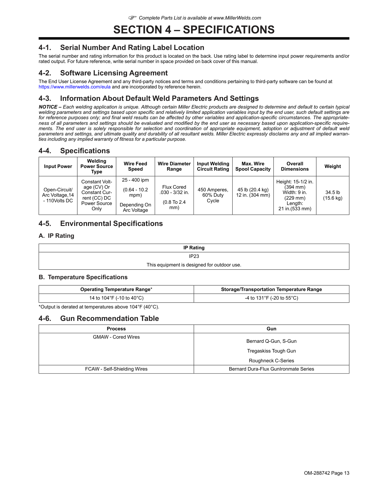 4-1. Serial Number And Rating Label Location The serial number and rating information for this product is located on the back. Use rating label to determine input power requirements and/or rated output. For future reference, write serial number in space provided on back cover of this manual. 4-2. Software Licensing Agreement The End User License Agreement and any third-party notices and terms and conditions pertaining to third-party software can be found at https://www.millerwelds.com/eula and are incorporated by reference herein. 4-3. Information About Default Weld Parameters And Settings NOTICE – Each welding application is unique. Although certain Miller Electric products are designed to determine and default to certain typical welding parameters and settings based upon specific and relatively limited application variables input by the end user, such default settings are for reference purposes only; and final weld results can be affected by other variables and application-specific circumstances. The appropriate- ness of all parameters and settings should be evaluated and modified by the end user as necessary based upon application-specific require- ments. The end user is solely responsible for selection and coordination of appropriate equipment, adoption or adjustment of default weld parameters and settings, and ultimate quality and durability of all resultant welds. Miller Electric expressly disclaims any and all implied warran- ties including any implied warranty of fitness for a particular purpose. 4-4. Specifications Input Power Welding Power Source Type Wire Feed Speed Wire Diameter Range Input Welding Circuit Rating Max. Wire Spool Capacity Overall Dimensions Weight Open-Circuit/ Arc Voltage,14Ip23