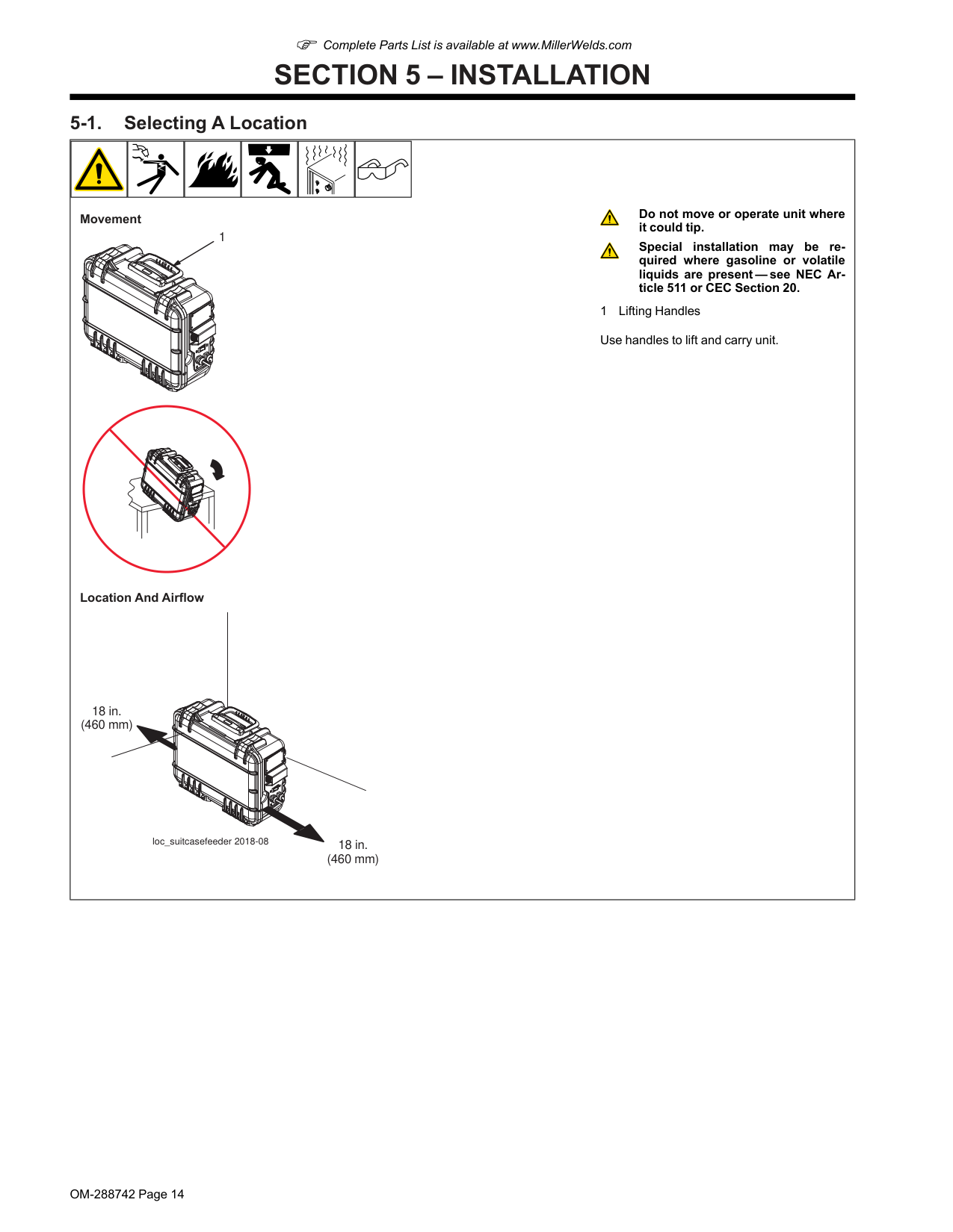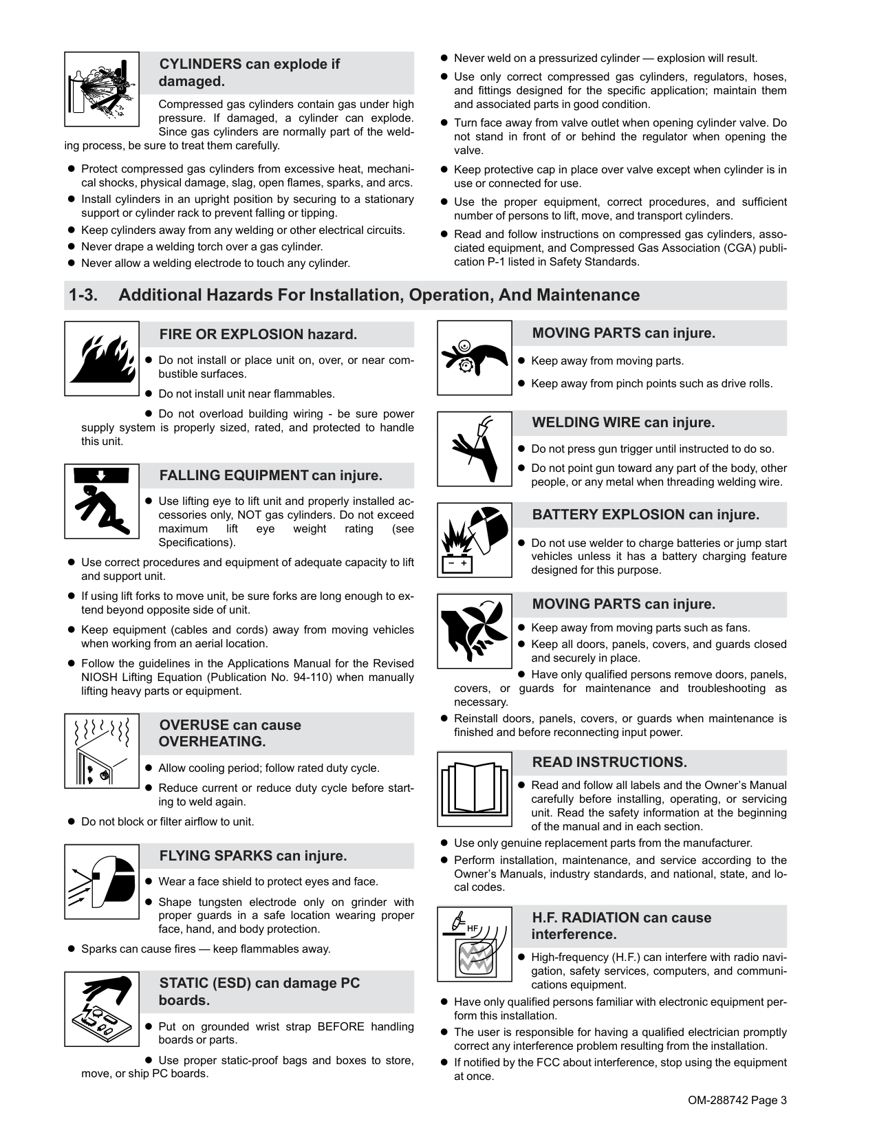 (EMF) can affect Implanted Medical Devices. l Wearers of Pacemakers and other Implanted Med- ical Devices should keep away. l Implanted Medical Device wearers should consult their doctor and the device manufacturer before going near arc welding, spot weld- ing, gouging, plasma arc cutting, or induction heating operations.OM-288742 Page 3 CYLINDERS can explode if damaged. Compressed gas cylinders contain gas under high pressure. If damaged, a cylinder can explode. Since gas cylinders are normally part of the weld- ing process, be sure to treat them carefully. l Protect compressed gas cylinders from excessive heat, mechani- cal shocks, physical damage, slag, open flames, sparks, and arcs. l Install cylinders in an upright position by securing to a stationary support or cylinder rack to prevent falling or tipping. l Keep cylinders away from any welding or other electrical circuits. l Never drape a welding torch over a gas cylinder. l Never allow a welding electrode to touch any cylinder. l Never weld on a pressurized cylinder — explosion will result. l Use only correct compressed gas cylinders, regulators, hoses, and fittings designed for the specific application; maintain them and associated parts in good condition. l Turn face away from valve outlet when opening cylinder valve. Do not stand in front of or behind the regulator when opening the valve. l Keep protective cap in place over valve except when cylinder is in use or connected for use. l Use the proper equipment, correct procedures, and sufficient number of persons to lift, move, and transport cylinders. l Read and follow instructions on compressed gas cylinders, asso- ciated equipment, and Compressed Gas Association (CGA) publi- cation P-1 listed in Safety Standards. 1-3. Additional Hazards For Installation, Operation, And Maintenance FIRE OR EXPLOSION hazard. l Do not install or place unit on, over, or near com- bustible surfaces. l Do not install unit near flammables. l Do not overload building wiring - be sure power supply system is properly sized, rated, and protected to handle this unit. FALLING EQUIPMENT can injure. l Use lifting eye to lift unit and properly installed ac- cessories only, NOT gas cylinders. Do not exceed maximum lift eye weight rating (see Specifications). l Use correct procedures and equipment of adequate capacity to lift and support unit. l If using lift forks to move unit, be sure forks are long enough to ex- tend beyond opposite side of unit. l Keep equipment (cables and cords) away from moving vehicles when working from an aerial location. l Follow the guidelines in the Applications Manual for the Revised NIOSH Lifting Equation (Publication No. 94-110) when manually lifting heavy parts or equipment. OVERUSE can cause