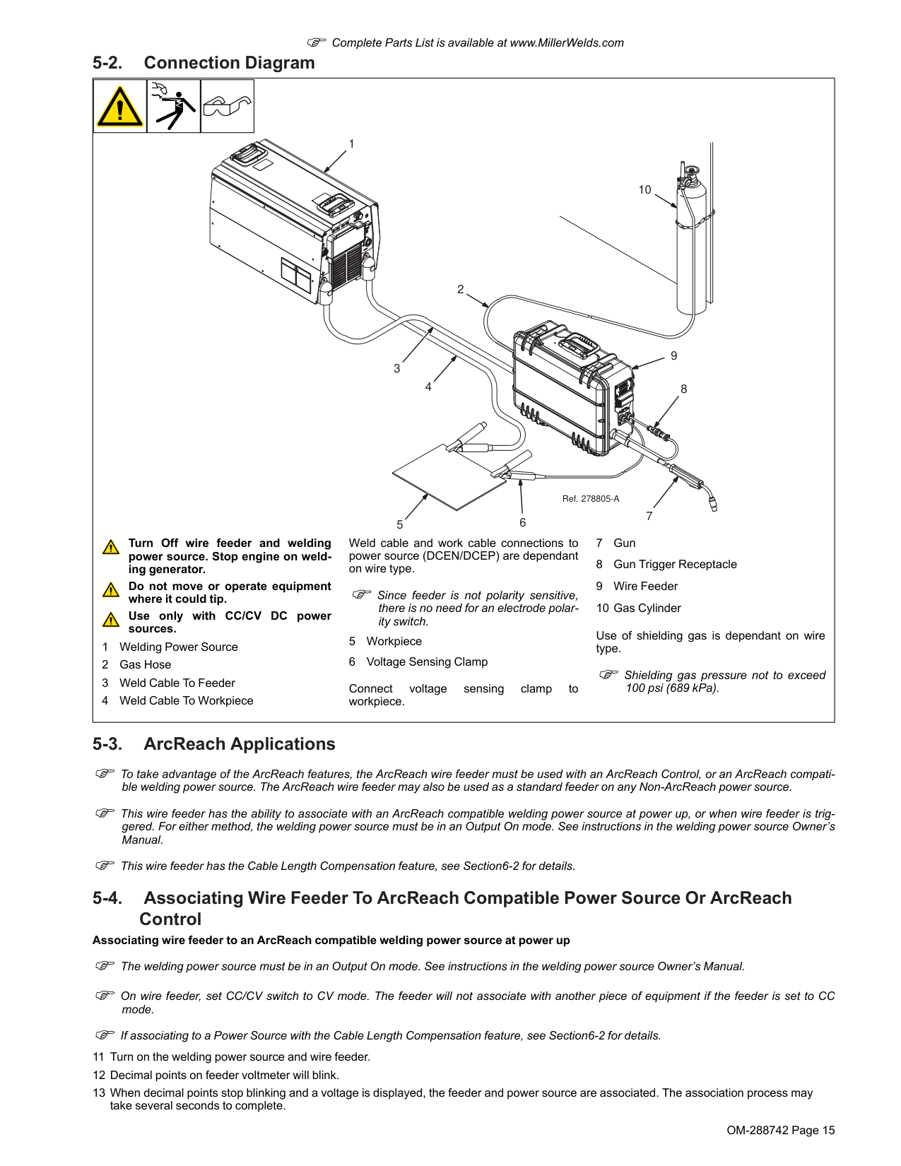5-1. Selecting A Location Movement 1 Location And Airflow 18 in. (460 mm) 18 in. (460 mm) loc_suitcasefeeder 2018-08 Do not move or operate unit where it could tip. Special installation may be re- quired where gasoline or volatile liquids are present — see NEC Ar- ticle 511 or CEC Section 20. 1 Lifting Handles Use handles to lift and carry unit.OM-288742 Page 15 F Complete Parts List is available at www.MillerWelds.com 5-2. Connection Diagram 4 5 9 2 10 7 8 6 1 3 Ref. 278805-A Turn Off wire feeder and welding power source. Stop engine on weld- ing generator. Do not move or operate equipment where it could tip. Use only with CC/CV DC power sources. 1 Welding Power Source 2 Gas Hose 3 Weld Cable To Feeder 4 Weld Cable To Workpiece Weld cable and work cable connections to power source (DCEN/DCEP) are dependant on wire type. F Since feeder is not polarity sensitive, there is no need for an electrode polar- ity switch. 5 Workpiece 6 Voltage Sensing Clamp Connect voltage sensing clamp to workpiece. 7 Gun 8 Gun Trigger Receptacle 9 Wire Feeder 10 Gas Cylinder Use of shielding gas is dependant on wire type. F Shielding gas pressure not to exceed 100 psi (689 kPa). 5-3. ArcReach Applications F To take advantage of the ArcReach features, the ArcReach wire feeder must be used with an ArcReach Control, or an ArcReach compati- ble welding power source. The ArcReach wire feeder may also be used as a standard feeder on any Non-ArcReach power source. F This wire feeder has the ability to associate with an ArcReach compatible welding power source at power up, or when wire feeder is trig- gered. For either method, the welding power source must be in an Output On mode. See instructions in the welding power source Owner’s Manual. F This wire feeder has the Cable Length Compensation feature, see Section6-2 for details. 5-4. Associating Wire Feeder To ArcReach Compatible Power Source Or ArcReach Control Associating wire feeder to an ArcReach compatible welding power source at power up F The welding power source must be in an Output On mode. See instructions in the welding power source Owner’s Manual. F On wire feeder, set CC/CV switch to CV mode. The feeder will not associate with another piece of equipment if the feeder is set to CC mode. F If associating to a Power Source with the Cable Length Compensation feature, see Section6-2 for details. 11 Turn on the welding power source and wire feeder. 12 Decimal points on feeder voltmeter will blink. 13 When decimal points stop blinking and a voltage is displayed, the feeder and power source are associated. The association process may take several seconds to complete.