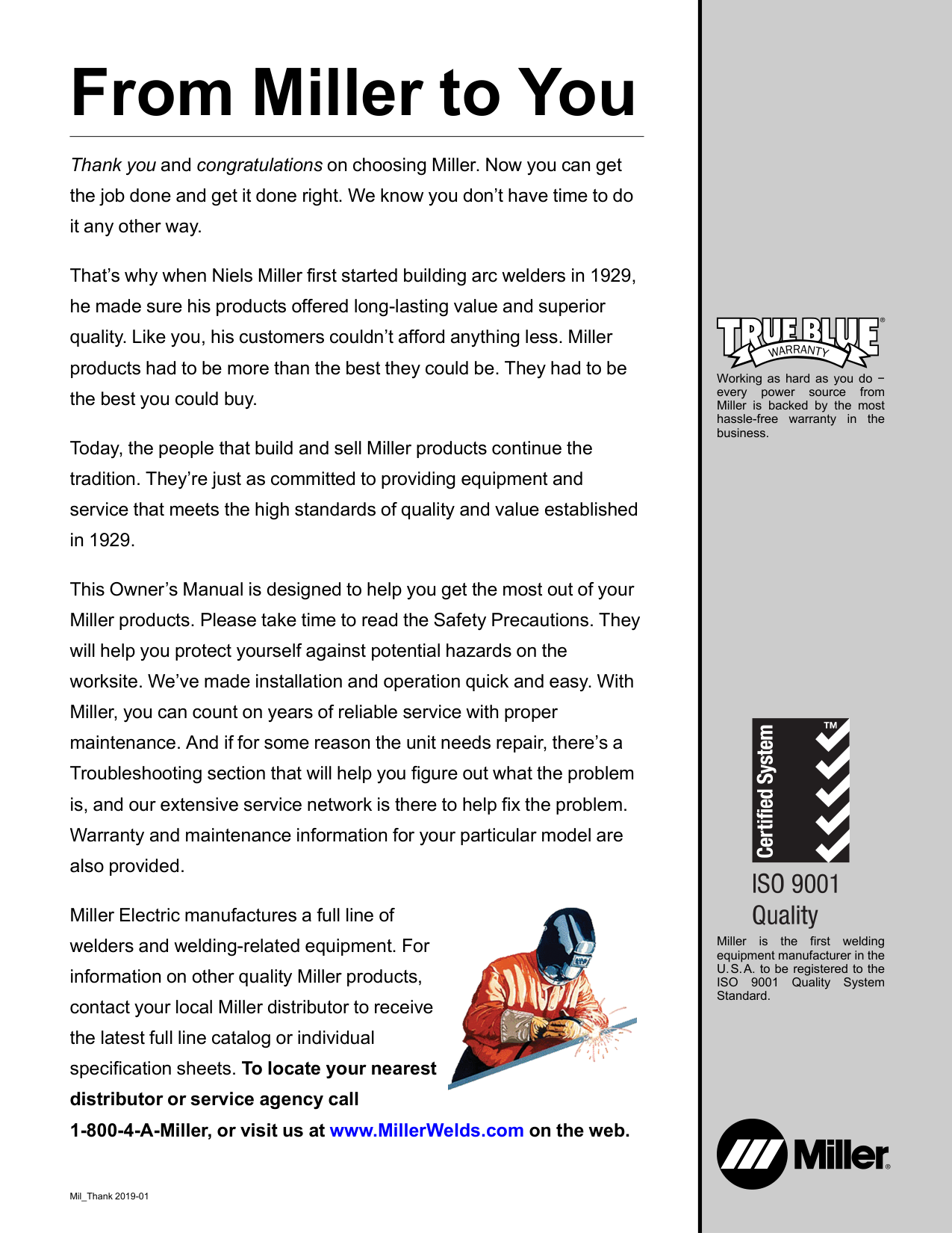 9001 Quality System Standard. Working as hard as you do − every power source from Miller is backed by the most hassle-free warranty in the business. Mil_Thank 2019-01 From Miller to You Thank you and congratulations on choosing Miller. Now you can get the job done and get it done right. We know you don’t have time to do it any other way. That’s why when Niels Miller first started building arc welders in 1929, he made sure his products offered long-lasting value and superior quality. Like you, his customers couldn’t afford anything less. Miller products had to be more than the best they could be. They had to be the best you could buy. Today, the people that build and sell Miller products continue the tradition. They’re just as committed to providing equipment and service that meets the high standards of quality and value established in 1929. This Owner’s Manual is designed to help you get the most out of your Miller products. Please take time to read the Safety Precautions. They will help you protect yourself against potential hazards on the worksite. We’ve made installation and operation quick and easy. With Miller, you can count on years of reliable service with proper maintenance. And if for some reason the unit needs repair, there’s a Troubleshooting section that will help you figure out what the problem is, and our extensive service network is there to help fix the problem. Warranty and maintenance information for your particular model are also provided. Miller Electric manufactures a full line of welders and welding-related equipment. For information on other quality Miller products, contact your local Miller distributor to receive the latest full line catalog or individual specification sheets. To locate your nearest distributor or service agency call 1-800-4-A-Miller, or visit us at www.MillerWelds.com on the web.Table Of Contents