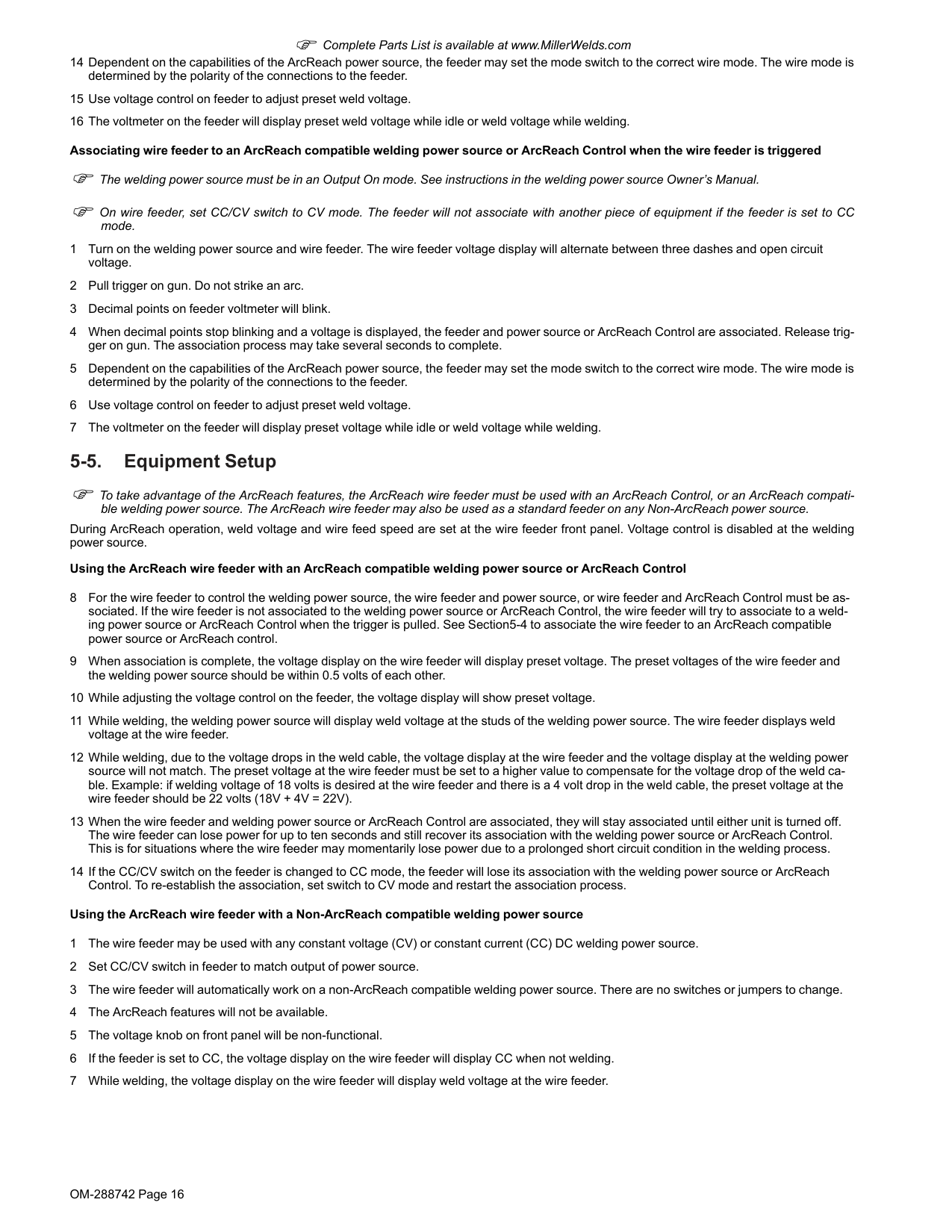 OM-288742 Page 16 F Complete Parts List is available at www.MillerWelds.com 14 Dependent on the capabilities of the ArcReach power source, the feeder may set the mode switch to the correct wire mode. The wire mode is determined by the polarity of the connections to the feeder. 15 Use voltage control on feeder to adjust preset weld voltage. 16 The voltmeter on the feeder will display preset weld voltage while idle or weld voltage while welding. Associating wire feeder to an ArcReach compatible welding power source or ArcReach Control when the wire feeder is triggered F The welding power source must be in an Output On mode. See instructions in the welding power source Owner’s Manual. F On wire feeder, set CC/CV switch to CV mode. The feeder will not associate with another piece of equipment if the feeder is set to CC mode. 1 Turn on the welding power source and wire feeder. The wire feeder voltage display will alternate between three dashes and open circuit voltage. 2 Pull trigger on gun. Do not strike an arc. 3 Decimal points on feeder voltmeter will blink. 4 When decimal points stop blinking and a voltage is displayed, the feeder and power source or ArcReach Control are associated. Release trig- ger on gun. The association process may take several seconds to complete. 5 Dependent on the capabilities of the ArcReach power source, the feeder may set the mode switch to the correct wire mode. The wire mode is determined by the polarity of the connections to the feeder. 6 Use voltage control on feeder to adjust preset weld voltage. 7 The voltmeter on the feeder will display preset voltage while idle or weld voltage while welding. 5-5. Equipment Setup F To take advantage of the ArcReach features, the ArcReach wire feeder must be used with an ArcReach Control, or an ArcReach compati- ble welding power source. The ArcReach wire feeder may also be used as a standard feeder on any Non-ArcReach power source. During ArcReach operation, weld voltage and wire feed speed are set at the wire feeder front panel. Voltage control is disabled at the welding power source. Using the ArcReach wire feeder with an ArcReach compatible welding power source or ArcReach Control 8 For the wire feeder to control the welding power source, the wire feeder and power source, or wire feeder and ArcReach Control must be as- sociated. If the wire feeder is not associated to the welding power source or ArcReach Control, the wire feeder will try to associate to a weld- ing power source or ArcReach Control when the trigger is pulled. See Section5-4 to associate the wire feeder to an ArcReach compatible power source or ArcReach control. 9 When association is complete, the voltage display on the wire feeder will display preset voltage. The preset voltages of the wire feeder and the welding power source should be within 0.5 volts of each other. 10 While adjusting the voltage control on the feeder, the voltage display will show preset voltage. 11 While welding, the welding power source will display weld voltage at the studs of the welding power source. The wire feeder displays weld voltage at the wire feeder. 12 While welding, due to the voltage drops in the weld cable, the voltage display at the wire feeder and the voltage display at the welding power source will not match. The preset voltage at the wire feeder must be set to a higher value to compensate for the voltage drop of the weld ca- ble. Example: if welding voltage of 18 volts is desired at the wire feeder and there is a 4 volt drop in the weld cable, the preset voltage at the wire feeder should be 22 volts (18V + 4V = 22V). 13 When the wire feeder and welding power source or ArcReach Control are associated, they will stay associated until either unit is turned off. The wire feeder can lose power for up to ten seconds and still recover its association with the welding power source or ArcReach Control. This is for situations where the wire feeder may momentarily lose power due to a prolonged short circuit condition in the welding process. 14 If the CC/CV switch on the feeder is changed to CC mode, the feeder will lose its association with the welding power source or ArcReach Control. To re-establish the association, set switch to CV mode and restart the association process. Using the ArcReach wire feeder with a Non-ArcReach compatible welding power source 1 The wire feeder may be used with any constant voltage (CV) or constant current (CC) DC welding power source. 2 Set CC/CV switch in feeder to match output of power source. 3 The wire feeder will automatically work on a non-ArcReach compatible welding power source. There are no switches or jumpers to change. 4 The ArcReach features will not be available. 5 The voltage knob on front panel will be non-functional. 6 If the feeder is set to CC, the voltage display on the wire feeder will display CC when not welding. 7 While welding, the voltage display on the wire feeder will display weld voltage at the wire feeder.