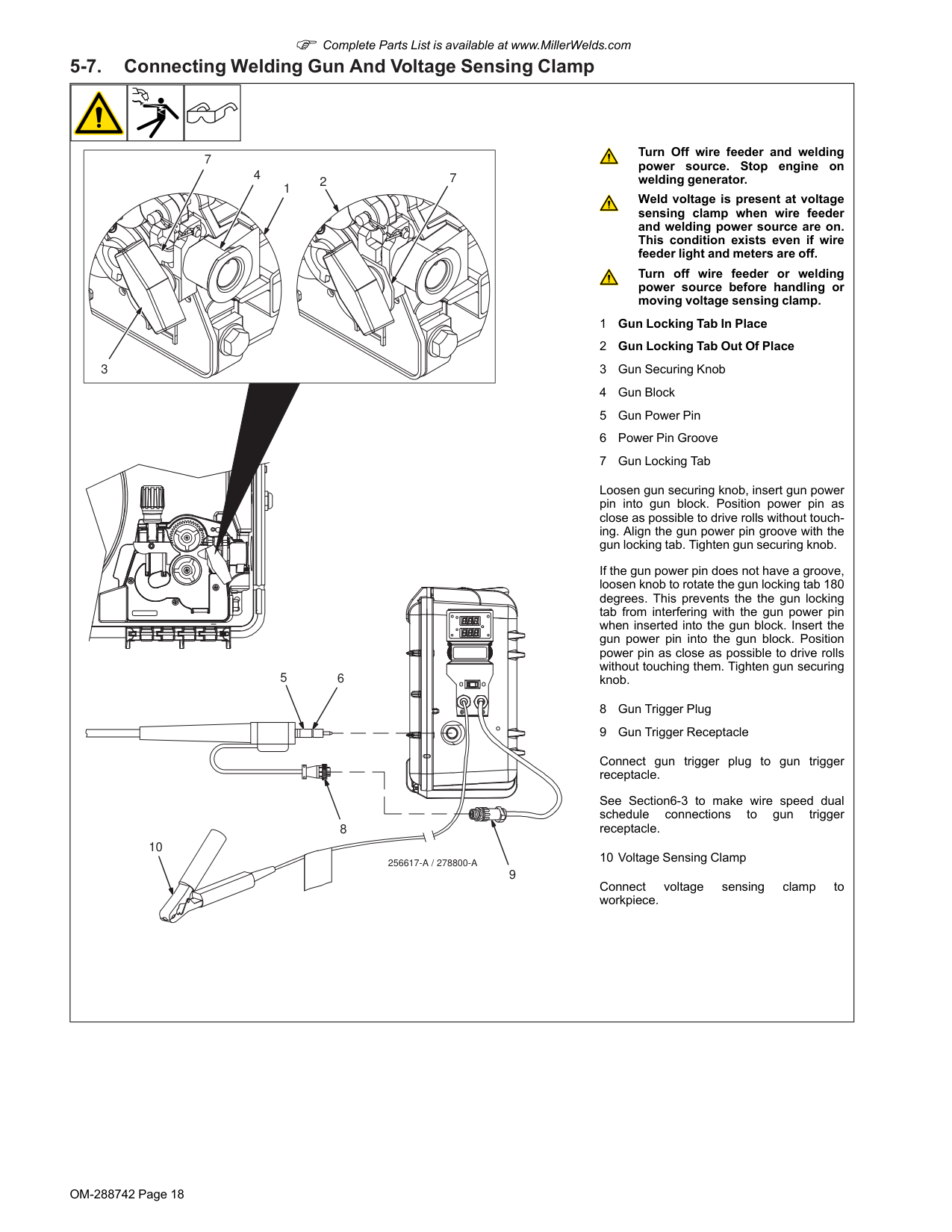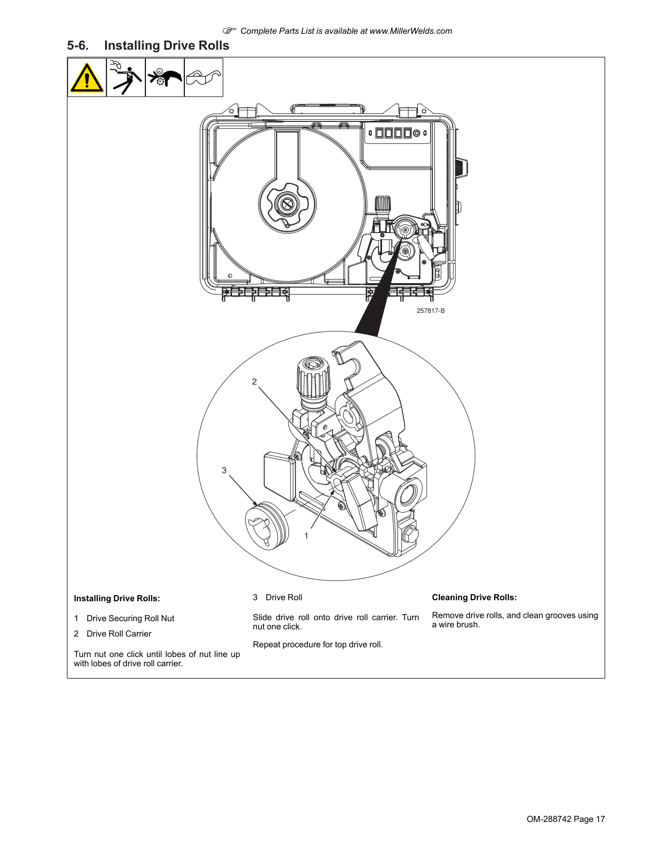 Installing Drive Rolls: 1 Drive Securing Roll Nut 2 Drive Roll Carrier Turn nut one click until lobes of nut line up with lobes of drive roll carrier. 3 Drive Roll Slide drive roll onto drive roll carrier. Turn nut one click. Repeat procedure for top drive roll. Cleaning Drive Rolls: Remove drive rolls, and clean grooves using a wire brush.OM-288742 Page 18 F Complete Parts List is available at www.MillerWelds.com 5-7. Connecting Welding Gun And Voltage Sensing Clamp