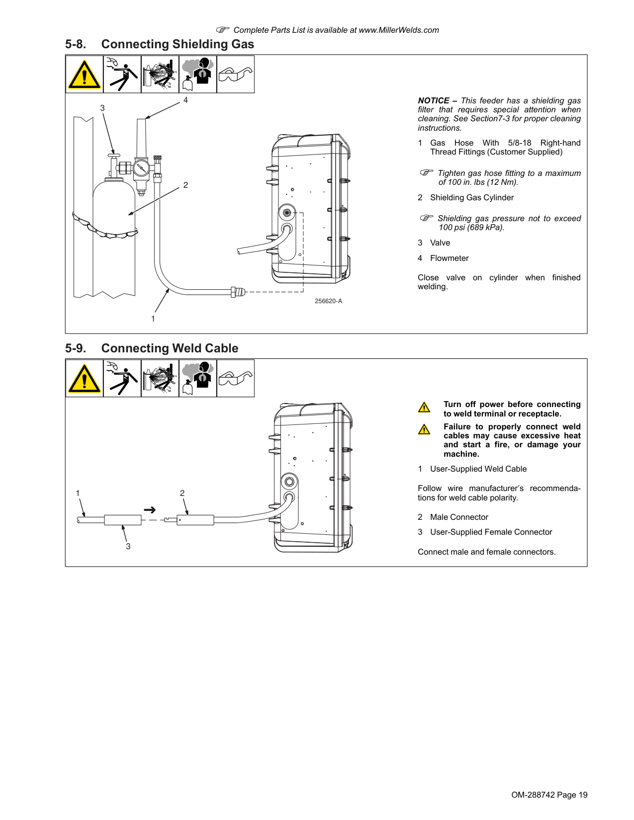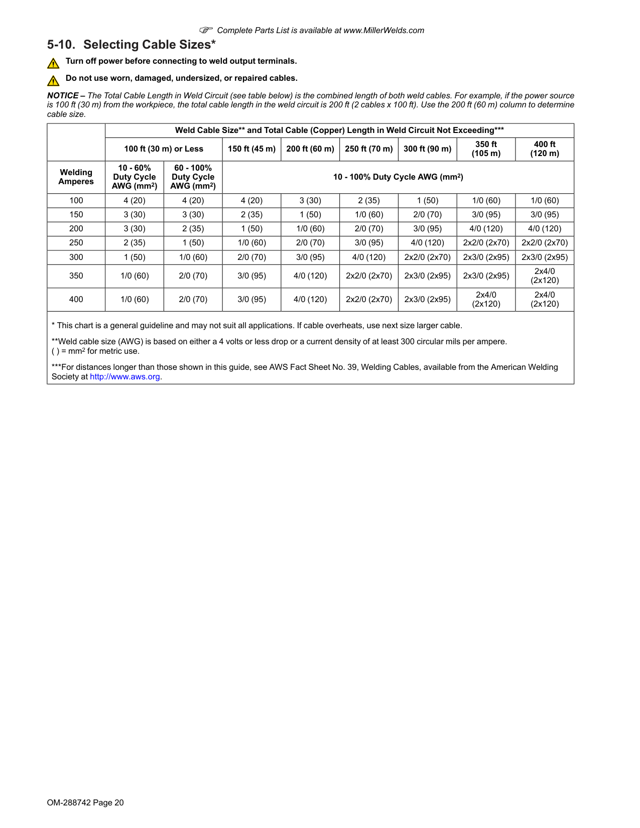 2 NOTICE – This feeder has a shielding gas filter that requires special attention when cleaning. See Section7-3 for proper cleaning instructions. 1 Gas Hose With 5/8-18 Right-hand Thread Fittings (Customer Supplied) F Tighten gas hose fitting to a maximum of 100 in. lbs (12 Nm). 2 Shielding Gas Cylinder F Shielding gas pressure not to exceed 100 psi (689 kPa). 3 Valve 4 Flowmeter Close valve on cylinder when finished welding. 5-9. Connecting Weld Cable 2 3 1 Turn off power before connecting to weld terminal or receptacle. Failure to properly connect weld cables may cause excessive heat and start a fire, or damage your machine. 1 User-Supplied Weld Cable Follow wire manufacturer’s recommenda- tions for weld cable polarity. 2 Male Connector 3 User-Supplied Female Connector Connect male and female connectors.OM-288742 Page 20 F Complete Parts List is available at www.MillerWelds.com 5-10. Selecting Cable Sizes* Turn off power before connecting to weld output terminals. Do not use worn, damaged, undersized, or repaired cables. NOTICE – The Total Cable Length in Weld Circuit (see table below) is the combined length of both weld cables. For example, if the power source is 100 ft (30 m) from the workpiece, the total cable length in the weld circuit is 200 ft (2 cables x 100 ft). Use the 200 ft (60 m) column to determine cable size. Weld Cable Size and Total Cable (Copper) Length in Weld Circuit Not Exceeding* 100 ft (30 m) or Less 150 ft (45 m) 200 ft (60 m) 250 ft (70 m) 300 ft (90 m) 350 ft (105 m) 400 ft (120 m) Welding Amperes 10 - 60% Duty Cycle AWG (mm2) 60 - 100% Duty Cycle AWG (mm2) 10 - 100% Duty Cycle AWG (mm2) 100 4 (20) 4 (20) 4 (20) 3 (30) 2 (35) 1 (50) 1/0 (60) 1/0 (60) 150 3 (30) 3 (30) 2 (35) 1 (50) 1/0 (60) 2/0 (70) 3/0 (95) 3/0 (95) 200 3 (30) 2 (35) 1 (50) 1/0 (60) 2/0 (70) 3/0 (95) 4/0 (120) 4/0 (120) 250 2 (35) 1 (50) 1/0 (60) 2/0 (70) 3/0 (95) 4/0 (120) 2x2/0 (2x70) 2x2/0 (2x70) 300 1 (50) 1/0 (60) 2/0 (70) 3/0 (95) 4/0 (120) 2x2/0 (2x70) 2x3/0 (2x95) 2x3/0 (2x95) 350 1/0 (60) 2/0 (70) 3/0 (95) 4/0 (120) 2x2/0 (2x70) 2x3/0 (2x95) 2x3/0 (2x95) 2x4/0 (2x120) 400 1/0 (60) 2/0 (70) 3/0 (95) 4/0 (120) 2x2/0 (2x70) 2x3/0 (2x95) 2x4/0 (2x120) 2x4/0 (2x120)