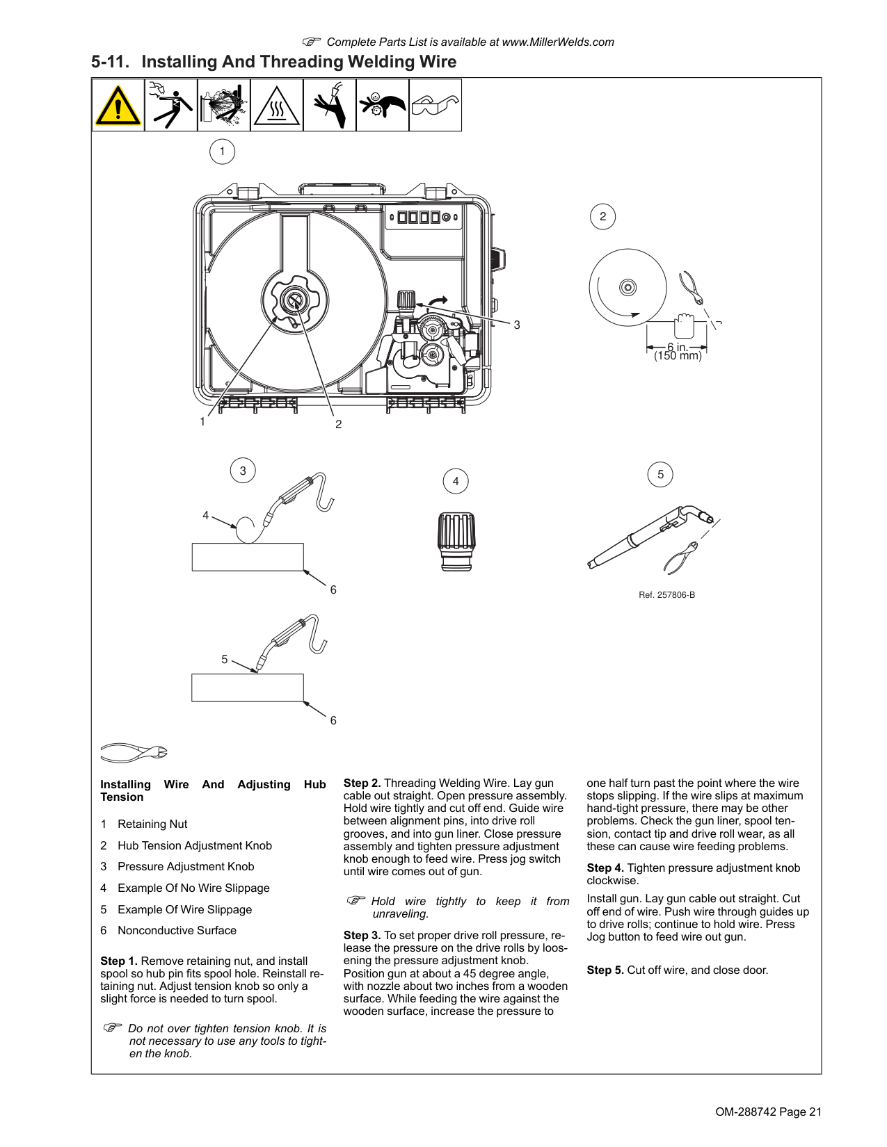 OM-288742 Page 21 F Complete Parts List is available at www.MillerWelds.com 5-11. Installing And Threading Welding Wire 1 2 3 6 in. (150 mm) 4 5 6 6 2 1 3 5 4 Ref. 257806-B Installing Wire And Adjusting Hub Tension 1 Retaining Nut 2 Hub Tension Adjustment Knob 3 Pressure Adjustment Knob 4 Example Of No Wire Slippage 5 Example Of Wire Slippage 6 Nonconductive Surface Step 1. Remove retaining nut, and install spool so hub pin fits spool hole. Reinstall re- taining nut. Adjust tension knob so only a slight force is needed to turn spool. F Do not over tighten tension knob. It is not necessary to use any tools to tight- en the knob. Step 2. Threading Welding Wire. Lay gun cable out straight. Open pressure assembly. Hold wire tightly and cut off end. Guide wire between alignment pins, into drive roll grooves, and into gun liner. Close pressure assembly and tighten pressure adjustment knob enough to feed wire. Press jog switch until wire comes out of gun. F Hold wire tightly to keep it from unraveling. Step 3. To set proper drive roll pressure, re- lease the pressure on the drive rolls by loos- ening the pressure adjustment knob. Position gun at about a 45 degree angle, with nozzle about two inches from a wooden surface. While feeding the wire against the wooden surface, increase the pressure to one half turn past the point where the wire stops slipping. If the wire slips at maximum hand-tight pressure, there may be other problems. Check the gun liner, spool ten- sion, contact tip and drive roll wear, as all these can cause wire feeding problems. Step 4. Tighten pressure adjustment knob clockwise. Install gun. Lay gun cable out straight. Cut off end of wire. Push wire through guides up to drive rolls; continue to hold wire. Press Jog button to feed wire out gun. Step 5. Cut off wire, and close door.