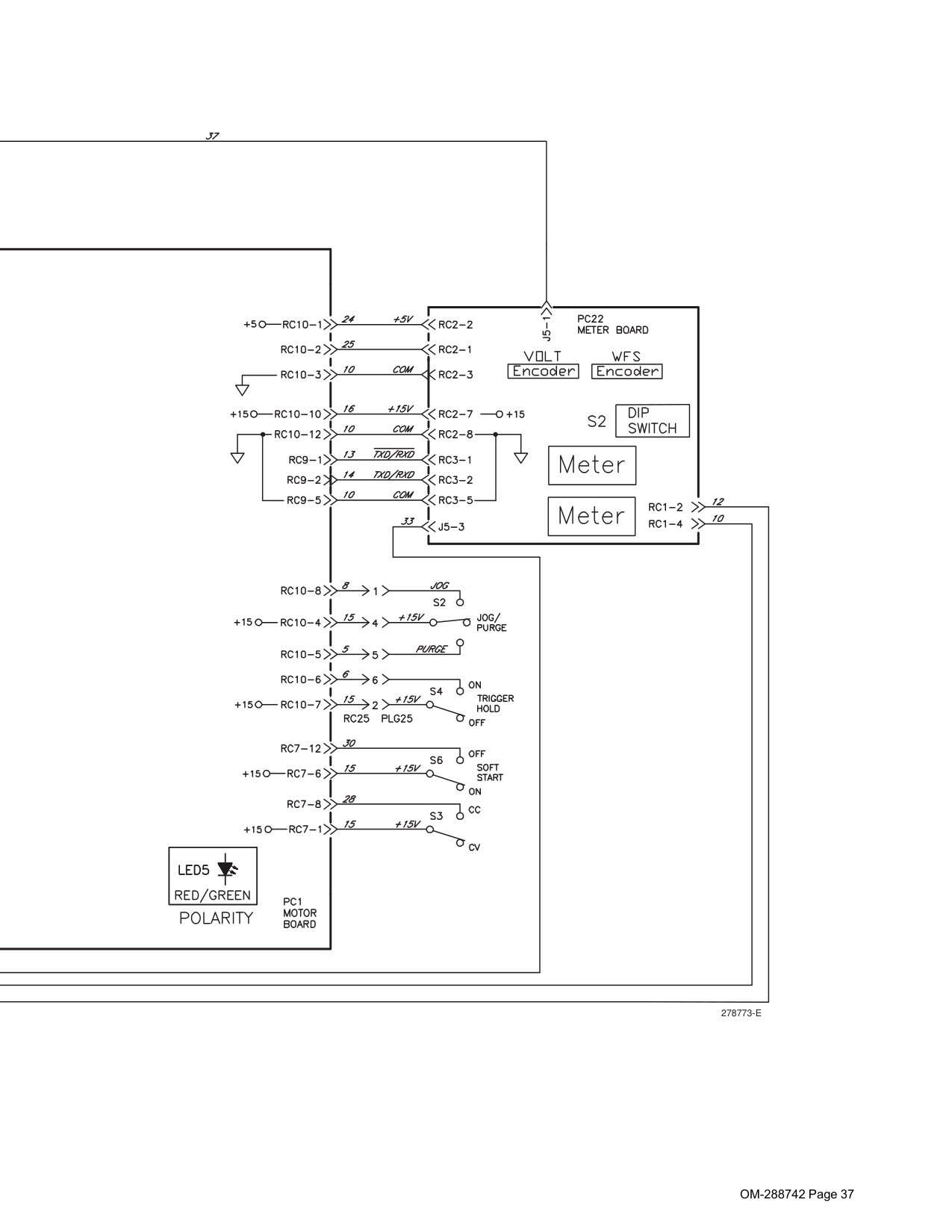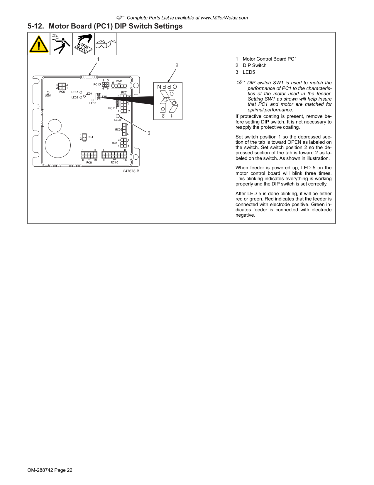 F DIP switch SW1 is used to match the performance of PC1 to the characteris- tics of the motor used in the feeder. Setting SW1 as shown will help insure that PC1 and motor are matched for optimal performance. If protective coating is present, remove be- fore setting DIP switch. It is not necessary to reapply the protective coating. Set switch position 1 so the depressed sec- tion of the tab is toward OPEN as labeled on the switch. Set switch position 2 so the de- pressed section of the tab is toward 2 as la- beled on the switch. As shown in illustration. When feeder is powered up, LED 5 on the motor control board will blink three times. This blinking indicates everything is working properly and the DIP switch is set correctly. After LED 5 is done blinking, it will be either red or green. Red indicates that the feeder is connected with electrode positive. Green in- dicates feeder is connected with electrode negative.OM-288742 Page 24 F Complete Parts List is available at www.MillerWelds.com 5-13. Meter Board (PC22) DIP Switch Settings 4 3 1 2 3 4 5