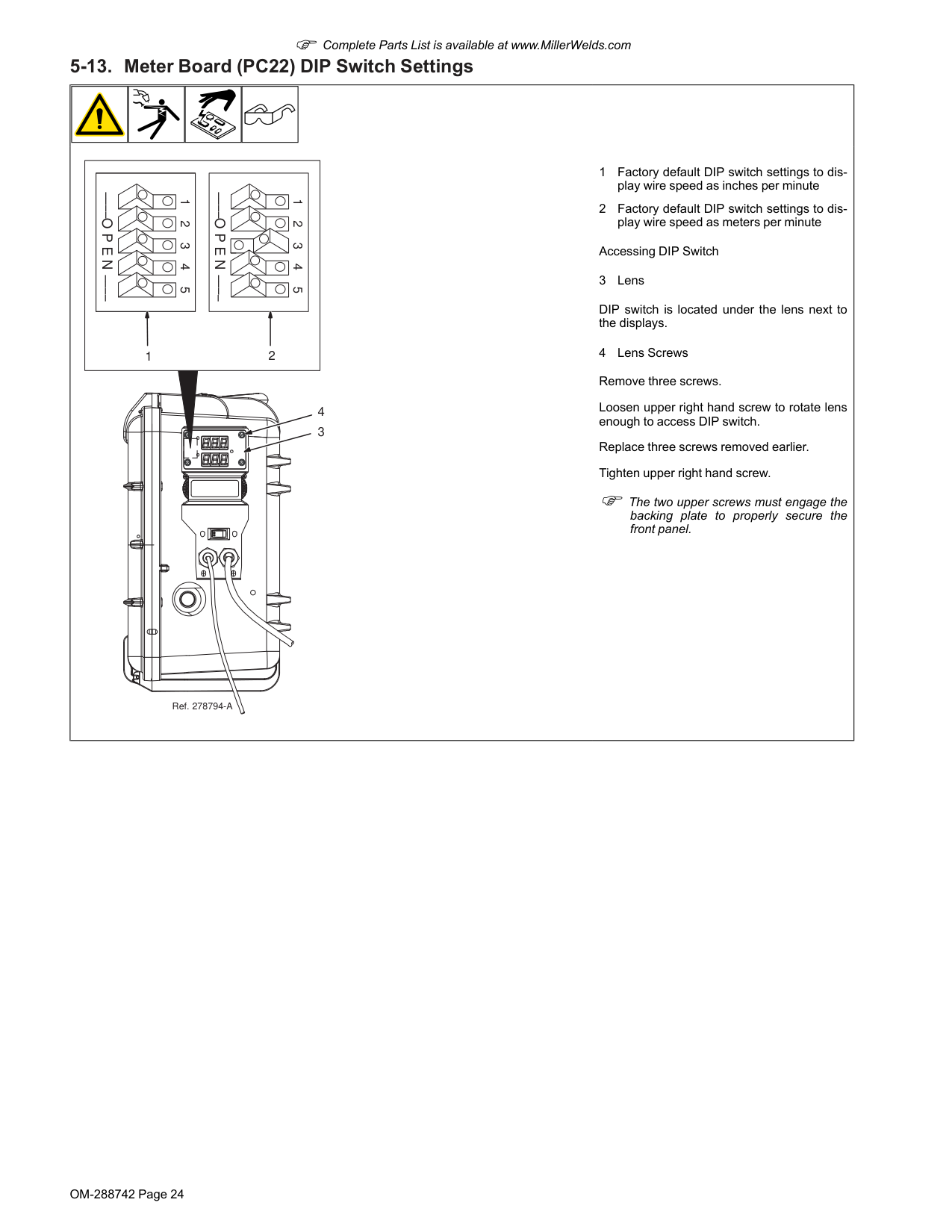 1 2 Ref. 278794-A 1 Factory default DIP switch settings to dis- play wire speed as inches per minute 2 Factory default DIP switch settings to dis- play wire speed as meters per minute Accessing DIP Switch 3 Lens DIP switch is located under the lens next to the displays. 4 Lens Screws Remove three screws. Loosen upper right hand screw to rotate lens enough to access DIP switch. Replace three screws removed earlier. Tighten upper right hand screw. F The two upper screws must engage the backing plate to properly secure the front panel.OM-288742 Page 25 F Complete Parts List is available at www.MillerWelds.com DIP Switch Settings 1 2 3 4 5