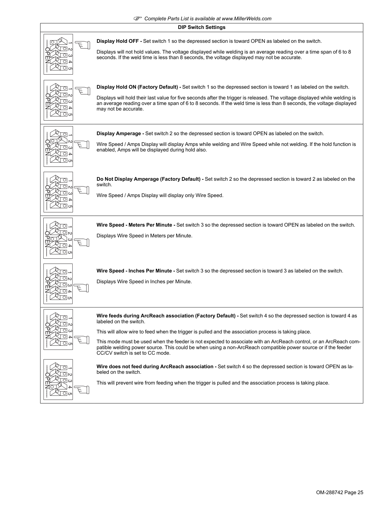 Wire does not feed during ArcReach association - Set switch 4 so the depressed section is toward OPEN as la- beled on the switch. This will prevent wire from feeding when the trigger is pulled and the association process is taking place.OM-288742 Page 26 F Complete Parts List is available at www.MillerWelds.com DIP Switch Settings 1 2 3 4 5