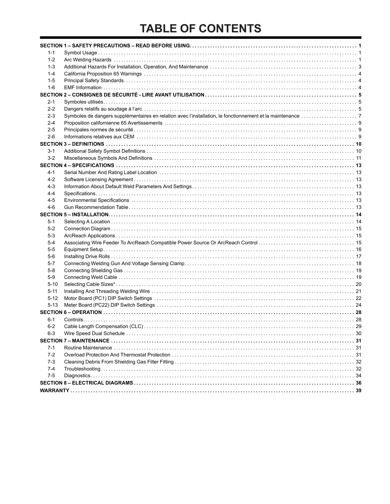 SECTION 1 – SAFETY PRECAUTIONS – READ BEFORE USING. . . . . . . . . . . . . . . . . . . . . . . . . . . . . . . . . . . . . . . . . . . . . . . . . . . . . . . . . . . . . . . . . . 1 1-1 Symbol Usage . . . . . . . . . . . . . . . . . . . . . . . . . . . . . . . . . . . . . . . . . . . . . . . . . . . . . . . . . . . . . . . . . . . . . . . . . . . . . . . . . . . . . . . . . . . . . . . . . . . . . . 1 1-2 Arc Welding Hazards . . . . . . . . . . . . . . . . . . . . . . . . . . . . . . . . . . . . . . . . . . . . . . . . . . . . . . . . . . . . . . . . . . . . . . . . . . . . . . . . . . . . . . . . . . . . . . . . 1 1-3 Additional Hazards For Installation, Operation, And Maintenance . . . . . . . . . . . . . . . . . . . . . . . . . . . . . . . . . . . . . . . . . . . . . . . . . . . . . . . . . . 3 1-4 California Proposition 65 Warnings . . . . . . . . . . . . . . . . . . . . . . . . . . . . . . . . . . . . . . . . . . . . . . . . . . . . . . . . . . . . . . . . . . . . . . . . . . . . . . . . . . . . 4 1-5 Principal Safety Standards. . . . . . . . . . . . . . . . . . . . . . . . . . . . . . . . . . . . . . . . . . . . . . . . . . . . . . . . . . . . . . . . . . . . . . . . . . . . . . . . . . . . . . . . . . . . 4 1-6 EMF Information . . . . . . . . . . . . . . . . . . . . . . . . . . . . . . . . . . . . . . . . . . . . . . . . . . . . . . . . . . . . . . . . . . . . . . . . . . . . . . . . . . . . . . . . . . . . . . . . . . . . 4 SECTION 2 – CONSIGNES DE SÉCURITÉ - LIRE AVANT UTILISATION. . . . . . . . . . . . . . . . . . . . . . . . . . . . . . . . . . . . . . . . . . . . . . . . . . . . . . . . . . . . 5 2-1 Symboles utilisés. . . . . . . . . . . . . . . . . . . . . . . . . . . . . . . . . . . . . . . . . . . . . . . . . . . . . . . . . . . . . . . . . . . . . . . . . . . . . . . . . . . . . . . . . . . . . . . . . . . . 5 2-2 Dangers relatifs au soudage à l’arc . . . . . . . . . . . . . . . . . . . . . . . . . . . . . . . . . . . . . . . . . . . . . . . . . . . . . . . . . . . . . . . . . . . . . . . . . . . . . . . . . . . . 5 2-3 Symboles de dangers supplémentaires en relation avec l’installation, le fonctionnement et la maintenance . . . . . . . . . . . . . . . . . . . . . . 7 2-4 Proposition californienne 65 Avertissements . . . . . . . . . . . . . . . . . . . . . . . . . . . . . . . . . . . . . . . . . . . . . . . . . . . . . . . . . . . . . . . . . . . . . . . . . . . . 9 2-5 Principales normes de sécurité . . . . . . . . . . . . . . . . . . . . . . . . . . . . . . . . . . . . . . . . . . . . . . . . . . . . . . . . . . . . . . . . . . . . . . . . . . . . . . . . . . . . . . . . 9 2-6 Informations relatives aux CEM . . . . . . . . . . . . . . . . . . . . . . . . . . . . . . . . . . . . . . . . . . . . . . . . . . . . . . . . . . . . . . . . . . . . . . . . . . . . . . . . . . . . . . . 9 SECTION 3 – DEFINITIONS . . . . . . . . . . . . . . . . . . . . . . . . . . . . . . . . . . . . . . . . . . . . . . . . . . . . . . . . . . . . . . . . . . . . . . . . . . . . . . . . . . . . . . . . . . . . . . . . . . 10 3-1 Additional Safety Symbol Definitions . . . . . . . . . . . . . . . . . . . . . . . . . . . . . . . . . . . . . . . . . . . . . . . . . . . . . . . . . . . . . . . . . . . . . . . . . . . . . . . . . . 10 3-2 Miscellaneous Symbols And Definitions . . . . . . . . . . . . . . . . . . . . . . . . . . . . . . . . . . . . . . . . . . . . . . . . . . . . . . . . . . . . . . . . . . . . . . . . . . . . . . . 11 SECTION 4 – SPECIFICATIONS . . . . . . . . . . . . . . . . . . . . . . . . . . . . . . . . . . . . . . . . . . . . . . . . . . . . . . . . . . . . . . . . . . . . . . . . . . . . . . . . . . . . . . . . . . . . . . 13 4-1 Serial Number And Rating Label Location . . . . . . . . . . . . . . . . . . . . . . . . . . . . . . . . . . . . . . . . . . . . . . . . . . . . . . . . . . . . . . . . . . . . . . . . . . . . . 13 4-2 Software Licensing Agreement . . . . . . . . . . . . . . . . . . . . . . . . . . . . . . . . . . . . . . . . . . . . . . . . . . . . . . . . . . . . . . . . . . . . . . . . . . . . . . . . . . . . . . . 13 4-3 Information About Default Weld Parameters And Settings. . . . . . . . . . . . . . . . . . . . . . . . . . . . . . . . . . . . . . . . . . . . . . . . . . . . . . . . . . . . . . . . 13 4-4 Specifications. . . . . . . . . . . . . . . . . . . . . . . . . . . . . . . . . . . . . . . . . . . . . . . . . . . . . . . . . . . . . . . . . . . . . . . . . . . . . . . . . . . . . . . . . . . . . . . . . . . . . . 13 4-5 Environmental Specifications . . . . . . . . . . . . . . . . . . . . . . . . . . . . . . . . . . . . . . . . . . . . . . . . . . . . . . . . . . . . . . . . . . . . . . . . . . . . . . . . . . . . . . . . 13 4-6 Gun Recommendation Table. . . . . . . . . . . . . . . . . . . . . . . . . . . . . . . . . . . . . . . . . . . . . . . . . . . . . . . . . . . . . . . . . . . . . . . . . . . . . . . . . . . . . . . . . 13 SECTION 5 – INSTALLATION. . . . . . . . . . . . . . . . . . . . . . . . . . . . . . . . . . . . . . . . . . . . . . . . . . . . . . . . . . . . . . . . . . . . . . . . . . . . . . . . . . . . . . . . . . . . . . . . . 14 5-1 Selecting A Location . . . . . . . . . . . . . . . . . . . . . . . . . . . . . . . . . . . . . . . . . . . . . . . . . . . . . . . . . . . . . . . . . . . . . . . . . . . . . . . . . . . . . . . . . . . . . . . . 14 5-2 Connection Diagram . . . . . . . . . . . . . . . . . . . . . . . . . . . . . . . . . . . . . . . . . . . . . . . . . . . . . . . . . . . . . . . . . . . . . . . . . . . . . . . . . . . . . . . . . . . . . . . . 15 5-3 ArcReach Applications . . . . . . . . . . . . . . . . . . . . . . . . . . . . . . . . . . . . . . . . . . . . . . . . . . . . . . . . . . . . . . . . . . . . . . . . . . . . . . . . . . . . . . . . . . . . . . 15 5-4 Associating Wire Feeder To ArcReach Compatible Power Source Or ArcReach Control . . . . . . . . . . . . . . . . . . . . . . . . . . . . . . . . . .