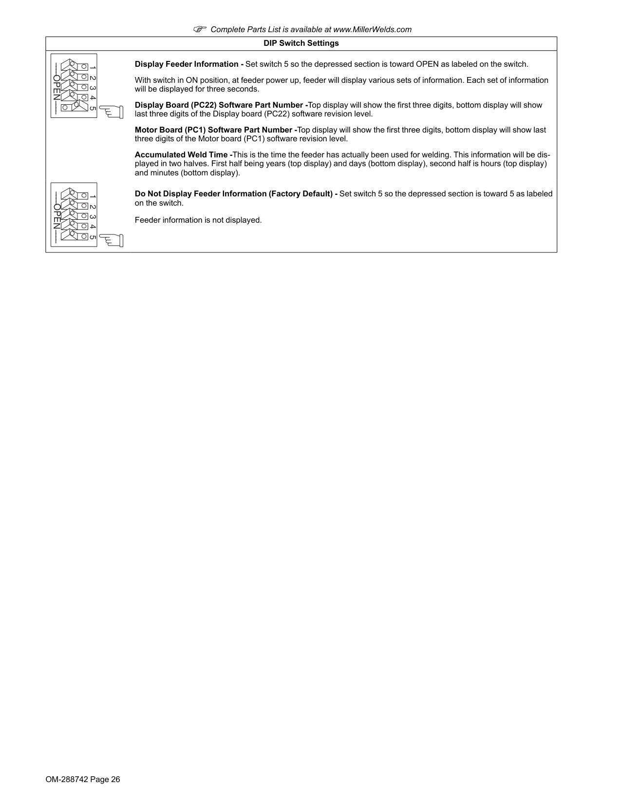 Do Not Display Feeder Information (Factory Default) - Set switch 5 so the depressed section is toward 5 as labeled on the switch. Feeder information is not displayed.OM-288742 Page 28 F Complete Parts List is available at www.MillerWelds.com