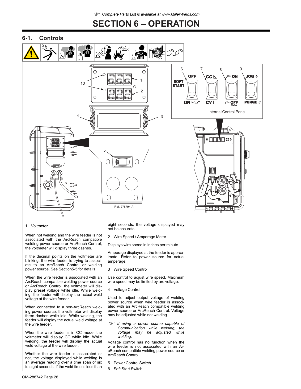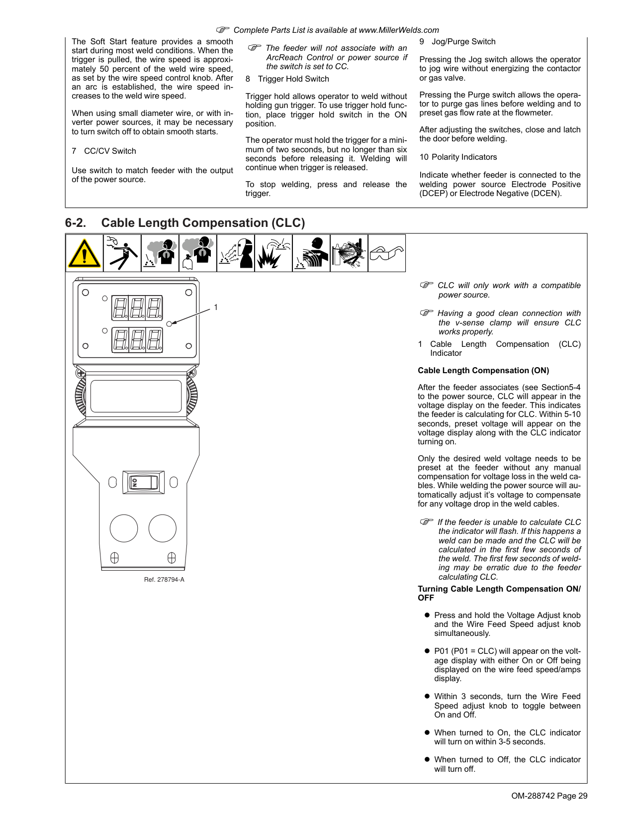 6-1. Controls 9 8 7 6 Ref. 278794-A Internal Control Panel 5 2 1 4 3 10 1 Voltmeter When not welding and the wire feeder is not associated with the ArcReach compatible welding power source or ArcReach Control, the voltmeter will display three dashes. If the decimal points on the voltmeter are blinking, the wire feeder is trying to associ- ate to an ArcReach Control or welding power source. See Section5-5 for details. When the wire feeder is associated with an ArcReach compatible welding power source or ArcReach Control, the voltmeter will dis- play preset voltage while idle. While weld- ing, the feeder will display the actual weld voltage at the wire feeder. When connected to a non-ArcReach weld- ing power source, the voltmeter will display three dashes while idle. While welding, the feeder will display the actual weld voltage at the wire feeder. When the wire feeder is in CC mode, the voltmeter will display CC while idle. While welding, the feeder will display the actual weld voltage at the wire feeder. Whether the wire feeder is associated or not, the voltage displayed while welding is an average reading over a time span of six to eight seconds. If the weld time is less than eight seconds, the voltage displayed may not be accurate. 2 Wire Speed / Amperage Meter Displays wire speed in inches per minute. Amperage displayed at the feeder is approx- imate. Refer to power source for actual amperage. 3 Wire Speed Control Use control to adjust wire speed. Maximum wire speed may be limited by arc voltage. 4 Voltage Control Used to adjust output voltage of welding power source when wire feeder is associ- ated with an ArcReach compatible welding power source or ArcReach Control. Voltage may be adjusted while not welding. F If using a power source capable of Communication while welding, the voltage may be adjusted while welding. Voltage control has no function when the wire feeder is not associated with an Ar- cReach compatible welding power source or ArcReach Control. 5 Power Control Switch 6 Soft Start SwitchOM-288742 Page 29 F Complete Parts List is available at www.MillerWelds.com The Soft Start feature provides a smooth start during most weld conditions. When the trigger is pulled, the wire speed is approxi- mately 50 percent of the weld wire speed, as set by the wire speed control knob. After an arc is established, the wire speed in- creases to the weld wire speed. When using small diameter wire, or with in- verter power sources, it may be necessary to turn switch off to obtain smooth starts. 7 CC/CV Switch Use switch to match feeder with the output of the power source. F The feeder will not associate with an ArcReach Control or power source if the switch is set to CC. 8 Trigger Hold Switch Trigger hold allows operator to weld without holding gun trigger. To use trigger hold func- tion, place trigger hold switch in the ON position. The operator must hold the trigger for a mini- mum of two seconds, but no longer than six seconds before releasing it. Welding will continue when trigger is released. To stop welding, press and release the trigger. 9 Jog/Purge Switch Pressing the Jog switch allows the operator to jog wire without energizing the contactor or gas valve. Pressing the Purge switch allows the opera- tor to purge gas lines before welding and to preset gas flow rate at the flowmeter. After adjusting the switches, close and latch the door before welding. 10 Polarity Indicators Indicate whether feeder is connected to the welding power source Electrode Positive (DCEP) or Electrode Negative (DCEN). 6-2. Cable Length Compensation (CLC) 1 Ref. 278794-A F CLC will only work with a compatible power source. F Having a good clean connection with the v-sense clamp will ensure CLC works properly. 1 Cable Length Compensation