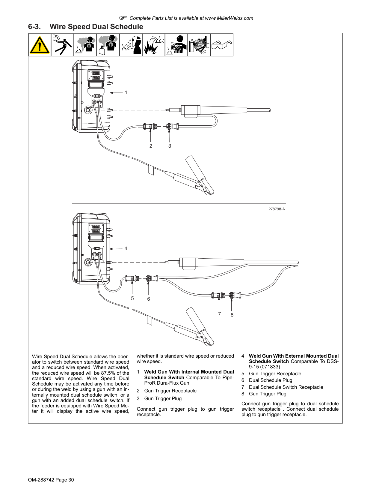 Wire Speed Dual Schedule allows the oper- ator to switch between standard wire speed and a reduced wire speed. When activated, the reduced wire speed will be 87.5% of the standard wire speed. Wire Speed Dual Schedule may be activated any time before or during the weld by using a gun with an in- ternally mounted dual schedule switch, or a gun with an added dual schedule switch. If the feeder is equipped with Wire Speed Me- ter it will display the active wire speed, whether it is standard wire speed or reduced wire speed. 1 Weld Gun With Internal Mounted Dual Schedule Switch Comparable To Pipe- ProR Dura-Flux Gun. 2 Gun Trigger Receptacle 3 Gun Trigger Plug Connect gun trigger plug to gun trigger receptacle. 4 Weld Gun With External Mounted Dual Schedule Switch Comparable To DSS- 9-15 (071833) 5 Gun Trigger Receptacle 6 Dual Schedule Plug 7 Dual Schedule Switch Receptacle 8 Gun Trigger Plug Connect gun trigger plug to dual schedule switch receptacle . Connect dual schedule plug to gun trigger receptacle.OM-288742 Page 31 F Complete Parts List is available at www.MillerWelds.com