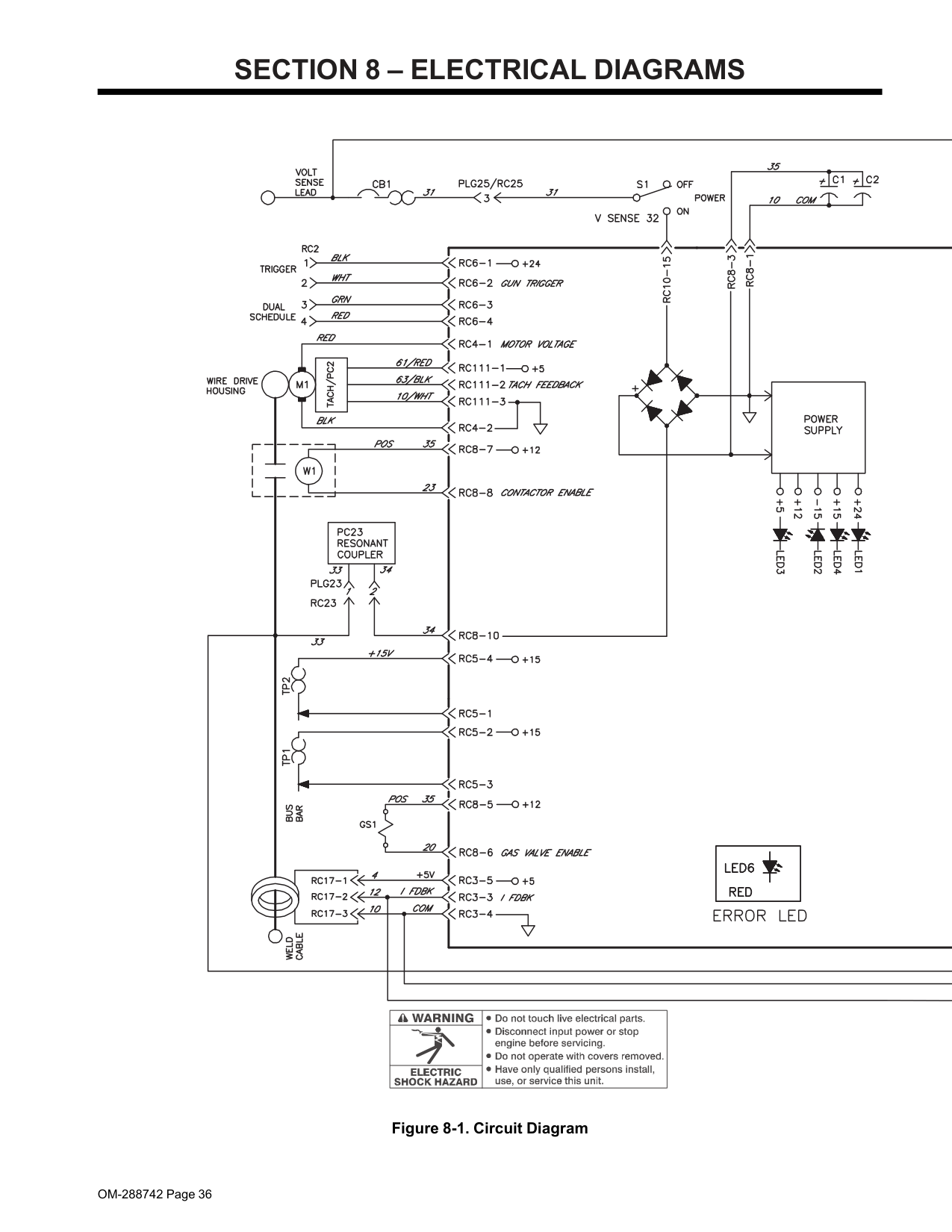 OM-288742 Page 33 F Complete Parts List is available at www.MillerWelds.com Check that DIP switches on Motor Control Board (PC 1) are set correctly (see section 5-13) Check and replace contact tip or liner if necessary (see gun Owner’s Manual). Have Factory Authorized Service Agent check Control board PC1. Unit does not switch out of Soft Start. Check transducer HD1 and connections, and replace if necessary. Wire feeds when Jog switch is pressed but not when gun trigger is pressed. Check gun trigger connection at wire feeder. Check gun trigger leads and trigger switch. See gun Owner’s Manual. Have Factory Authorized Service Agent check Control board PC1. Check DIP switch settings on Meter Board PC22 (see section 5-13) Wire stubbing on low end using a con- stant current power source or feeder resets. Ensure that CC/CV switch in feeder is in CC position (see Section 6-1). Increase power source inductance setting if available. Increase output setting of power source or decrease wire feed speed. Gas does not flow or does not stop flowing; wire feeds. Clear blockage in gas hose or replace hose. Clear blockage in welding gun. Clear blockage in filter (see Section 7-3). Check gas valve. Check coil voltage and connections of gas valve GS1. Check continuity of coil. Replace GS1 if necessary. Have Factory Authorized Service Agent check Control board PC1. Wire remains energized after trigger is released. Check setting of trigger hold switch. Check contactor W1 to see if contacts are frozen closed. Gun trigger is pressed, gas does not flow, wire is not energized, wire feeds. If a welding arc is not established in 3 seconds after the gun trigger is activated, the unit will feed wire without energizing the contactor or gas valve. The unit will feed approximately 35 feet (10.7 meters) of wire, then stop feeding. This is to prevent complete despoolling of the wire, as in the case of a damaged gun. Display on Meter Board PC 22 does not light. Have Factory Authorized Service Agent check Control board PC1. Replace Meter Board PC 22. Segments on Meter Board PC 22 are missing. Replace Meter Board PC 22. Weld voltage on Meter Board PC 22 is not accurate. Weld voltage on Meter Board PC 22 will show weld voltage at the feeder. Due to voltage drops in the weld cables, weld voltage at the feeder will not match weld voltage at the welding power source. Due to averaging of weld voltage, if weld time is less than 8 seconds the displayed weld voltage at the feeder may not be accurate. Check Motor Control PC1 and connections, replace if necessary. While not welding - Voltage display shows three dashes. This is normal when unit is connected to a Non-ArcReach compatible power source (see Section 6- 1). Unit is connected to but not associated to an ArcReach control or ArcReach compatible power source (see Section 5-5). While not welding - Voltage display shows CC. This is normal when the CC/CV switch is set to CC mode (see Section 6-1). Weld amperage on Meter Board PC 22 is not accurate. Amperage displayed at feeder is approximate. Refer to power source for actual amperage(see Sec- tion 5-13) Check DIP switch settings on Meter Board PC 22 (see Section 5-13). Check transducer HD1 and connections, and replace if necessary. Check Motor Control PC1 and connections, replace if necessary. Software and weld time information on Meter Board PC 22 is not accurate. Check DIP switch settings on Meter Board PC 22 (see Section 5-13). Check Motor Control PC1 and connections, replace if necessary. When associated to an ArcReach con- trol or ArcReach compatible power source - Voltage displayed on feeder does not match voltage on power source. Preset voltages between the feeder and welding power source should be within 0.5 volt of each other. When associated to an ArcReach control, verify that the ArcReach control is configured properly(see ArcReach control owner’s manual). While welding the voltage displayed at the feeder is the weld voltage at the feeder. The voltage dis- played at the power source is the weld voltage at the power source. These two voltages will not match due to voltage drops in the weld cables. Due to averaging of the weld voltage, if weld time is less than 8 seconds the displayed weld voltage at the feeder may not be accurate. Check Motor Control PC1 and connections, replace if necessary. Feeder will not associate to an Ar- cReach control or ArcReach compati- ble power source. Follow associating wire feeder procedure (see Section 5-4). CC/CV switch must be set to CV to associate to ArcReach control or ArcReach compatible power source (see Section 6-1)