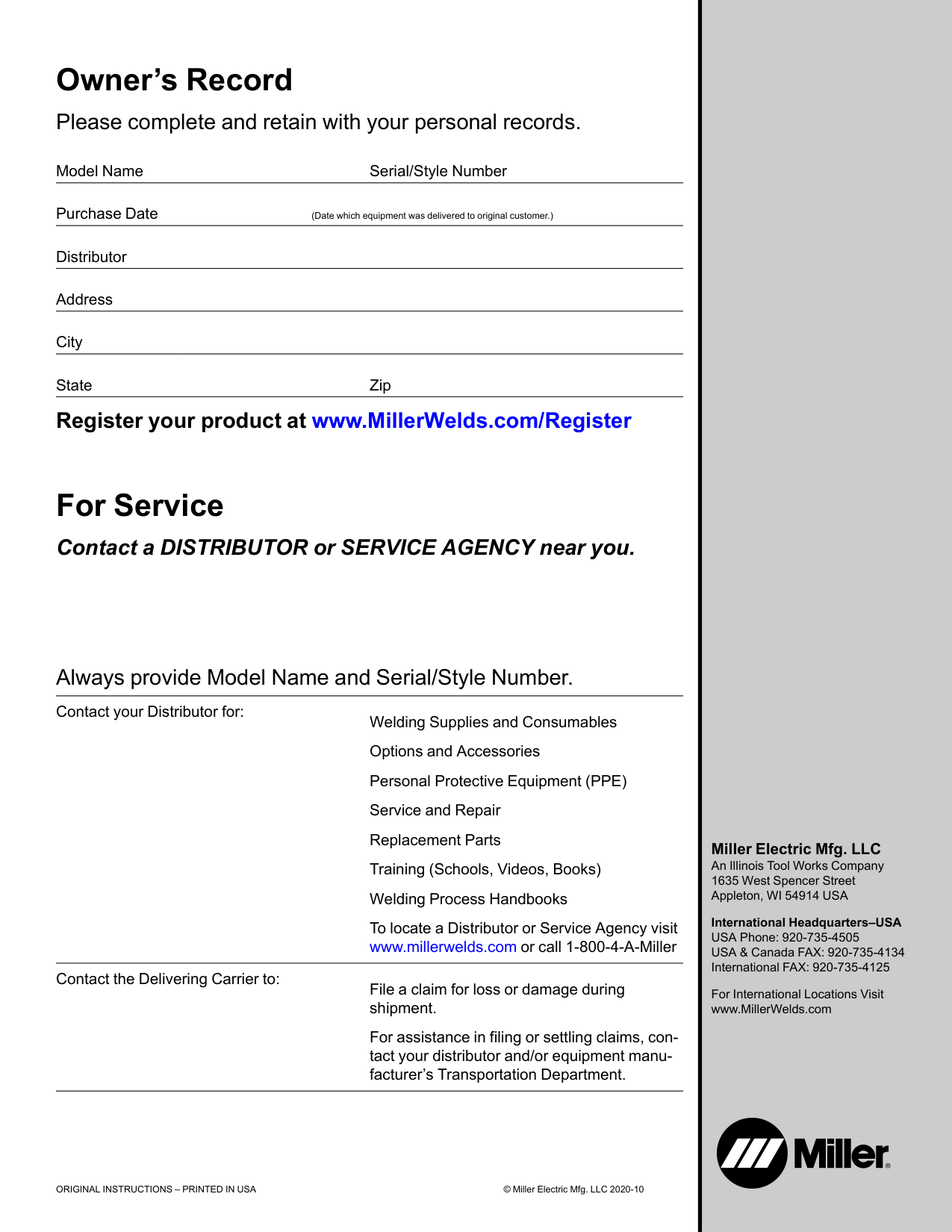 for your local Miller distributor. Your distributor also gives you ... Service You always get the fast, reliable response you need. Most replacement parts can be in your hands in 24 hours. Support Need fast answers to the tough welding questions? Contact your distributor. The expertise of the distributor and Miller is there to help you, every step of the way. mil dom warr 2020-01Miller Electric Mfg. LLC An Illinois Tool Works Company 1635 West Spencer Street Appleton, WI 54914 USA International Headquarters–USA USA Phone: 920-735-4505 USA & Canada FAX: 920-735-4134 International FAX: 920-735-4125 For International Locations Visit www.MillerWelds.com