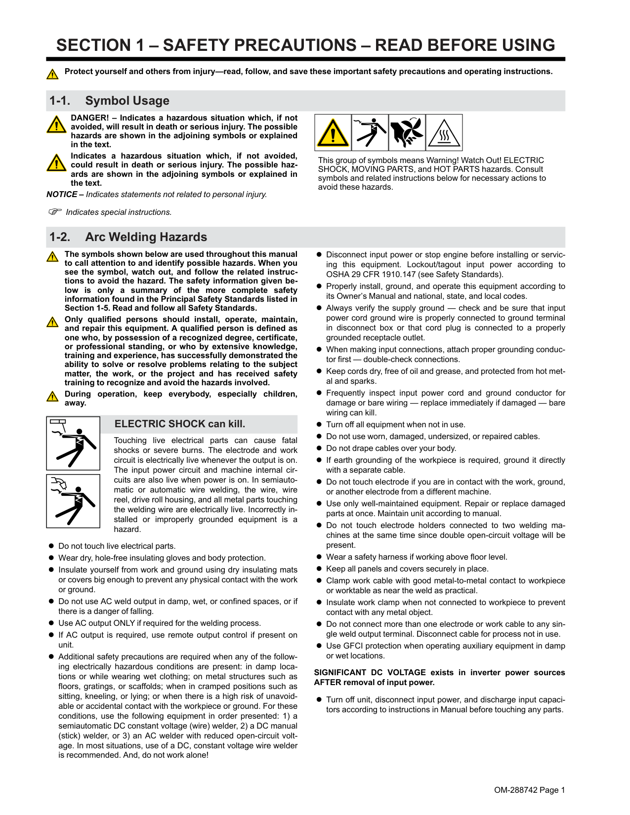 Protect yourself and others from injury—read, follow, and save these important safety precautions and operating instructions. 1-1. Symbol Usage DANGER! – Indicates a hazardous situation which, if not avoided, will result in death or serious injury. The possible hazards are shown in the adjoining symbols or explained in the text. Indicates a hazardous situation which, if not avoided, could result in death or serious injury. The possible haz- ards are shown in the adjoining symbols or explained in the text. NOTICE – Indicates statements not related to personal injury. F Indicates special instructions. This group of symbols means Warning! Watch Out! ELECTRIC SHOCK, MOVING PARTS, and HOT PARTS hazards. Consult symbols and related instructions below for necessary actions to avoid these hazards. 1-2. Arc Welding Hazards The symbols shown below are used throughout this manual to call attention to and identify possible hazards. When you see the symbol, watch out, and follow the related instruc- tions to avoid the hazard. The safety information given be- low is only a summary of the more complete safety information found in the Principal Safety Standards listed in Section 1-5. Read and follow all Safety Standards. Only qualified persons should install, operate, maintain, and repair this equipment. A qualified person is defined as one who, by possession of a recognized degree, certificate, or professional standing, or who by extensive knowledge, training and experience, has successfully demonstrated the ability to solve or resolve problems relating to the subject matter, the work, or the project and has received safety training to recognize and avoid the hazards involved. During operation, keep everybody, especially children, away. ELECTRIC SHOCK can kill. Touching live electrical parts can cause fatal shocks or severe burns. The electrode and work circuit is electrically live whenever the output is on. The input power circuit and machine internal cir- cuits are also live when power is on. In semiauto- matic or automatic wire welding, the wire, wire reel, drive roll housing, and all metal parts touching the welding wire are electrically live. Incorrectly in- stalled or improperly grounded equipment is a hazard. l Do not touch live electrical parts. l Wear dry, hole-free insulating gloves and body protection. l Insulate yourself from work and ground using dry insulating mats or covers big enough to prevent any physical contact with the work or ground. l Do not use AC weld output in damp, wet, or confined spaces, or if there is a danger of falling. l Use AC output ONLY if required for the welding process. l If AC output is required, use remote output control if present on unit. l Additional safety precautions are required when any of the follow- ing electrically hazardous conditions are present: in damp loca- tions or while wearing wet clothing; on metal structures such as floors, gratings, or scaffolds; when in cramped positions such as sitting, kneeling, or lying; or when there is a high risk of unavoid- able or accidental contact with the workpiece or ground. For these conditions, use the following equipment in order presented: 1) a semiautomatic DC constant voltage (wire) welder, 2) a DC manual (stick) welder, or 3) an AC welder with reduced open-circuit volt- age. In most situations, use of a DC, constant voltage wire welder is recommended. And, do not work alone! l Disconnect input power or stop engine before installing or servic- ing this equipment. Lockout/tagout input power according to OSHA 29 CFR 1910.147 (see Safety Standards). l Properly install, ground, and operate this equipment according to its Owner’s Manual and national, state, and local codes. l Always verify the supply ground — check and be sure that input power cord ground wire is properly connected to ground terminal in disconnect box or that cord plug is connected to a properly grounded receptacle outlet. l When making input connections, attach proper grounding conduc- tor first — double-check connections. l Keep cords dry, free of oil and grease, and protected from hot met- al and sparks. l Frequently inspect input power cord and ground conductor for damage or bare wiring — replace immediately if damaged — bare wiring can kill. l Turn off all equipment when not in use. l Do not use worn, damaged, undersized, or repaired cables. l Do not drape cables over your body. l If earth grounding of the workpiece is required, ground it directly with a separate cable. l Do not touch electrode if you are in contact with the work, ground, or another electrode from a different machine. l Use only well-maintained equipment. Repair or replace damaged parts at once. Maintain unit according to manual. l Do not touch electrode holders connected to two welding ma- chines at the same time since double open-circuit voltage will be present. l Wear a safety harness if working above floor level. l Keep all panels and covers securely in place. l Clamp work cable with good metal-to-metal contact to workpiece or worktable as near the weld as practical. l Insulate work clamp when not connected to workpiece to prevent contact with any metal object. l Do not connect more than one electrode or work cable to any sin- gle weld output terminal. Disconnect cable for process not in use. l Use GFCI protection when operating auxiliary equipment in damp or wet locations. SIGNIFICANT DC VOLTAGE exists in inverter power sources AFTER removal of input power. l Turn off unit, disconnect input power, and discharge input capaci- tors according to instructions in Manual before touching any parts.OM-288742 Page 2 HOT PARTS can burn. l Do not touch hot parts bare handed. l Allow cooling period before working on equipment. l To handle hot parts, use proper tools and/or wear heavy, insulated welding gloves and clothing to prevent burns. FLYING METAL OR DIRT can injure eyes. l Welding, chipping, wire brushing, and grinding cause sparks and flying metal. As welds