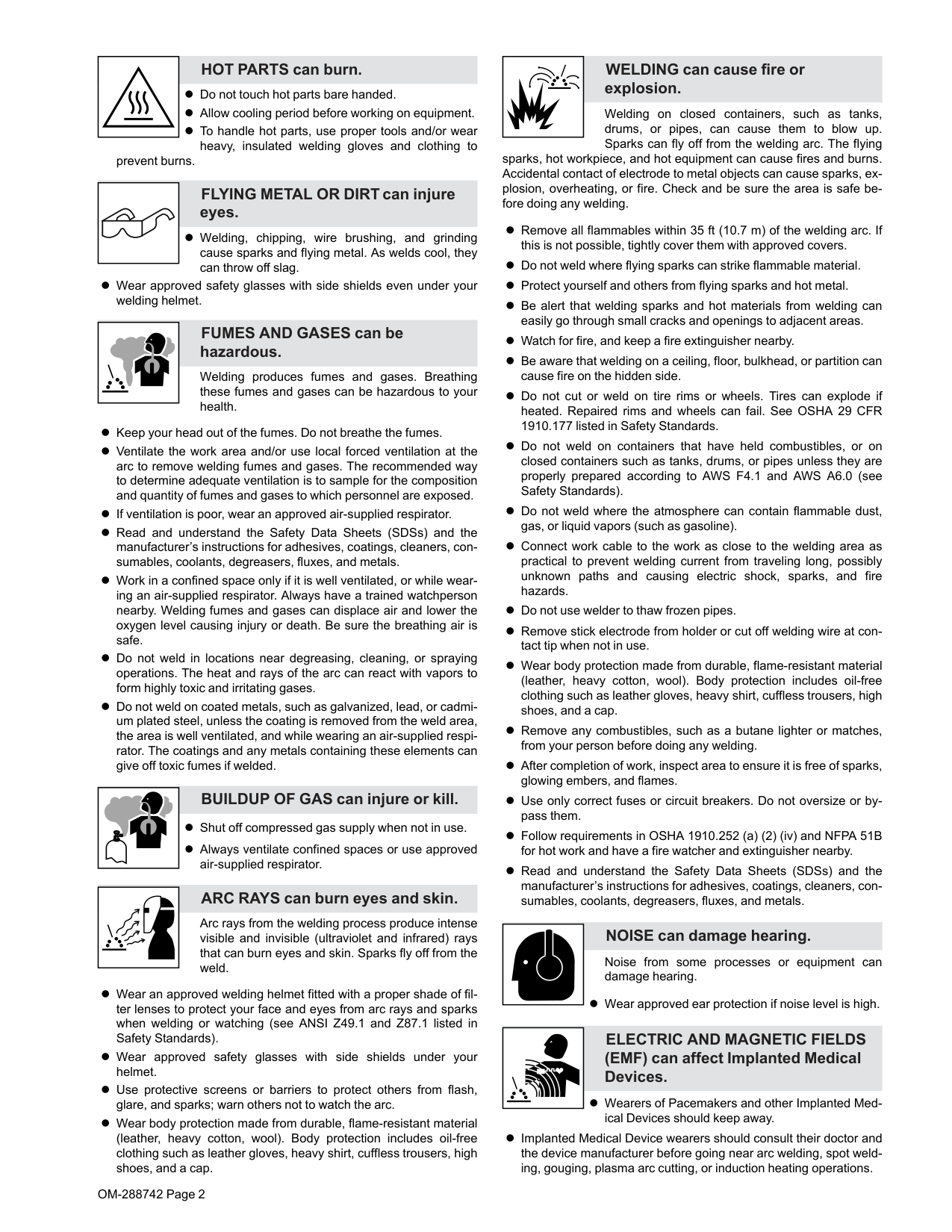 1-6. EMF Information Electric current flowing through any conductor causes localized elec- tric and magnetic fields (EMF). The current from arc welding (and al- lied processes including spot welding, gouging, plasma arc cutting, and induction heating operations) creates an EMF field around the welding circuit. EMF fields can interfere with some medical implants, e.g. pacemakers. Protective measures for persons wearing medical implants have to be taken. For example, restrict access for passers −by or conduct individual risk assessment for welders. All welders should use the following procedures in order to minimize exposure to EMF fields from the welding circuit:OM-288742 Page 5