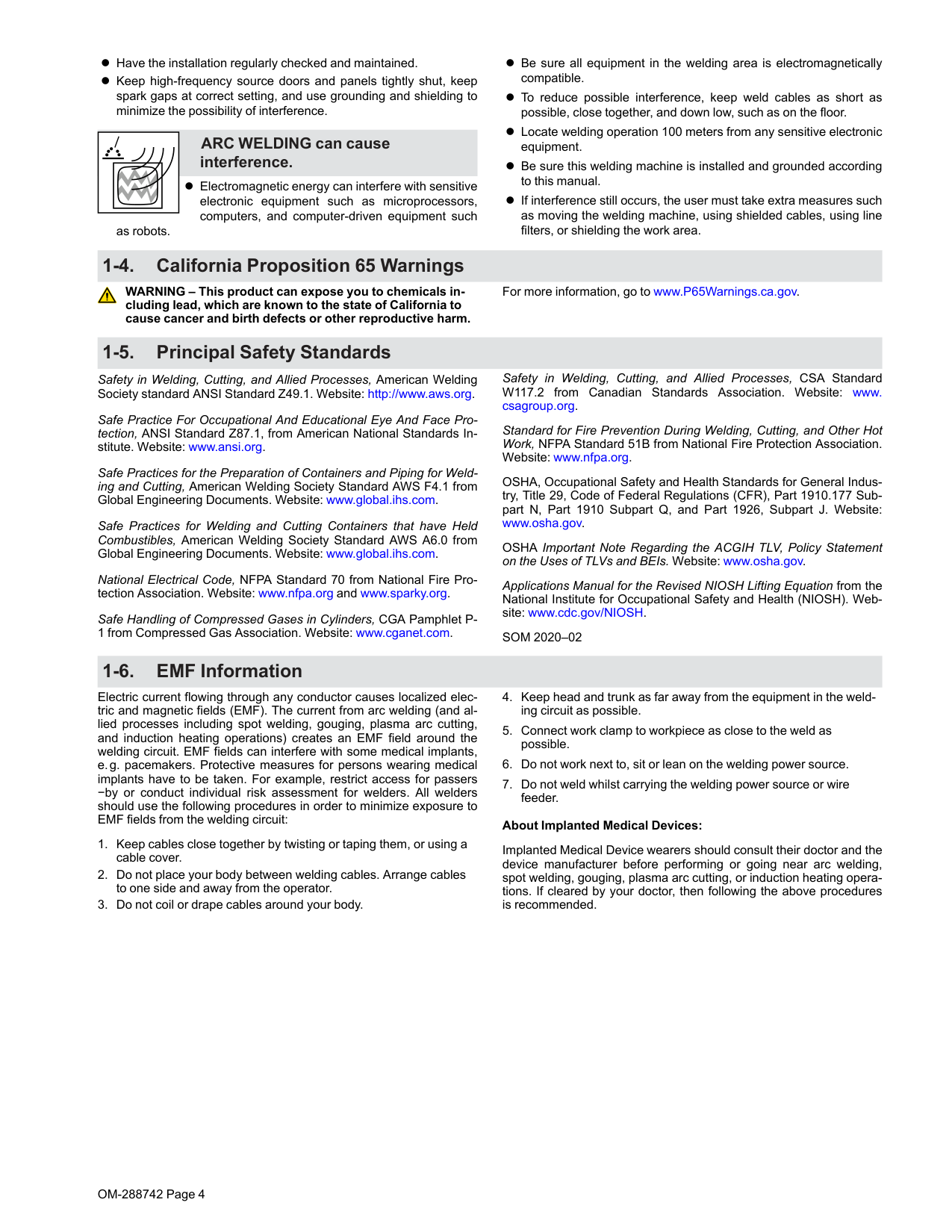 l Read and follow all labels and the Owner’s Manual carefully before installing, operating, or servicing unit. Read the safety information at the beginning of the manual and in each section. l Use only genuine replacement parts from the manufacturer. l Perform installation, maintenance, and service according to the Owner’s Manuals, industry standards, and national, state, and lo- cal codes. H.F. RADIATION can cause interference. l High-frequency (H.F.) can interfere with radio navi- gation, safety services, computers, and communi- cations equipment. l Have only qualified persons familiar with electronic equipment per- form this installation. l The user is responsible for having a qualified electrician promptly correct any interference problem resulting from the installation. l If notified by the FCC about interference, stop using the equipment at once.OM-288742 Page 4 l Have the installation regularly checked and maintained. l Keep high-frequency source doors and panels tightly shut, keep spark gaps at correct setting, and use grounding and shielding to minimize the possibility of interference. ARC WELDING can cause interference. l Electromagnetic energy can interfere with sensitive electronic equipment such as microprocessors, computers, and computer-driven equipment such as robots. l Be sure all equipment in the welding area is electromagnetically compatible. l To reduce possible interference, keep weld cables as short as possible, close together, and down low, such as on the floor. l Locate welding operation 100 meters from any sensitive electronic equipment. l Be sure this welding machine is installed and grounded according to this manual. l If interference still occurs, the user must take extra measures such as moving the welding machine, using shielded cables, using line filters, or shielding the work area. 1-4. California Proposition 65 Warnings WARNING – This product can expose you to chemicals in- cluding lead, which are known to the state of California to cause cancer and birth defects or other reproductive harm. For more information, go to www.P65Warnings.ca.gov. 1-5. Principal Safety Standards Safety in Welding, Cutting, and Allied Processes, American Welding Society standard ANSI Standard Z49.1. Website: http://www.aws.org. Safe Practice For Occupational And Educational Eye And Face Pro- tection, ANSI Standard Z87.1, from American National Standards In- stitute. Website: www.ansi.org. Safe Practices for the Preparation of Containers and Piping for Weld- ing and Cutting, American Welding Society Standard AWS F4.1 from Global Engineering Documents. Website: www.global.ihs.com. Safe Practices for Welding and Cutting Containers that have Held Combustibles, American Welding Society Standard AWS A6.0 from Global Engineering Documents. Website: www.global.ihs.com. National Electrical Code, NFPA Standard 70 from National Fire Pro- tection Association. Website: www.nfpa.org and www.sparky.org. Safe Handling of Compressed Gases in Cylinders, CGA Pamphlet P- 1 from Compressed Gas Association. Website: www.cganet.com. Safety in Welding, Cutting, and Allied Processes, CSA Standard W117.2 from Canadian Standards Association. Website: www. csagroup.org. Standard for Fire Prevention During Welding, Cutting, and Other Hot Work, NFPA Standard 51B from National Fire Protection Association. Website: www.nfpa.org. OSHA, Occupational Safety and Health Standards for General Indus- try, Title 29, Code of Federal Regulations (CFR), Part 1910.177 Sub- part N, Part 1910 Subpart Q, and Part 1926, Subpart J. Website: www.osha.gov. OSHA Important Note Regarding the ACGIH TLV, Policy Statement on the Uses of TLVs and BEIs. Website: www.osha.gov. Applications Manual for the Revised NIOSH Lifting Equation from the National Institute for Occupational Safety and Health (NIOSH). Web- site: www.cdc.gov/NIOSH.