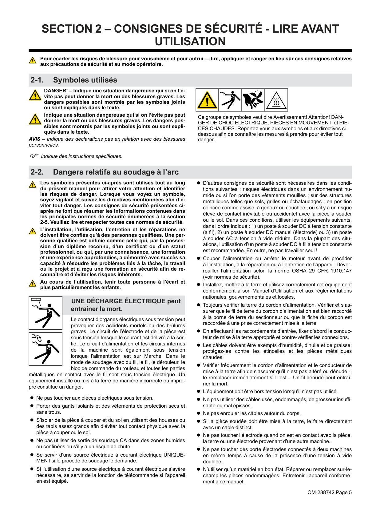 Pour écarter les risques de blessure pour vous-même et pour autrui — lire, appliquer et ranger en lieu sûr ces consignes relatives aux précautions de sécurité et au mode opératoire. 2-1. Symboles utilisés DANGER! – Indique une situation dangereuse qui si on l’é- vite pas peut donner la mort ou des blessures graves. Les dangers possibles sont montrés par les symboles joints ou sont expliqués dans le texte. Indique une situation dangereuse qui si on l’évite pas peut donner la mort ou des blessures graves. Les dangers pos- sibles sont montrés par les symboles joints ou sont expli- qués dans le texte. AVIS – Indique des déclarations pas en relation avec des blessures personnelles. F Indique des instructions spécifiques. Ce groupe de symboles veut dire Avertissement! Attention! DAN- GER DE CHOC ELECTRIQUE, PIECES EN MOUVEMENT, et PIE- CES CHAUDES. Reportez-vous aux symboles et aux directives ci- dessous afin de connaître les mesures à prendre pour éviter tout danger. 2-2. Dangers relatifs au soudage à l’arc Les symboles présentés ci-après sont utilisés tout au long du présent manuel pour attirer votre attention et identifier les risques de danger. Lorsque vous voyez un symbole, soyez vigilant et suivez les directives mentionnées afin d’é- viter tout danger. Les consignes de sécurité présentées ci- après ne font que résumer les informations contenues dans les principales normes de sécurité énumérées à la section 2-5. Veuillez lire et respecter toutes ces normes de sécurité. L’installation, l’utilisation, l’entretien et les réparations ne doivent être confiés qu’à des personnes qualifiées. Une per- sonne qualifiée est définie comme celle qui, par la posses- sion d’un diplôme reconnu, d’un certificat ou d’un statut professionnel, ou qui, par une connaissance, une formation et une expérience approfondies, a démontré avec succès sa capacité à résoudre les problèmes liés à la tâche, le travail ou le projet et a reçu une formation en sécurité afin de re- connaître et d’éviter les risques inhérents. Au cours de l’utilisation, tenir toute personne à l’écart et plus particulièrement les enfants. UNE DÉCHARGE ÉLECTRIQUE peut entraîner la mort. Le contact d’organes électriques sous tension peut provoquer des accidents mortels ou des brûlures graves. Le circuit de l’électrode et de la pièce est sous tension lorsque le courant est délivré à la sor- tie. Le circuit d’alimentation et les circuits internes de la machine sont également sous tension lorsque l’alimentation est sur Marche. Dans le mode de soudage avec du fil, le fil, le dérouleur, le bloc de commande du rouleau et toutes les parties métalliques en contact avec le fil sont sous tension électrique. Un équipement installé ou mis à la terre de manière incorrecte ou impro- pre constitue un danger. l Ne pas toucher aux pièces électriques sous tension. l Porter des gants isolants et des vêtements de protection secs et sans trous. l S’isoler de la pièce à couper et du sol en utilisant des housses ou des tapis assez grands afin d’éviter tout contact physique avec la pièce à couper ou le sol. l Ne pas utiliser de sortie de soudage CA dans des zones humides ou confinées ou s’il y a un risque de chute. l Se servir d’une source électrique à courant électrique UNIQUE- MENTsi le procédé de soudage le demande. l Si l’utilisation d’une source électrique à courant électrique s’avère nécessaire, se servir de la fonction de télécommande si l’appareil en est équipé. l D’autres consignes de sécurité sont nécessaires dans les condi- tions suivantes : risques électriques dans un environnement hu- mide ou si l’on porte des vêtements mouillés ; sur des structures métalliques telles que sols, grilles ou échafaudages ; en position coincée comme assise, à genoux ou couchée ; ou s’il y a un risque élevé de contact inévitable ou accidentel avec la pièce à souder ou le sol. Dans ces conditions, utiliser les équipements suivants, dans l’ordre indiqué : 1) un poste à souder DC à tension constante (à fil), 2) un poste à souder DC manuel (électrode) ou 3) un poste à souder AC à tension à vide réduite. Dans la plupart des situ- ations, l’utilisation d’un poste à souder DC à fil à tension constante est recommandée. En outre, ne pas travailler seul ! l Couper l’alimentation ou arrêter le moteur avant de procéder à l’installation, à la réparation ou à l’entretien de l’appareil. Déver- rouiller l’alimentation selon la norme OSHA 29 CFR 1910.147 (voir normes de sécurité). l Installez, mettez à la terre et utilisez correctement cet équipement conformément à son Manuel d’Utilisation et aux réglementations nationales, gouvernementales et locales. l Toujours vérifier la terre du cordon d’alimentation. Vérifier et s’as- surer que le fil de terre du cordon d’alimentation est bien raccordé à la borne de terre du sectionneur ou que la fiche du cordon est raccordée à une prise correctement mise à la terre. l En effectuant les raccordements d’entrée, fixer d’abord le conduc- teur de mise à la terre approprié et contre-vérifier les connexions. l Les câbles doivent être exempts d’humidité, d’huile et de graisse; protégez-les contre les étincelles et les pièces métalliques chaudes. l Vérifier fréquemment le cordon d’alimentation et le conducteur de mise à la terre afin de s’assurer qu’il n’est pas altéré ou dénudé -, le remplacer immédiatement s’il l’est -. Un fil dénudé peut entraî- ner la mort. l L’équipement doit être hors tension lorsqu’il n’est pas utilisé. l Ne pas utiliser des câbles usés, endommagés, de grosseur insuffi- sante ou mal épissés. l Ne pas enrouler les câbles autour du corps. l Si la pièce soudée doit être mise à la terre, le faire directement avec un câble distinct. l Ne pa