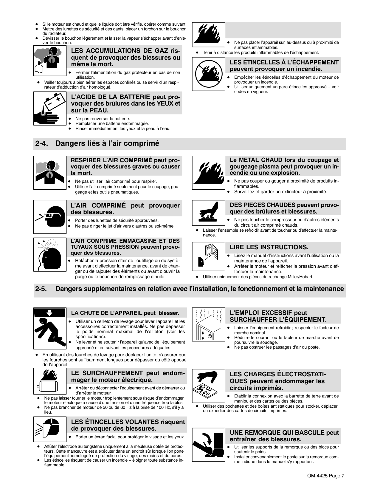 Lisez le manuel d’instructions avant l’utilisation ou la maintenance de l’appareil. Arrêter le moteur et relâcher la pression avant d’ef- fectuer la maintenance. Utiliser uniquement des pièces de rechange Miller/Hobart. 2-5. Dangers supplémentaires en relation avec l’installation, le fonctionnement et la maintenance LA CHUTE DE L’APPAREIL peut blesser. Utiliser un œilleton de levage pour lever l’appareil et les accessoires correctement installés. Ne pas dépasser le poids nominal maximal de l’œilleton (voir les spécifications). Ne lever et ne soutenir l’appareil qu’avec de l’équipement approprié et en suivant les procédures adéquates. En utilisant des fourches de levage pour déplacer l’unité, s’assurer que les fourches sont suffisamment longues pour dépasser du côté opposé de l’appareil. LE SURCHAUFFEMENT peut endom- mager le moteur électrique. Arrêter ou déconnecter l’équipement avant de démarrer ou d’arrêter le moteur. Ne pas laisser tourner le moteur trop lentement sous risque d’endommager le moteur électrique à cause d’une tension et d’une fréquence trop faibles. Ne pas brancher de moteur de 50 ou de 60 Hz à la prise de 100 Hz, s’il y a lieu. LES ÉTINCELLES VOLANTES risquent de provoquer des blessures. Porter un écran facial pour protéger le visage et les yeux. Affûter l’électrode au tungstène uniquement à la meuleuse dotée de protec- teurs. Cette manœuvre est à exécuter dans un endroit sûr lorsque l’on porte l’équipement homologué de protection du visage, des mains et du corps. Les étincelles risquent de causer un incendie − éloigner toute substance in- flammable. L’EMPLOI EXCESSIF peutSurchauffer L’Équipement.