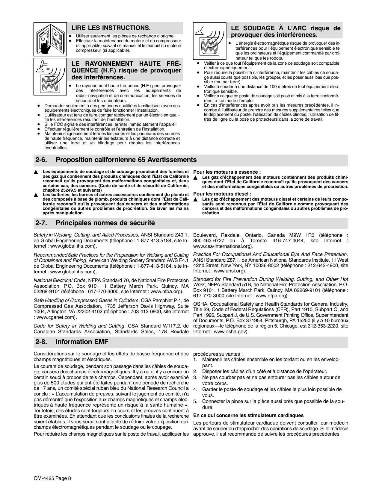 from Global Engineering Documents (phone: 1-877-413-5184, website: www.global.ihs.com). National Electrical Code, NFPA Standard 70, from National Fire Protec- tion Association, P.O. Box 9101, 1 Battery March Park, Quincy, MA 02269-9101 (phone: 617-770-3000, website: www.nfpa.org and www. sparky.org). Safe Handling of Compressed Gases in Cylinders, CGA Pamphlet P-1, from Compressed Gas Association, 1735 Jefferson Davis Highway, Suite 1004, Arlington, VA 22202-4102 (phone: 703-412-0900, website: www.cganet.com). Code for Safety in Welding and Cutting, CSA Standard W117.2, from Canadian Standards Association, Standards Sales, 178 Rexdale Bou- levard, Rexdale, Ontario, Canada M9W 1R3 (phone: 800-463-6727 or in Toronto 416-747-4044, website: www.csa-international.org). Practice For Occupational And Educational Eye And Face Protection, ANSI Standard Z87.1, from American National Standards Institute, 11 West 42nd Street, New York, NY 10036–8002 (phone: 212-642-4900, website: www.ansi.org). Standard for Fire Prevention During Welding, Cutting, and Other Hot Work, NFPA Standard 51B, from National Fire Protection Association, P.O. Box 9101, 1 Battery March Park, Quincy, MA 02269-9101 (phone: 617-770-3000, website: www.nfpa.org. OSHA, Occupational Safety and Health Standards for General Indus- try, Title 29, Code of Federal Regulations (CFR), Part 1910, Subpart Q, and Part 1926, Subpart J, from U.S. Government Printing Office, Super- intendent of Documents, P.O. Box 371954, Pittsburgh, PA 15250 (there are 10 Regional Offices—phone for Region 5, Chicago, is 312-353-2220, website: www.osha.gov). 1-8. EMF Information Considerations About Welding And The Effects Of Low Frequency Electric And Magnetic Fields Welding current, as it flows through welding cables, will cause electro- magnetic fields. There has been and still is some concern about such fields. However, after examining more than 500 studies spanning 17 years of research, a special blue ribbon committee of the National Research Council concluded that: “The body of evidence, in the committee’s judgment, has not demonstrated that exposure to power- frequency electric and magnetic fields is a human-health hazard.” However, studies are still going forth and evidence continues to be examined. Until the final conclusions of the research are reached, you may wish to minimize your exposure to electromagnetic fields when welding or cutting. To reduce magnetic fields in the workplace, use the following procedures:OM-4425 Page 5