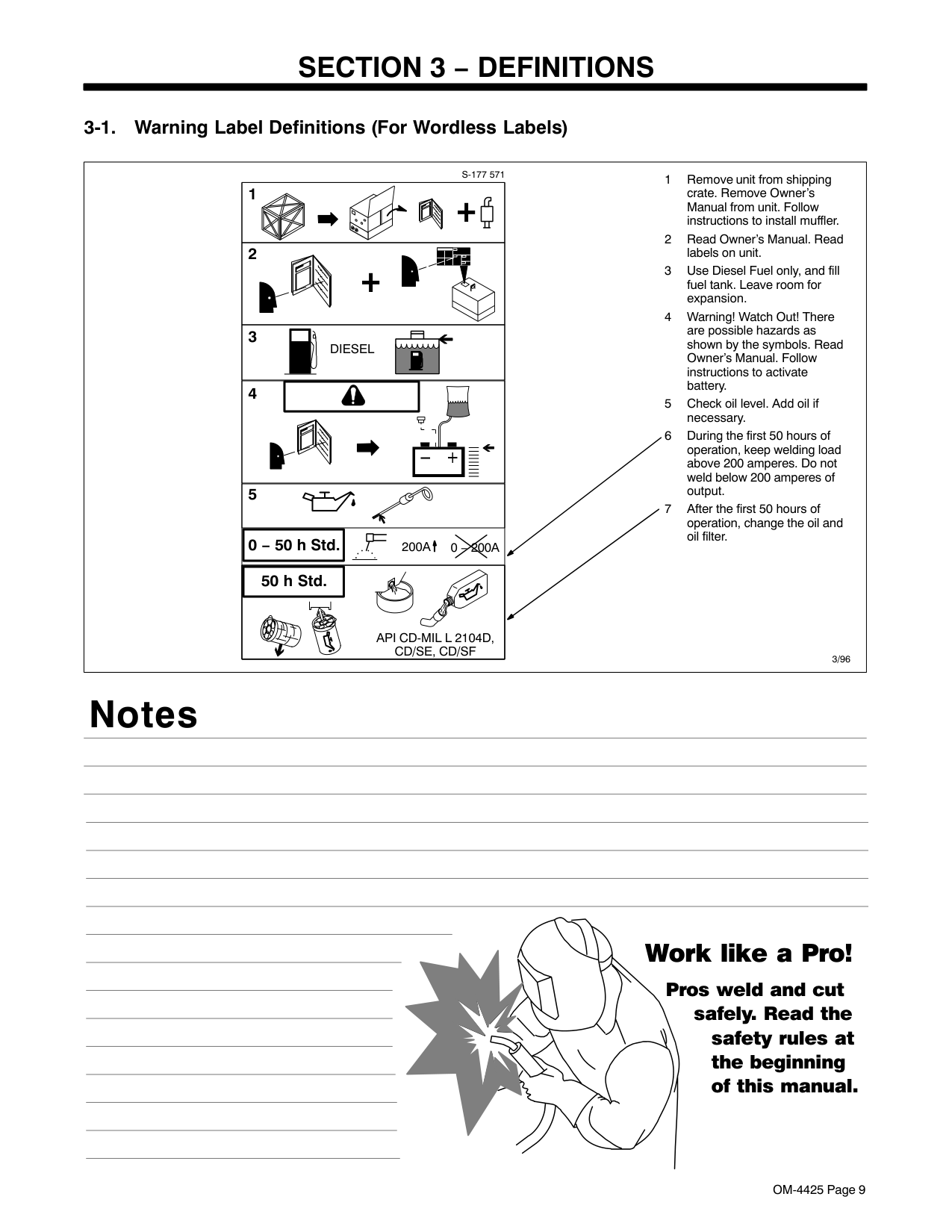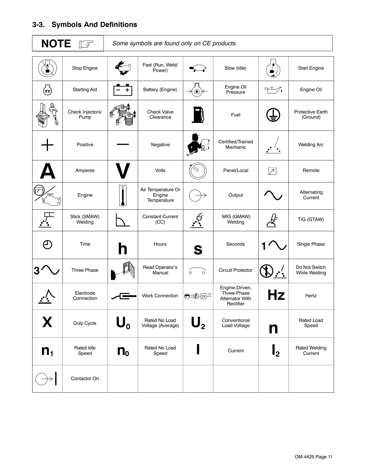 5 50 h Std. Notes Work like a Pro! Pros weld and cut safely. Read the safety rules at the beginning of this manual.OM-4425 Page 11 3-3. Symbols And Definitions Some symbols are found only on CE products.