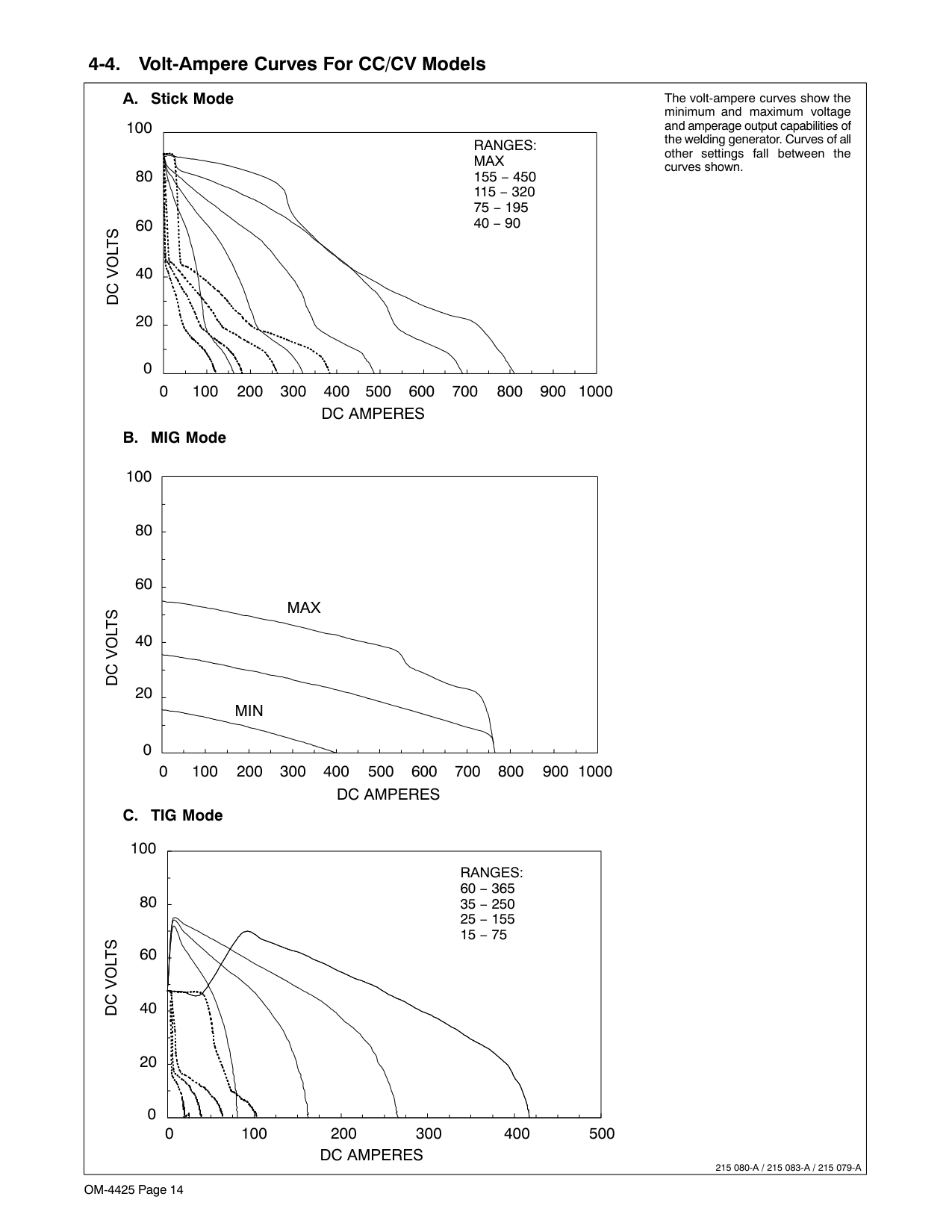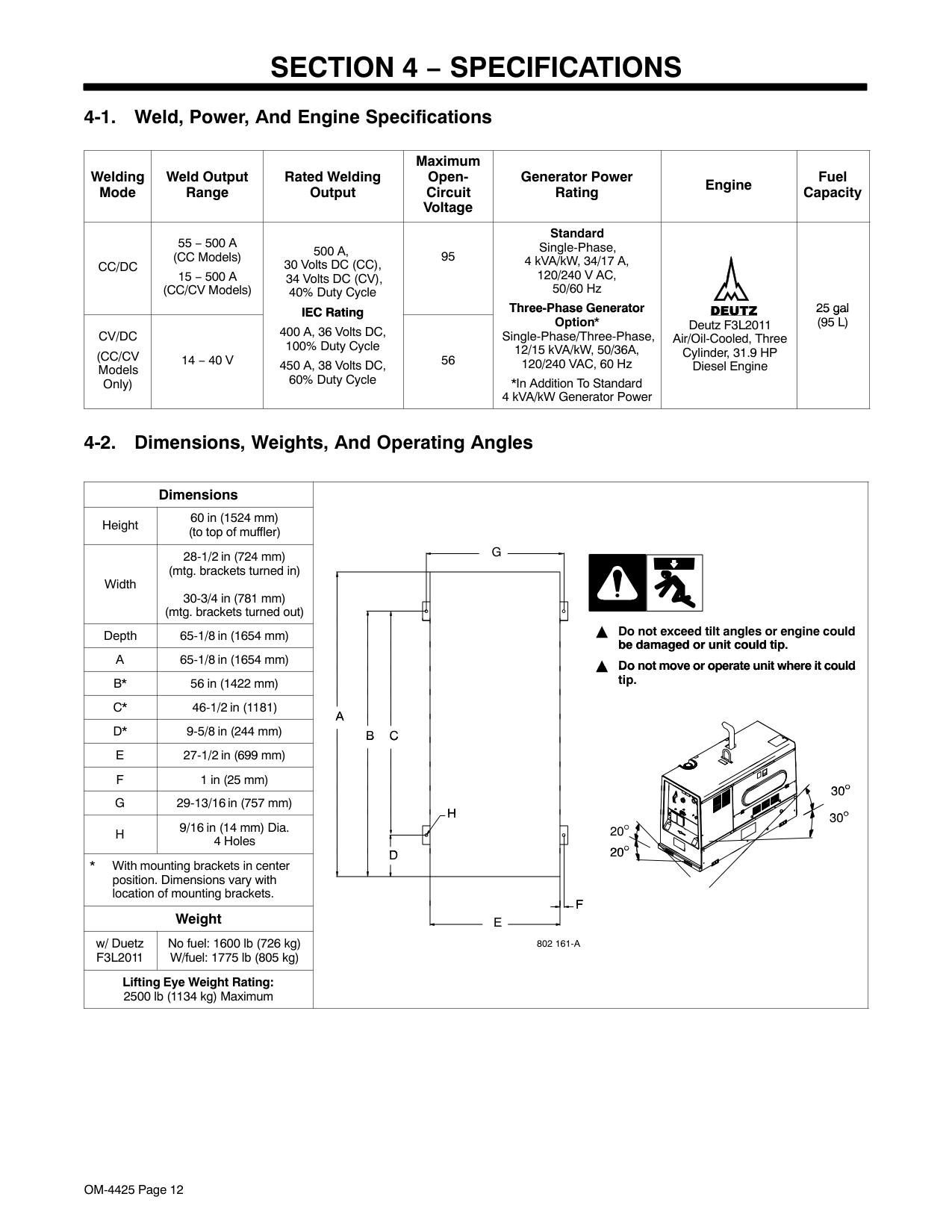 12 . . . . . . . . . . . . . . . . . . . . . . . . . . . . . . . . . . . . . . . . . . . . . . . . . . . . . . . . . . . . . . . . 4-1. Weld, Power, And Engine Specifications 12 . . . . . . . . . . . . . . . . . . . . . . . . . . . . . . . . . . . . . . . . . . . . . . . . . . 4-2. Dimensions, Weights, And Operating Angles 12 . . . . . . . . . . . . . . . . . . . . . . . . . . . . . . . . . . . . . . . . . . . . . . 4-3. Volt-Ampere Curves For CC Models 13 . . . . . . . . . . . . . . . . . . . . . . . . . . . . . . . . . . . . . . . . . . . . . . . . . . . . . 4-4. Volt-Ampere Curves For CC/CV Models 14 . . . . . . . . . . . . . . . . . . . . . . . . . . . . . . . . . . . . . . . . . . . . . . . . . . 4-5. Fuel Consumption 15 . . . . . . . . . . . . . . . . . . . . . . . . . . . . . . . . . . . . . . . . . . . . . . . . . . . . . . . . . . . . . . . . . . . . . 4-6. Duty Cycle And Overheating 15 . . . . . . . . . . . . . . . . . . . . . . . . . . . . . . . . . . . . . . . . . . . . . . . . . . . . . . . . . . . . 4-7. AC Generator Power Curve 16 . . . . . . . . . . . . . . . . . . . . . . . . . . . . . . . . . . . . . . . . . . . . . . . . . . . . . . . . . . . . . 4-8. Optional Three-Phase Generator Curves 16 . . . . . . . . . . . . . . . . . . . . . . . . . . . . . . . . . . . . . . . . . . . . . . . . .Section 5 − Installation