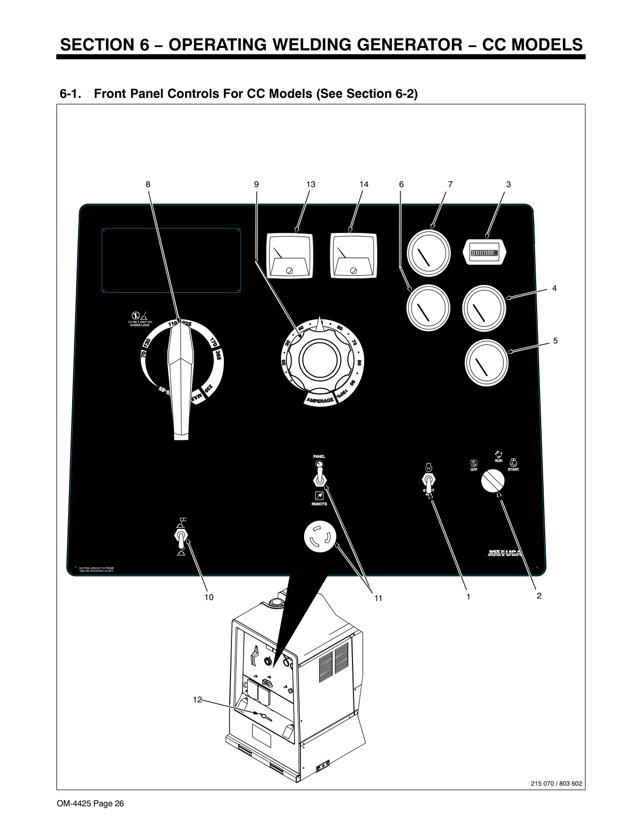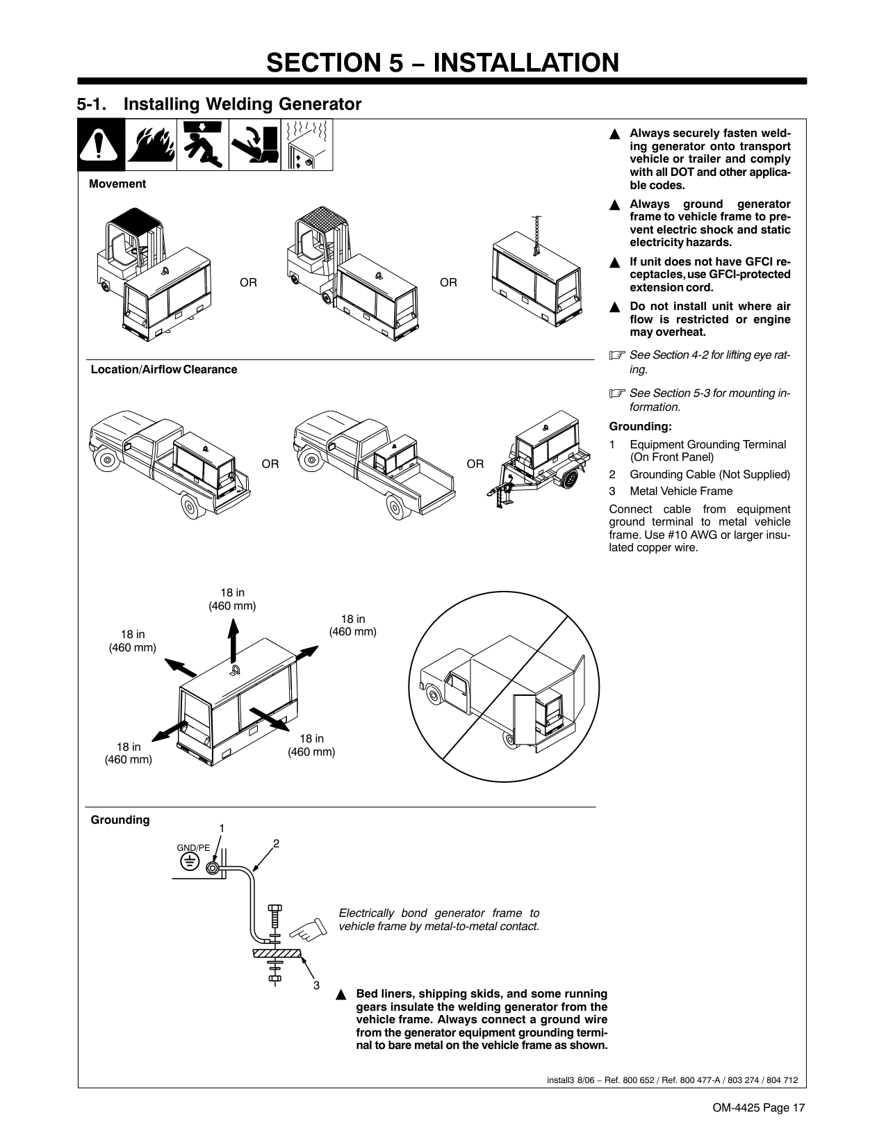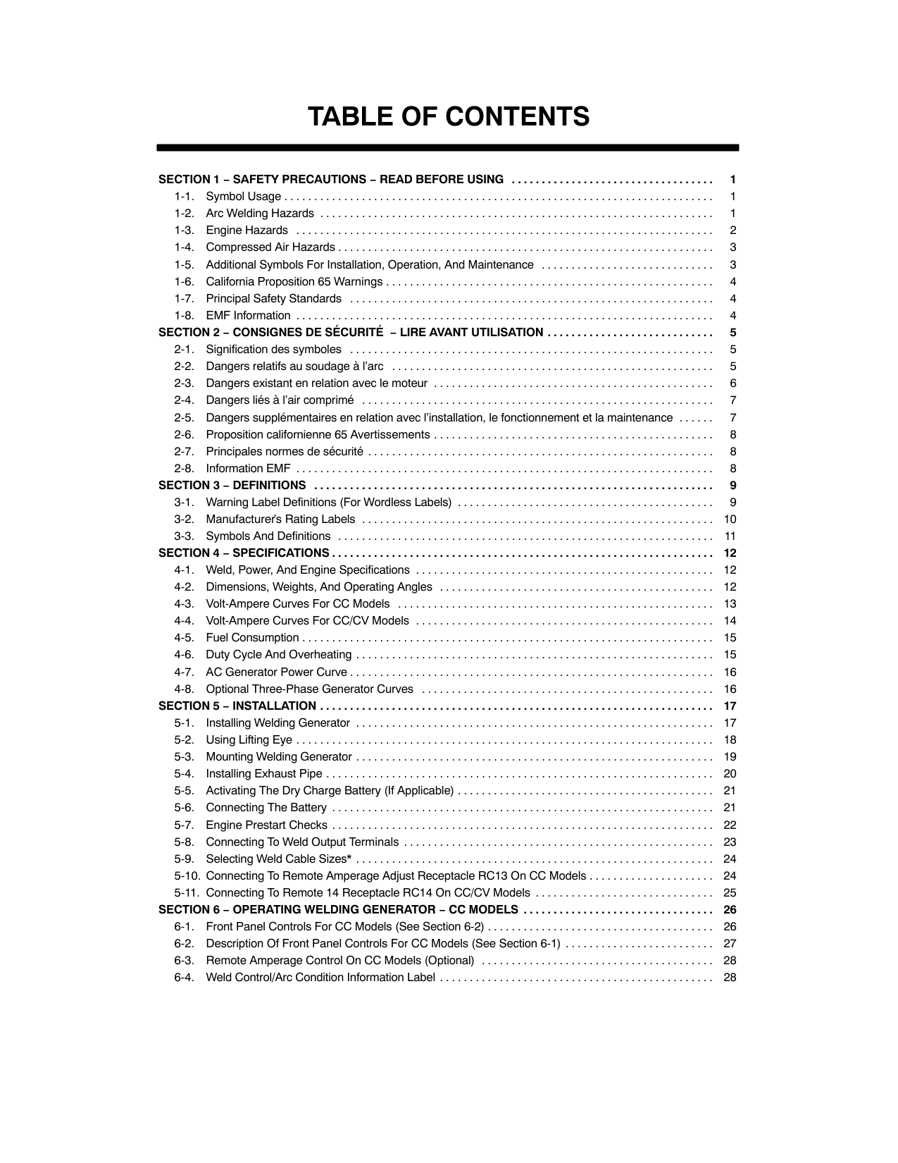 17 . . . . . . . . . . . . . . . . . . . . . . . . . . . . . . . . . . . . . . . . . . . . . . . . . . . . . . . . . . . . . . . . . . 5-1. Installing Welding Generator 17 . . . . . . . . . . . . . . . . . . . . . . . . . . . . . . . . . . . . . . . . . . . . . . . . . . . . . . . . . . . . 5-2. Using Lifting Eye 18 . . . . . . . . . . . . . . . . . . . . . . . . . . . . . . . . . . . . . . . . . . . . . . . . . . . . . . . . . . . . . . . . . . . . . . 5-3. Mounting Welding Generator 19 . . . . . . . . . . . . . . . . . . . . . . . . . . . . . . . . . . . . . . . . . . . . . . . . . . . . . . . . . . . . 5-4. Installing Exhaust Pipe 20 . . . . . . . . . . . . . . . . . . . . . . . . . . . . . . . . . . . . . . . . . . . . . . . . . . . . . . . . . . . . . . . . . 5-5. Activating The Dry Charge Battery (If Applicable) 21 . . . . . . . . . . . . . . . . . . . . . . . . . . . . . . . . . . . . . . . . . . . 5-6. Connecting The Battery 21 . . . . . . . . . . . . . . . . . . . . . . . . . . . . . . . . . . . . . . . . . . . . . . . . . . . . . . . . . . . . . . . . 5-7. Engine Prestart Checks 22 . . . . . . . . . . . . . . . . . . . . . . . . . . . . . . . . . . . . . . . . . . . . . . . . . . . . . . . . . . . . . . . . 5-8. Connecting To Weld Output Terminals 23 . . . . . . . . . . . . . . . . . . . . . . . . . . . . . . . . . . . . . . . . . . . . . . . . . . . . 5-9. Selecting Weld Cable Sizes* 24 . . . . . . . . . . . . . . . . . . . . . . . . . . . . . . . . . . . . . . . . . . . . . . . . . . . . . . . . . . . . 5-10. Connecting To Remote Amperage Adjust Receptacle RC13 On CC Models 24 . . . . . . . . . . . . . . . . . . . . . 5-11. Connecting To Remote 14 Receptacle RC14 On CC/CV Models 25 . . . . . . . . . . . . . . . . . . . . . . . . . . . . . .Section 6 − Operating Welding Generator − Cc Models