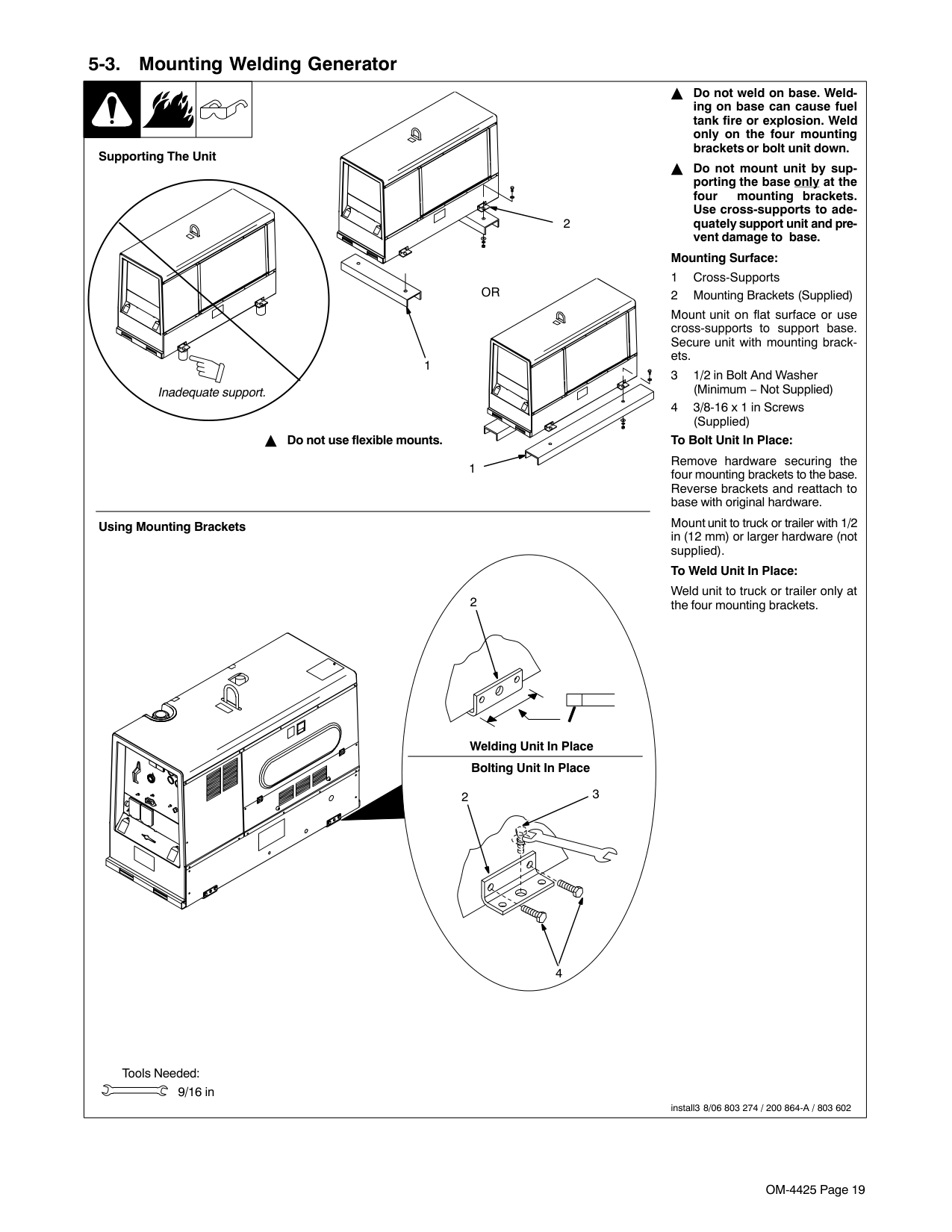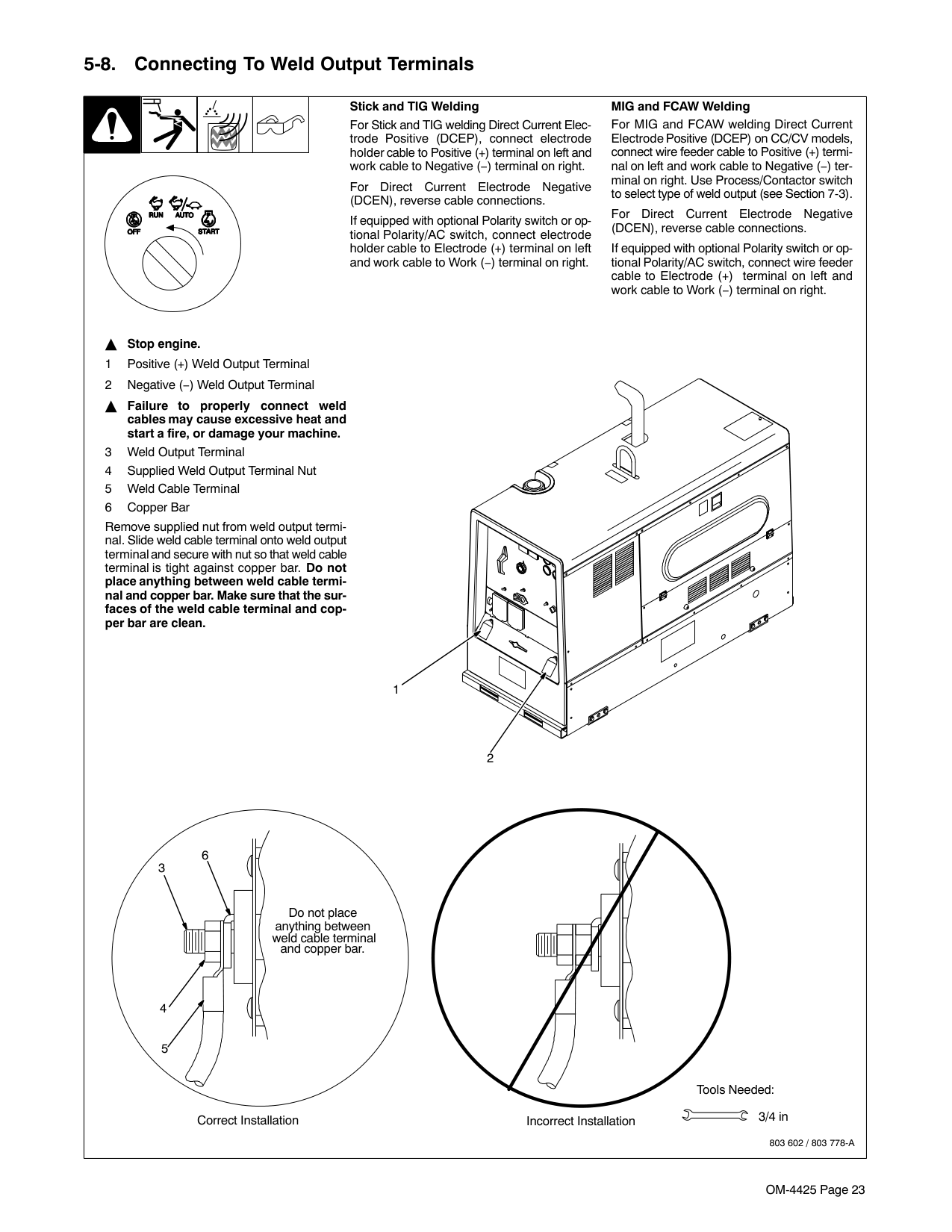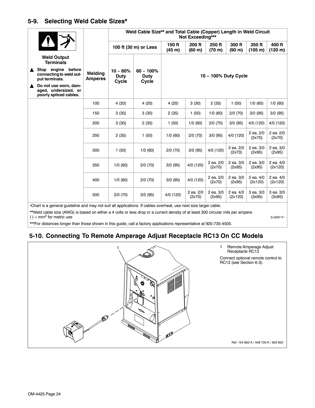 17 . . . . . . . . . . . . . . . . . . . . . . . . . . . . . . . . . . . . . . . . . . . . . . . . . . . . . . . . . . . . . . . . . . 5-1. Installing Welding Generator 17 . . . . . . . . . . . . . . . . . . . . . . . . . . . . . . . . . . . . . . . . . . . . . . . . . . . . . . . . . . . . 5-2. Using Lifting Eye 18 . . . . . . . . . . . . . . . . . . . . . . . . . . . . . . . . . . . . . . . . . . . . . . . . . . . . . . . . . . . . . . . . . . . . . . 5-3. Mounting Welding Generator 19 . . . . . . . . . . . . . . . . . . . . . . . . . . . . . . . . . . . . . . . . . . . . . . . . . . . . . . . . . . . . 5-4. Installing Exhaust Pipe 20 . . . . . . . . . . . . . . . . . . . . . . . . . . . . . . . . . . . . . . . . . . . . . . . . . . . . . . . . . . . . . . . . . 5-5. Activating The Dry Charge Battery (If Applicable) 21 . . . . . . . . . . . . . . . . . . . . . . . . . . . . . . . . . . . . . . . . . . . 5-6. Connecting The Battery 21 . . . . . . . . . . . . . . . . . . . . . . . . . . . . . . . . . . . . . . . . . . . . . . . . . . . . . . . . . . . . . . . . 5-7. Engine Prestart Checks 22 . . . . . . . . . . . . . . . . . . . . . . . . . . . . . . . . . . . . . . . . . . . . . . . . . . . . . . . . . . . . . . . . 5-8. Connecting To Weld Output Terminals 23 . . . . . . . . . . . . . . . . . . . . . . . . . . . . . . . . . . . . . . . . . . . . . . . . . . . . 5-9. Selecting Weld Cable Sizes* 24 . . . . . . . . . . . . . . . . . . . . . . . . . . . . . . . . . . . . . . . . . . . . . . . . . . . . . . . . . . . . 5-10. Connecting To Remote Amperage Adjust Receptacle RC13 On CC Models 24 . . . . . . . . . . . . . . . . . . . . . 5-11. Connecting To Remote 14 Receptacle RC14 On CC/CV Models 25 . . . . . . . . . . . . . . . . . . . . . . . . . . . . . .Section 6 − Operating Welding Generator − Cc Models
