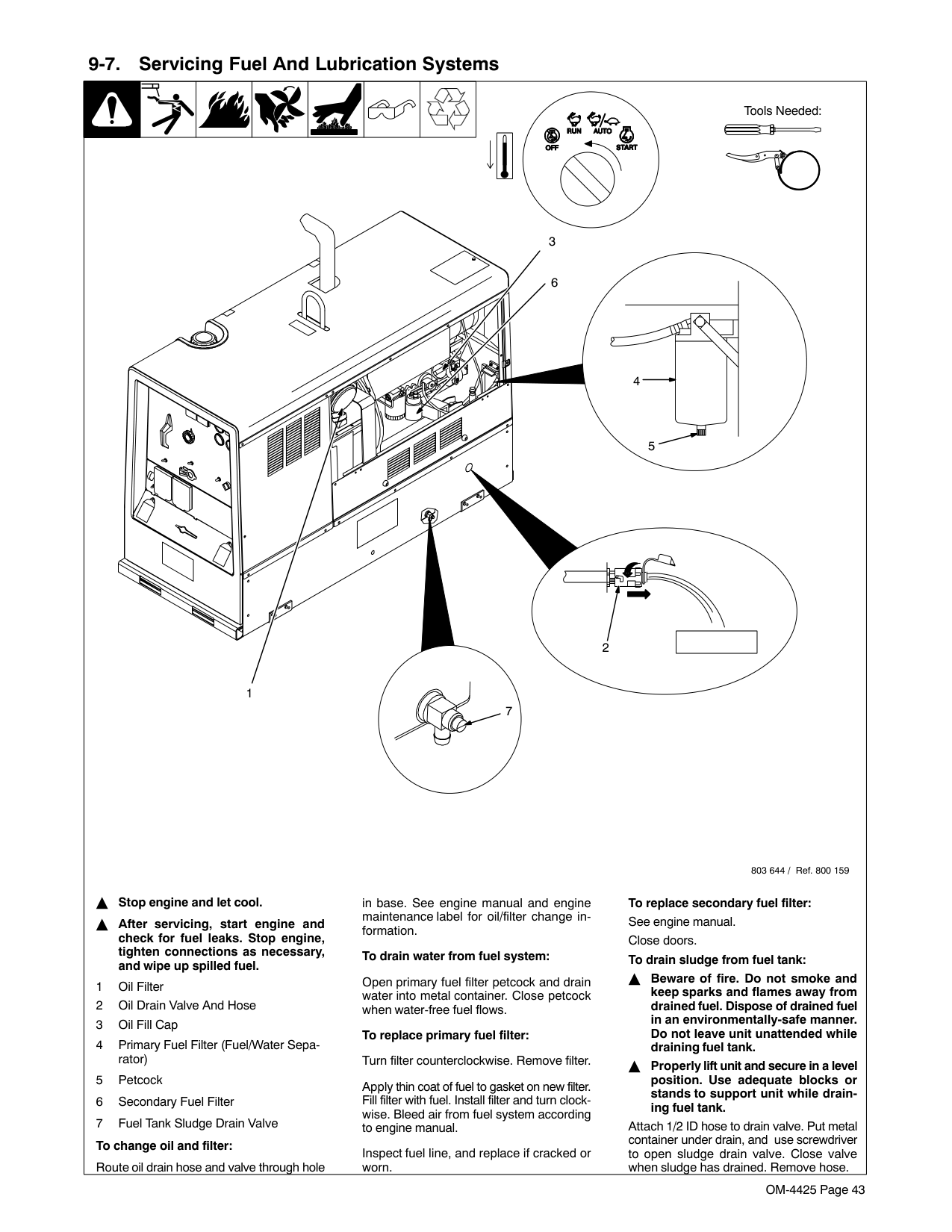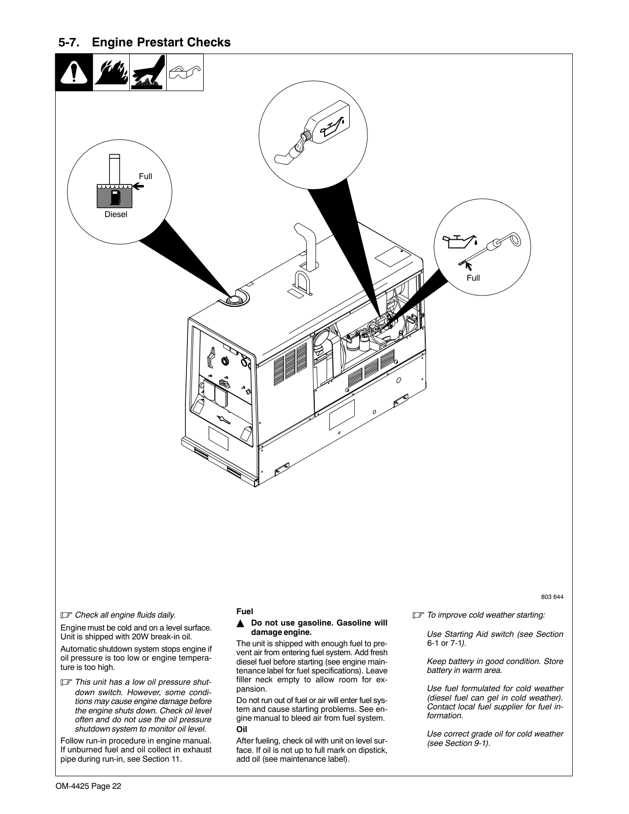 3-1. Warning Label Definitions (For Wordless Labels) 3/96 1 Remove unit from shipping crate. Remove Owner’s Manual from unit. Follow instructions to install muffler. 2 Read Owner’s Manual. Read labels on unit. 3 Use Diesel Fuel only, and fill fuel tank. Leave room for expansion. 4 Warning! Watch Out! There are possible hazards as shown by the symbols. Read Owner’s Manual. Follow instructions to activate battery. 5 Check oil level. Add oil if necessary. 6 During the first 50 hours of operation, keep welding load above 200 amperes. Do not weld below 200 amperes of output. 7 After the first 50 hours of operation, change the oil and oil filter. + 2 1 + 4Diesel