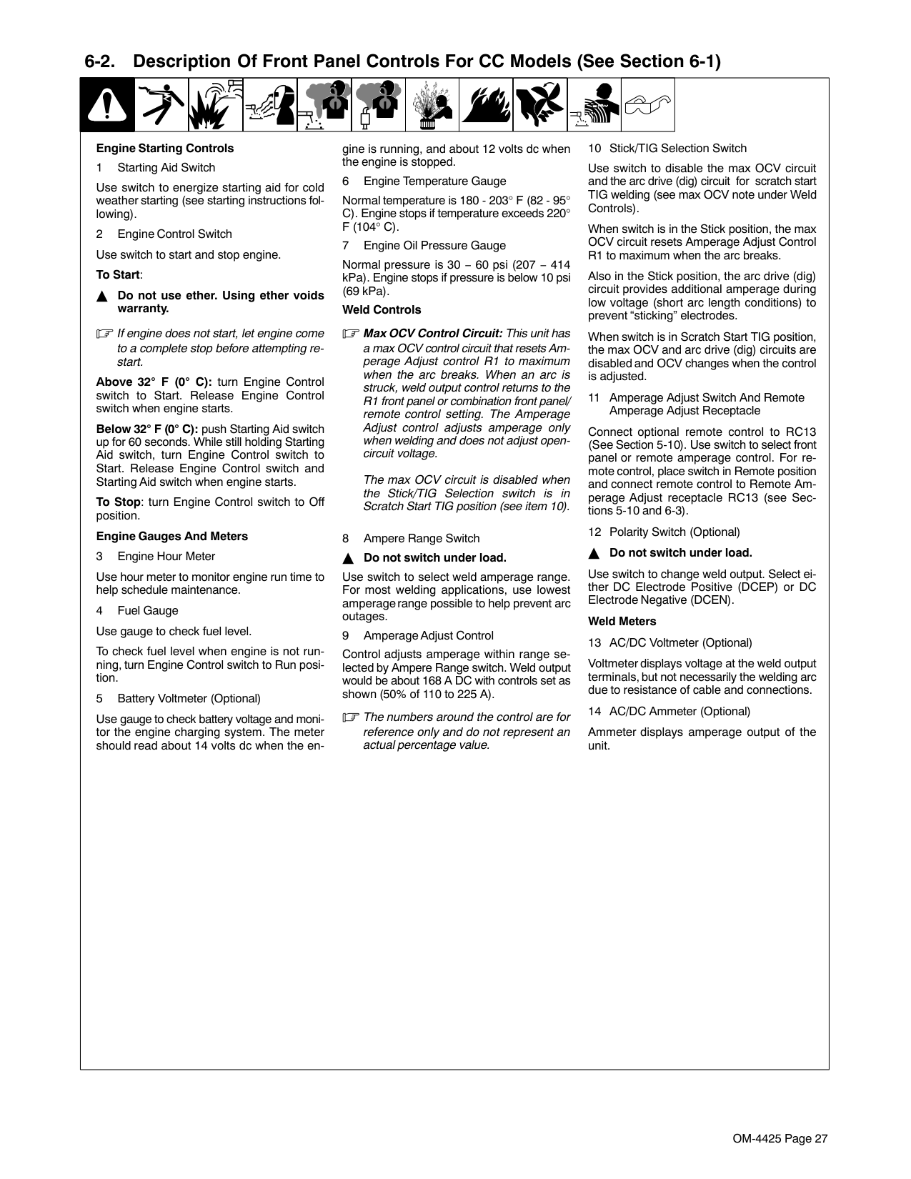26 . . . . . . . . . . . . . . . . . . . . . . . . . . . . . . . . 6-1. Front Panel Controls For CC Models (See Section 6-2) 26 . . . . . . . . . . . . . . . . . . . . . . . . . . . . . . . . . . . . . . 6-2. Description Of Front Panel Controls For CC Models (See Section 6-1) 27 . . . . . . . . . . . . . . . . . . . . . . . . . 6-3. Remote Amperage Control On CC Models (Optional) 28 . . . . . . . . . . . . . . . . . . . . . . . . . . . . . . . . . . . . . . . 6-4. Weld Control/Arc Condition Information Label 28 . . . . . . . . . . . . . . . . . . . . . . . . . . . . . . . . . . . . . . . . . . . . . .Table Of Contents