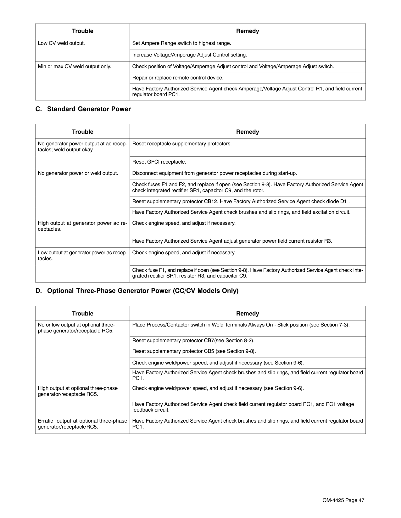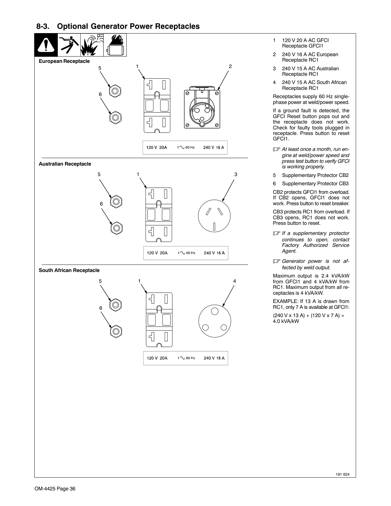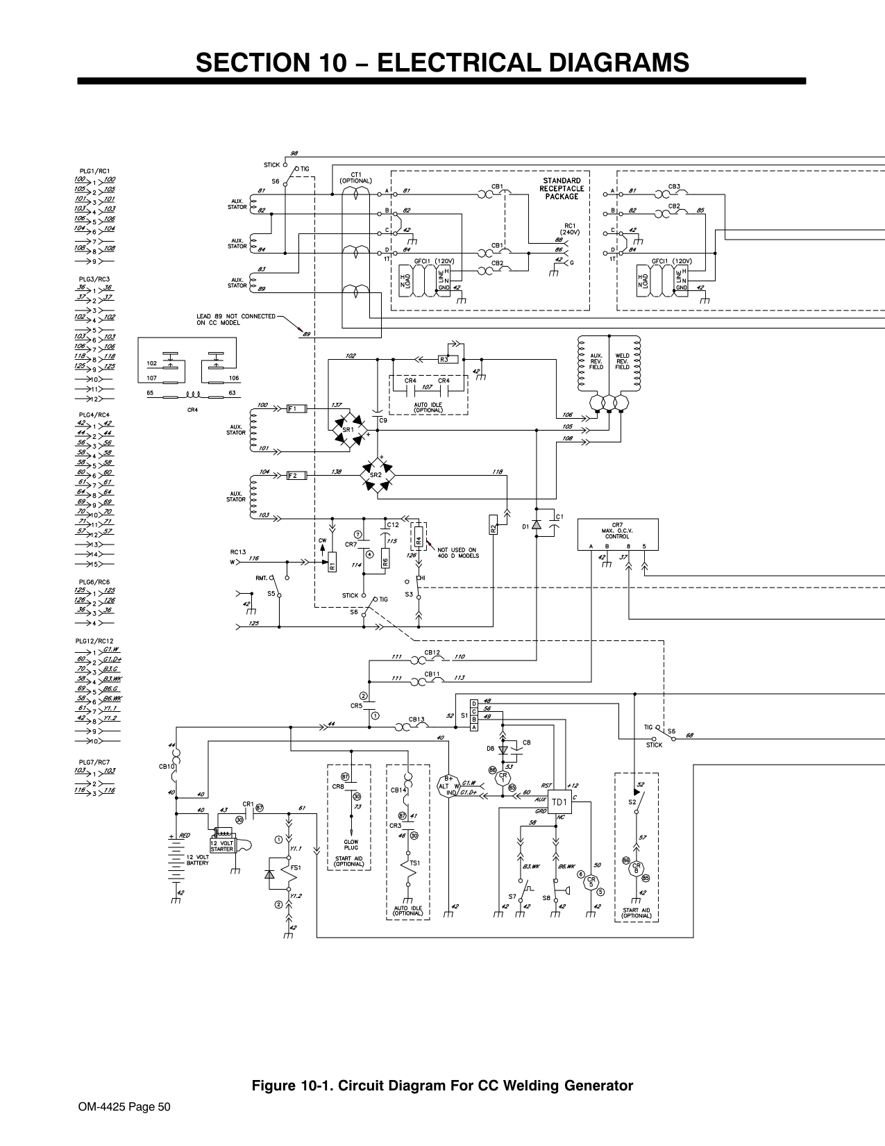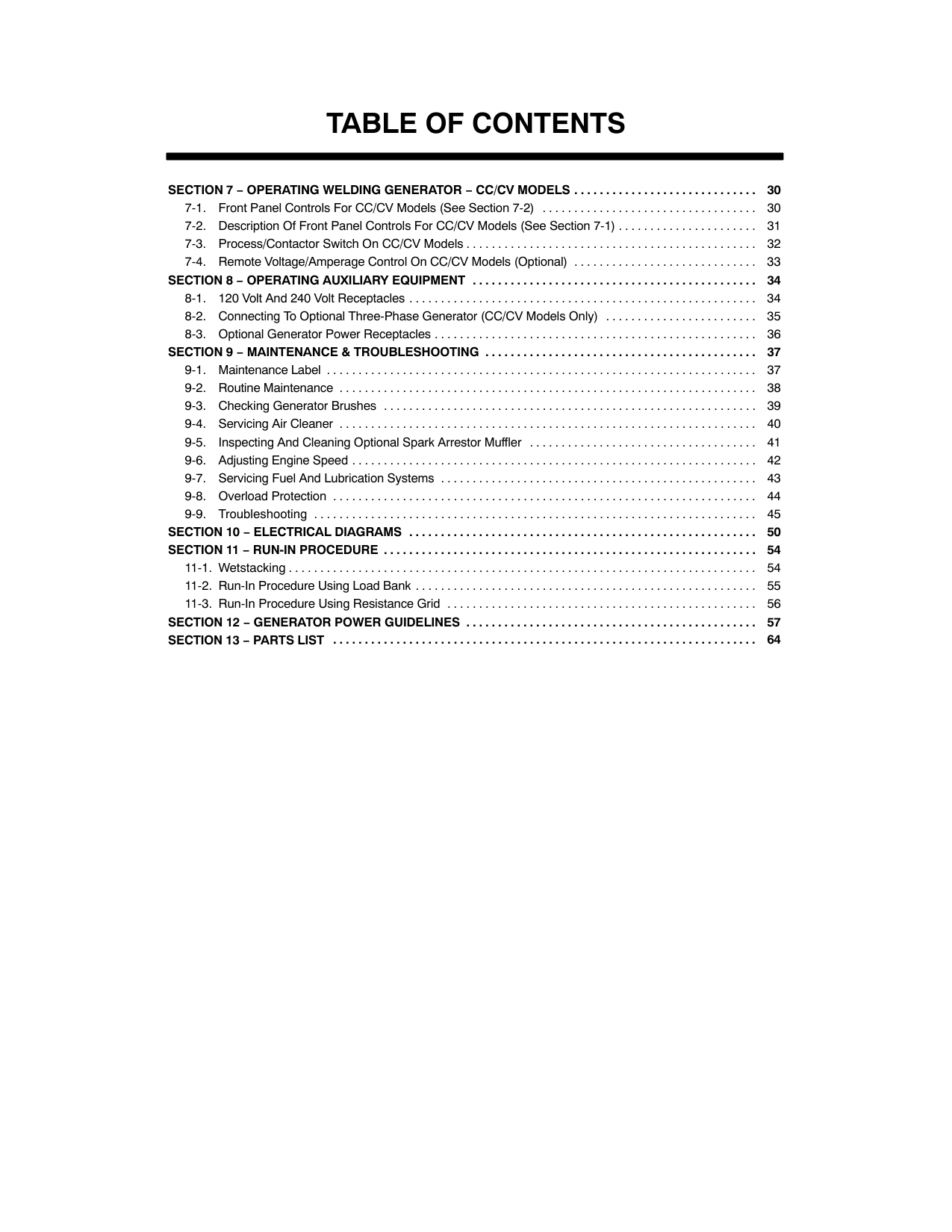 34 . . . . . . . . . . . . . . . . . . . . . . . . . . . . . . . . . . . . . . . . . . . . . 8-1. 120 Volt And 240 Volt Receptacles 34 . . . . . . . . . . . . . . . . . . . . . . . . . . . . . . . . . . . . . . . . . . . . . . . . . . . . . . . 8-2. Connecting To Optional Three-Phase Generator (CC/CV Models Only) 35 . . . . . . . . . . . . . . . . . . . . . . . . 8-3. Optional Generator Power Receptacles 36 . . . . . . . . . . . . . . . . . . . . . . . . . . . . . . . . . . . . . . . . . . . . . . . . . . .Section 9 − Maintenance & Troubleshooting