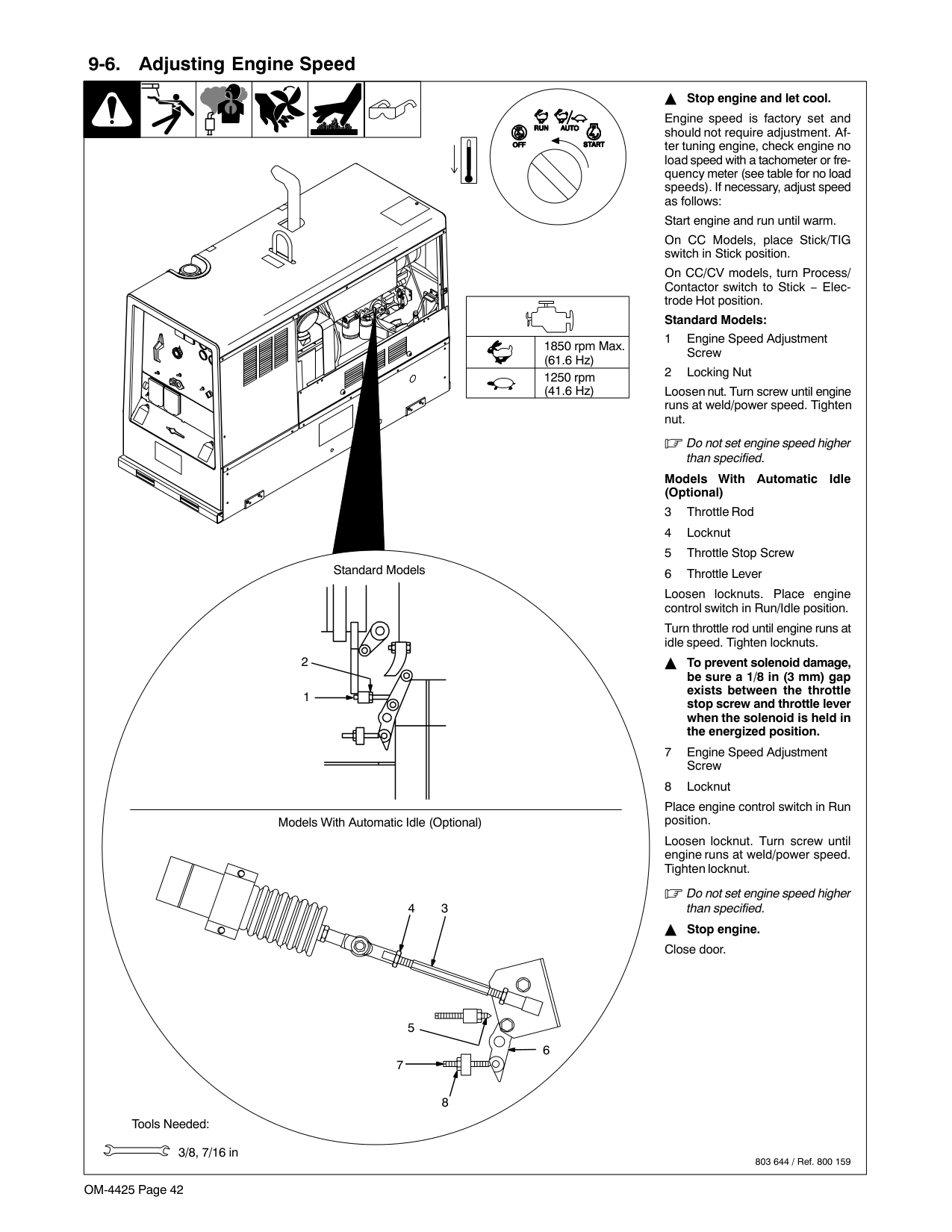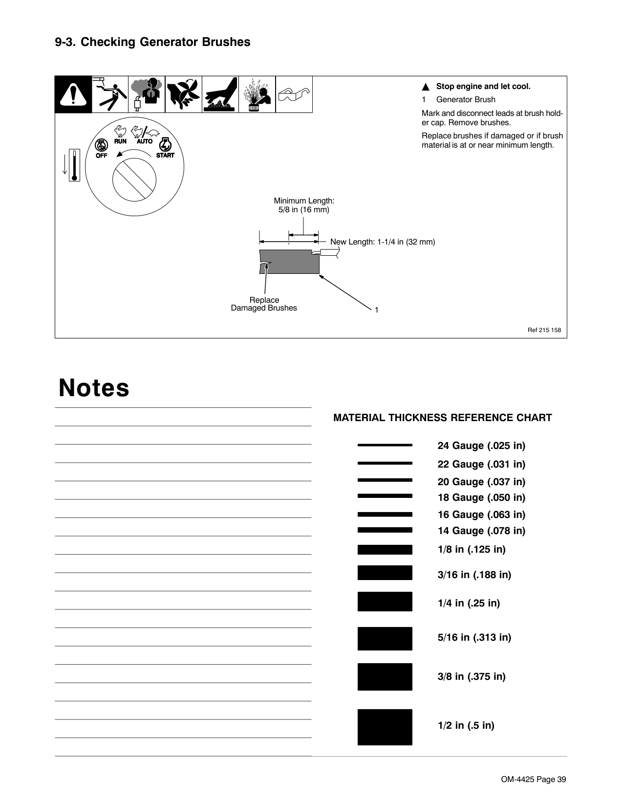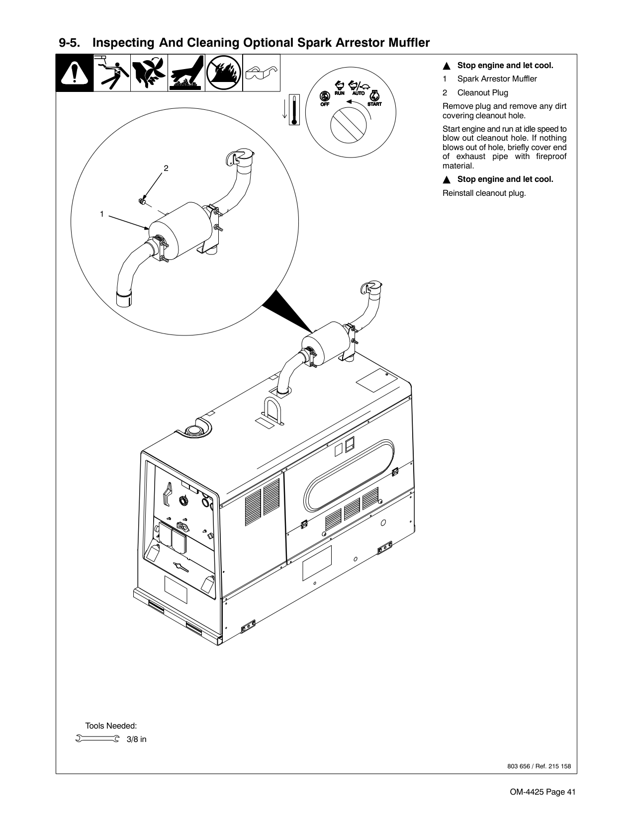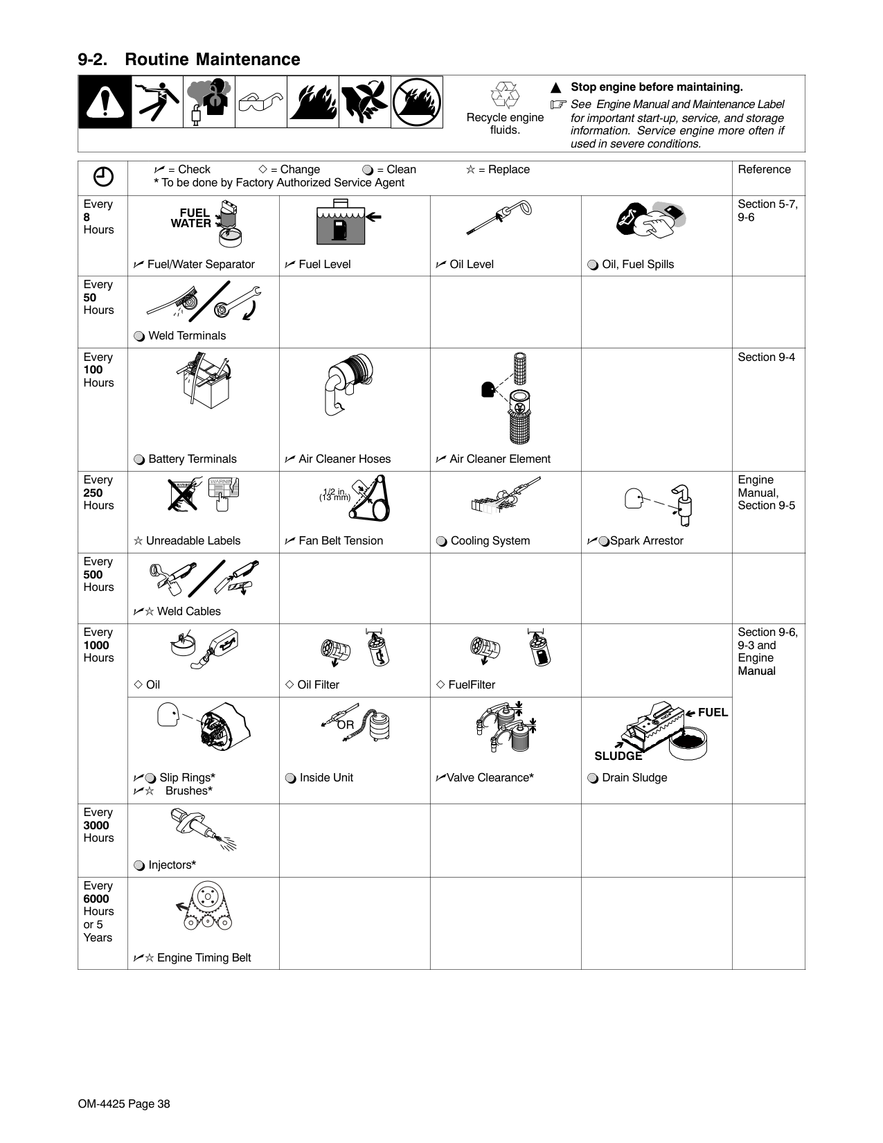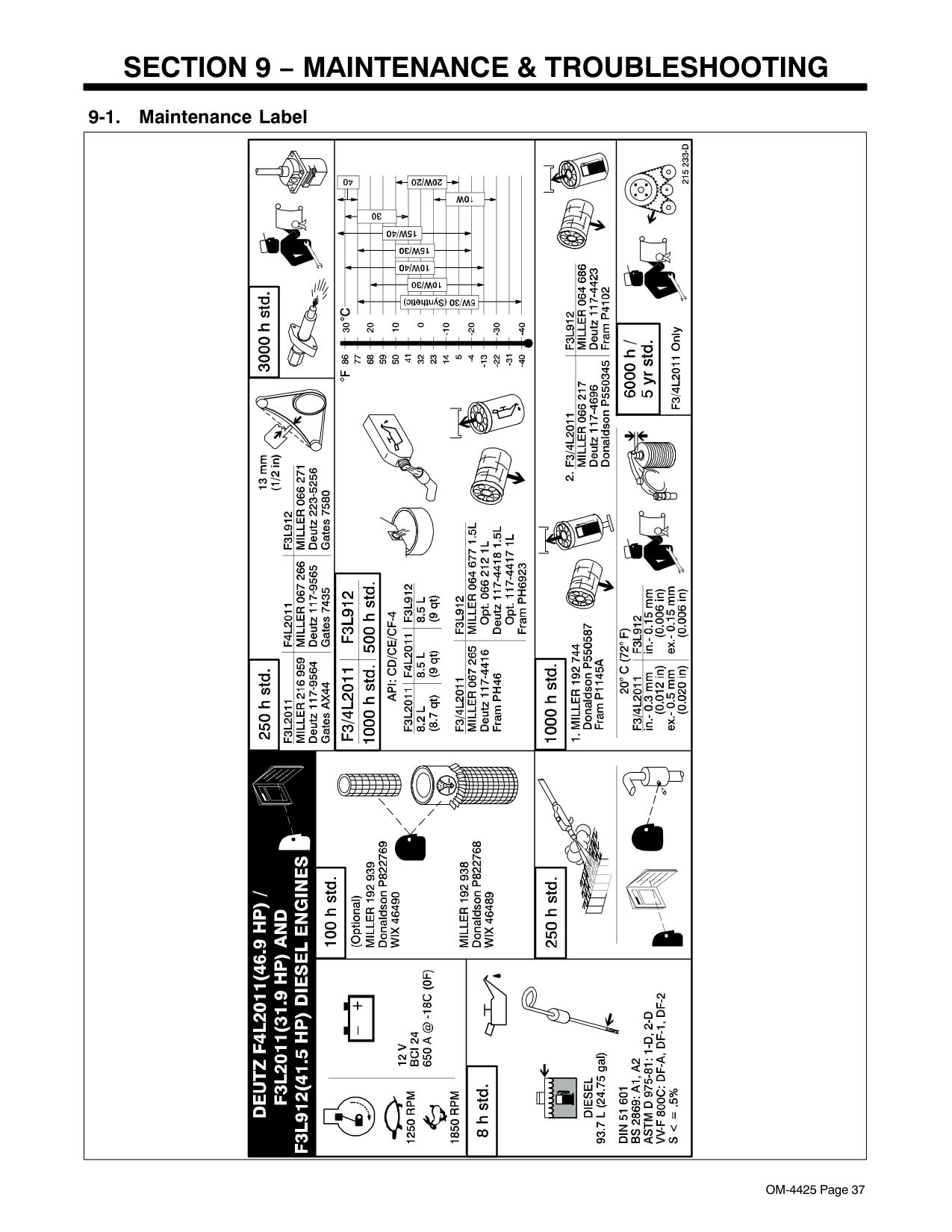 37 . . . . . . . . . . . . . . . . . . . . . . . . . . . . . . . . . . . . . . . . . . . 9-1. Maintenance Label 37 . . . . . . . . . . . . . . . . . . . . . . . . . . . . . . . . . . . . . . . . . . . . . . . . . . . . . . . . . . . . . . . . . . . . 9-2. Routine Maintenance 38 . . . . . . . . . . . . . . . . . . . . . . . . . . . . . . . . . . . . . . . . . . . . . . . . . . . . . . . . . . . . . . . . . . 9-3. Checking Generator Brushes 39 . . . . . . . . . . . . . . . . . . . . . . . . . . . . . . . . . . . . . . . . . . . . . . . . . . . . . . . . . . . 9-4. Servicing Air Cleaner 40 . . . . . . . . . . . . . . . . . . . . . . . . . . . . . . . . . . . . . . . . . . . . . . . . . . . . . . . . . . . . . . . . . . 9-5. Inspecting And Cleaning Optional Spark Arrestor Muffler 41 . . . . . . . . . . . . . . . . . . . . . . . . . . . . . . . . . . . . 9-6. Adjusting Engine Speed 42 . . . . . . . . . . . . . . . . . . . . . . . . . . . . . . . . . . . . . . . . . . . . . . . . . . . . . . . . . . . . . . . . 9-7. Servicing Fuel And Lubrication Systems 43 . . . . . . . . . . . . . . . . . . . . . . . . . . . . . . . . . . . . . . . . . . . . . . . . . . 9-8. Overload Protection 44 . . . . . . . . . . . . . . . . . . . . . . . . . . . . . . . . . . . . . . . . . . . . . . . . . . . . . . . . . . . . . . . . . . . 9-9. Troubleshooting 45 . . . . . . . . . . . . . . . . . . . . . . . . . . . . . . . . . . . . . . . . . . . . . . . . . . . . . . . . . . . . . . . . . . . . . .Section 10 − Electrical Diagrams