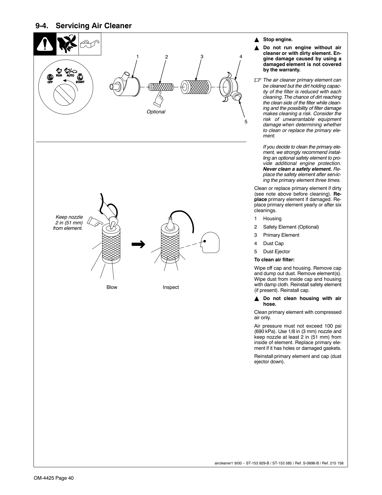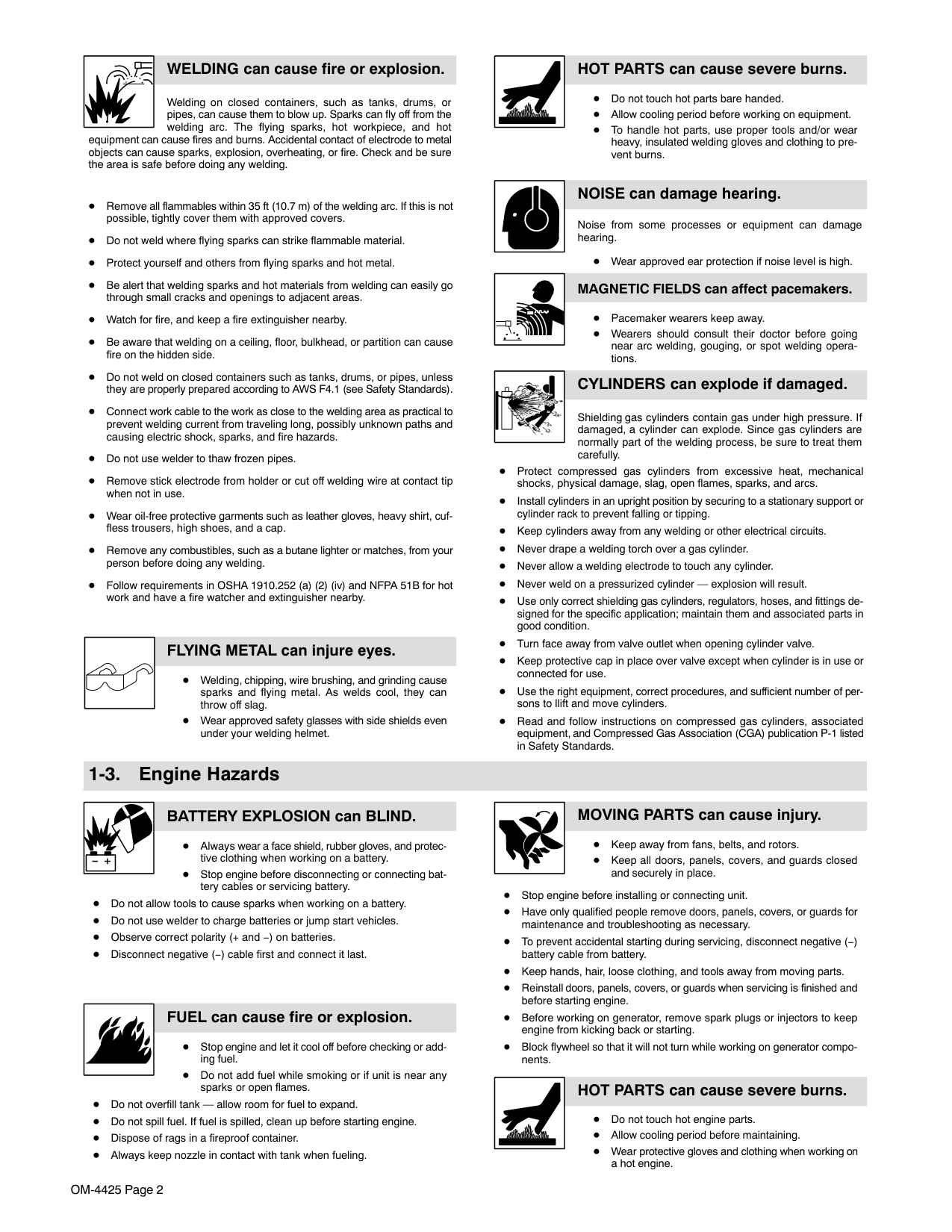 OM-4425 Page 3 STEAM AND HOT COOLANT can burn. If possible, check coolant level when engine is cold to avoid scalding. Always check coolant level at overflow tank, if pres- ent on unit, instead of radiator (unless told otherwise in maintenance section or engine manual). If the engine is warm, checking is needed, and there is no overflow tank, follow the next two statements. Wear safety glasses and gloves and put a rag over radiator cap. Turn cap slightly and let pressure escape slowly before completely re- moving cap. ENGINE EXHAUST GASES can kill. Use equipment outside in open, well-ventilated ar- eas. If used in a closed area, vent engine exhaust outside and away from any building air intakes. BATTERY ACID can BURN SKIN and EYES. Do not tip battery. Replace damaged battery. Flush eyes and skin immediately with water. ENGINE HEAT can cause fire. Do not locate unit on, over, or near combustible surfaces or flammables. Keep exhaust and exhaust pipes way from flam- mables. EXHAUST SPARKS can cause fire. Do not let engine exhaust sparks cause fire. Use approved engine exhaust spark arrestor in re- quired areas — see applicable codes. 1-4. Compressed Air Hazards BREATHING COMPRESSED AIR can cause serious injury or death. Do not use compressed air for breathing. Use only for cutting, gouging, and tools. COMPRESSED AIR can cause injury. Wear approved safety goggles. Do not direct air stream toward self or others.