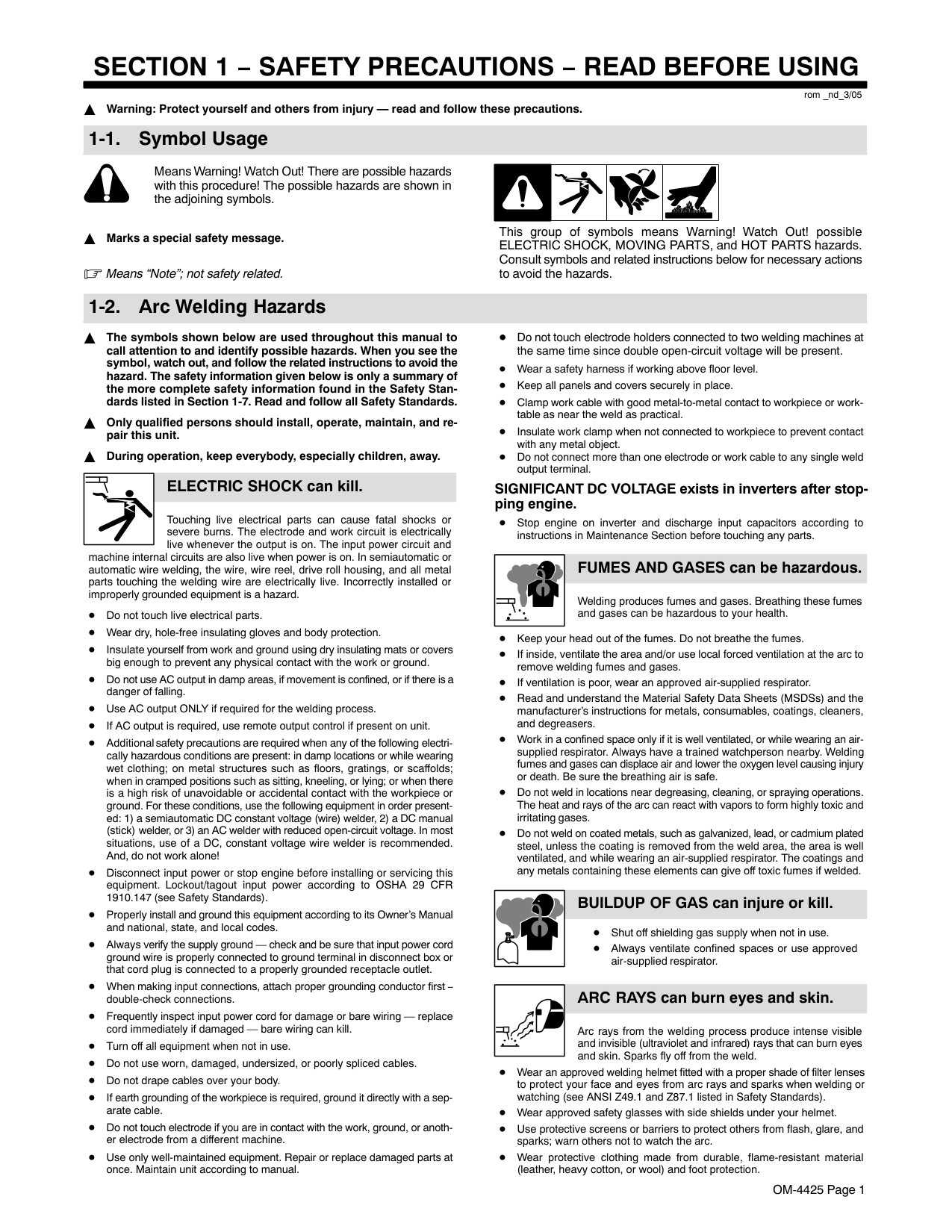 rom _nd_3/05 Warning: Protect yourself and others from injury — read and follow these precautions. 1-1. Symbol Usage Means Warning! Watch Out! There are possible hazards with this procedure! The possible hazards are shown in the adjoining symbols. Marks a special safety message. Means “Note”; not safety related. This group of symbols means Warning! Watch Out! possible ELECTRIC SHOCK, MOVING PARTS, and HOT PARTS hazards. Consult symbols and related instructions below for necessary actions to avoid the hazards. 1-2. Arc Welding Hazards The symbols shown below are used throughout this manual to call attention to and identify possible hazards. When you see the symbol, watch out, and follow the related instructions to avoid the hazard. The safety information given below is only a summary of the more complete safety information found in the Safety Stan- dards listed in Section 1-7. Read and follow all Safety Standards. Only qualified persons should install, operate, maintain, and re- pair this unit. During operation, keep everybody, especially children, away. Touching live electrical parts can cause fatal shocks or severe burns. The electrode and work circuit is electrically live whenever the output is on. The input power circuit and machine internal circuits are also live when power is on. In semiautomatic or automatic wire welding, the wire, wire reel, drive roll housing, and all metal parts touching the welding wire are electrically live. Incorrectly installed or improperly grounded equipment is a hazard. ELECTRIC SHOCK can kill. Do not touch live electrical parts. Wear dry, hole-free insulating gloves and body protection. Insulate yourself from work and ground using dry insulating mats or covers big enough to prevent any physical contact with the work or ground. Do not use AC output in damp areas, if movement is confined, or if there is a danger of falling. Use AC output ONLY if required for the welding process. If AC output is required, use remote output control if present on unit. Additional safety precautions are required when any of the following electri- cally hazardous conditions are present: in damp locations or while wearing wet clothing; on metal structures such as floors, gratings, or scaffolds; when in cramped positions such as sitting, kneeling, or lying; or when there is a high risk of unavoidable or accidental contact with the workpiece or ground. For these conditions, use the following equipment in order present- ed: 1) a semiautomatic DC constant voltage (wire) welder, 2) a DC manual (stick) welder, or 3) an AC welder with reduced open-circuit voltage. In most situations, use of a DC, constant voltage wire welder is recommended. And, do not work alone! Disconnect input power or stop engine before installing or servicing this equipment. Lockout/tagout input power according to OSHA 29 CFR 1910.147 (see Safety Standards). Properly install and ground this equipment according to its Owner’s Manual and national, state, and local codes. Always verify the supply ground — check and be sure that input power cord ground wire is properly connected to ground terminal in disconnect box or that cord plug is connected to a properly grounded receptacle outlet. When making input connections, attach proper grounding conductor first − double-check connections. Frequently inspect input power cord for damage or bare wiring — replace cord immediately if damaged — bare wiring can kill. Turn off all equipment when not in use. Do not use worn, damaged, undersized, or poorly spliced cables. Do not drape cables over your body. If earth grounding of the workpiece is required, ground it directly with a sep- arate cable. Do not touch electrode if you are in contact with the work, ground, or anoth- er electrode from a different machine. Use only well-maintained equipment. Repair or replace damaged parts at once. Maintain unit according to manual. Do not touch electrode holders connected to two welding machines at the same time since double open-circuit voltage will be present. Wear a safety harness if working above floor level. Keep all panels and covers securely in place. Clamp work cable with good metal-to-metal contact to workpiece or work- table as near the weld as practical. Insulate work clamp when not connected to workpiece to prevent contact with any metal object. Do not connect more than one electrode or work cable to any single weld output terminal. SIGNIFICANT DC VOLTAGE exists in inverters after stop- ping engine. Stop engine on inverter and discharge input capacitors according to instructions in Maintenance Section before touching any parts. Welding produces fumes and gases. Breathing these fumes and gases can be hazardous to your health. FUMES AND GASES can be hazardous. Keep your head out of the fumes. Do not breathe the fumes. If inside, ventilate the area and/or use local forced ventilation at the arc to remove welding fumes and gases. If ventilation is poor, wear an approved air-supplied respirator. Read and understand the Material Safety Data Sheets (MSDSs) and the manufacturer’s instructions for metals, consumables, coatings, cleaners, and degreasers. Work in a confined space only if it is well ventilated, or while wearing an air- supplied respirator. Always have a trained watchperson nearby. Welding fumes and gases can displace air and lower the oxygen level causing injury or death. Be sure the breathing air is safe. Do not weld in locations near degreasing, cleaning, or spraying operations. The heat and rays of the arc can react with vapors to form highly toxic and irritating gases. Do not weld on coated metals, such as galvanized, lead, or cadmium plated steel, unless the coating is removed from the weld area, the area is well ventilated, and while wearing an air-supplied respirator. The coatings and any metals containing these elements can give off toxic fumes if welded. BUILDUP OF GAS can injure or kill. Shut off shielding gas supply when not in use. Always venti