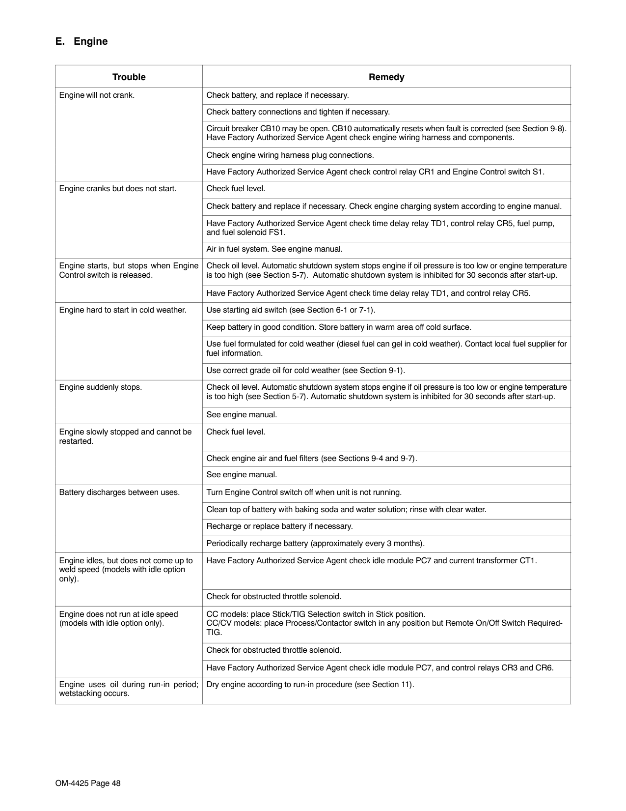 Stop Engine Fast (Run, Weld/ Power) Slow (Idle) Start Engine Starting Aid Battery (Engine) Engine Oil Pressure Engine Oil Check Injectors/ Pump Check Valve Clearance Fuel Protective Earth (Ground) Positive Negative Certified/Trained Mechanic Welding ArcA