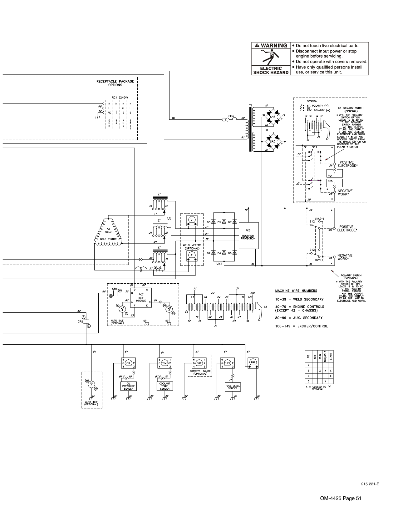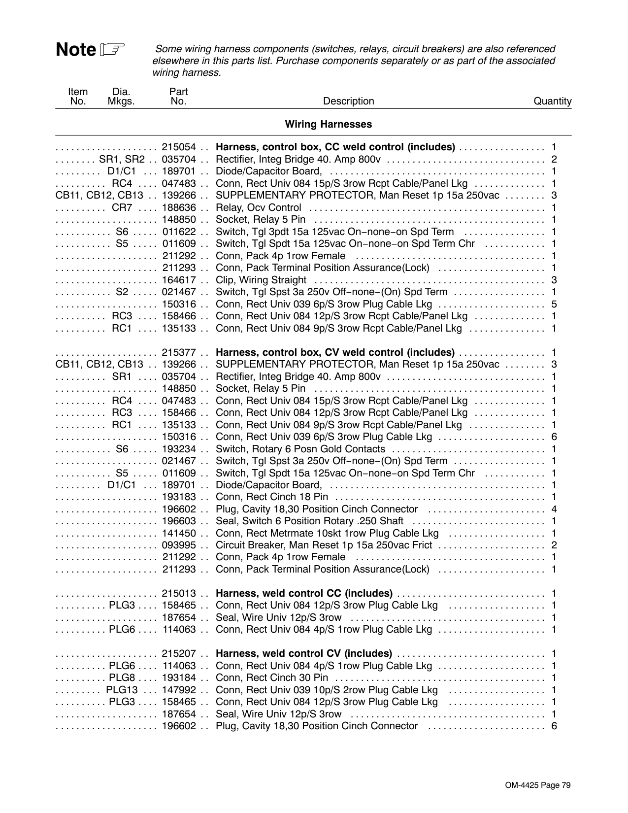 208 335 DIODE, rect 275A 300V RP 3 . . . . . . . . . . . . . . . . . . . . . . . . . . . . . . . . . . . . . . . . . . . . . To maintain the factory original performance of your equipment, use only Manufacturer’s Suggested Replacement Parts. Model and serial number required when ordering parts from your local distributor.OM-4425 Page 79 Some wiring harness components (switches, relays, circuit breakers) are also referenced elsewhere in this parts list. Purchase components separately or as part of the associated wiring harness. Note Description Part No. Dia. Mkgs. Item No. Wiring Harnesses Quantity 215054 Harness, control box, CC weld control (includes) 1 . . . . . . . . . . . . . . . . . . . . . . . . . . . . . . . . . . . . . . .