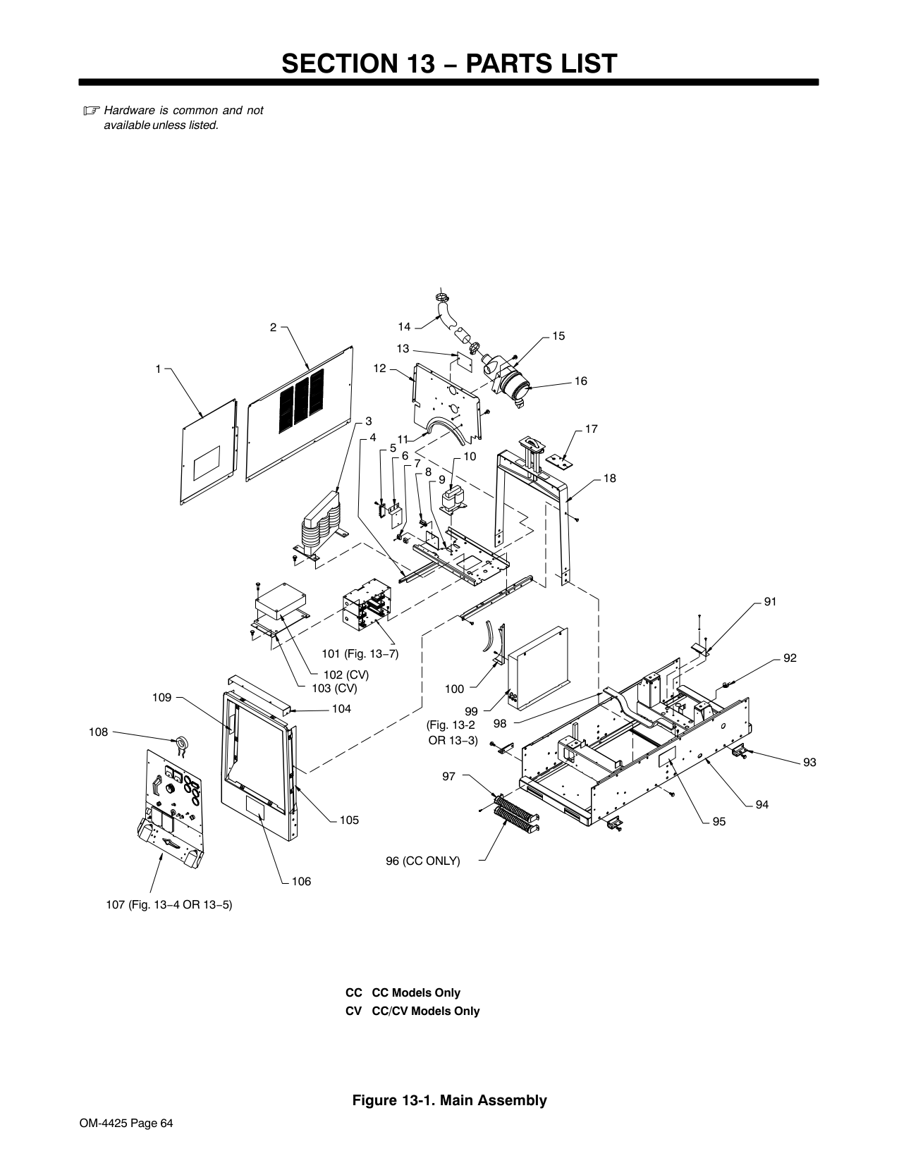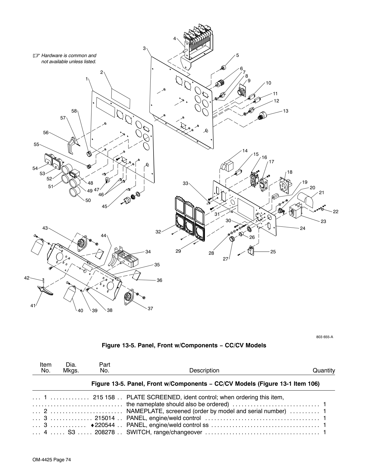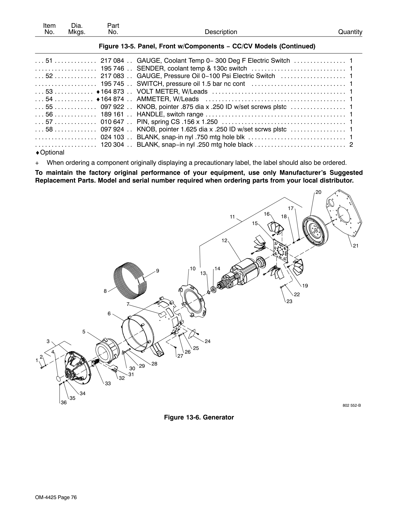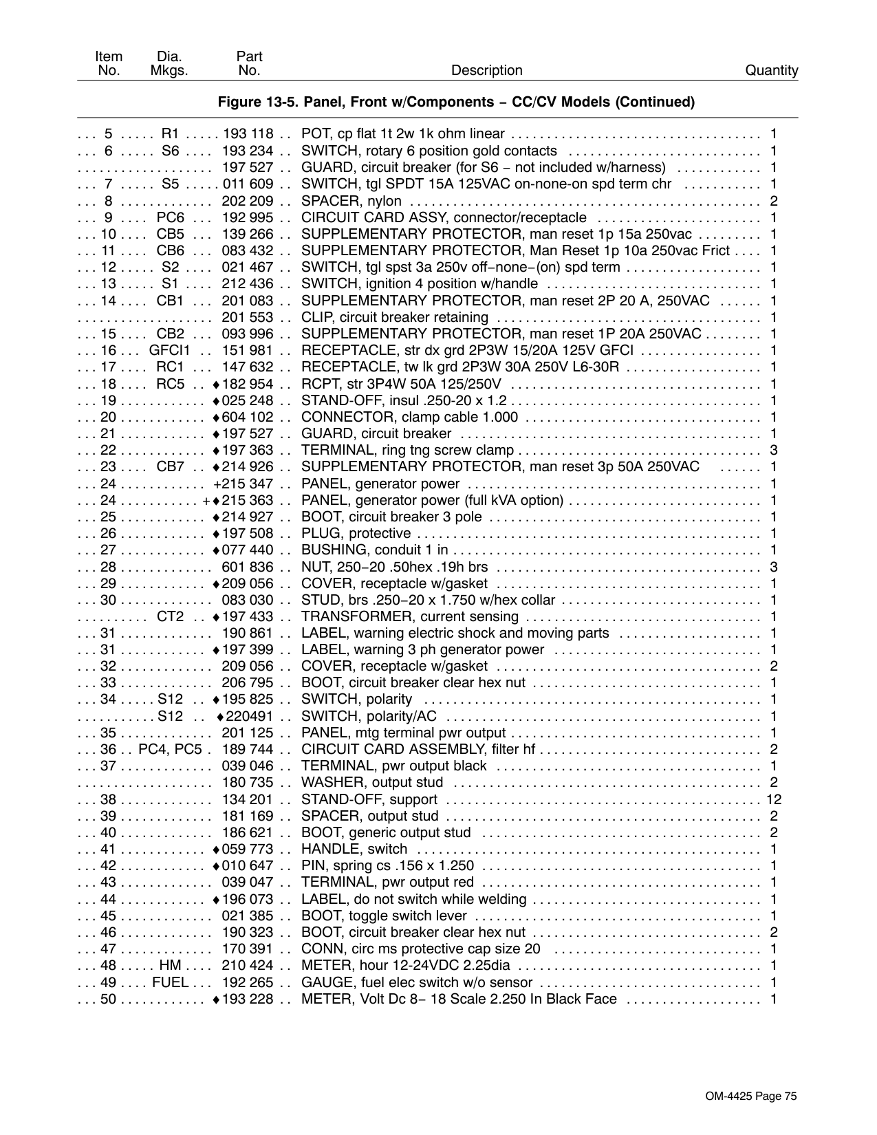 192 265 GAUGE, fuel elec switch w/o sensor 1 . . . . . . . . . . . . . . . . . . . . . . . . . . . . . . . . . . . . . . . . . . . 50 ♦193 228 METER, Volt Dc 8− 18 Scale 2.250 In Black Face 1 . . . . . . . . . . . . . . . . . . . . . . . . . . . . . . . . . . . .OM-4425 Page 76 Description Part No. Dia. Mkgs. Item No. Figure 13-5. Panel, Front w/Components − CC/CV Models (Continued) Quantity 51 217 084 GAUGE, Coolant Temp 0− 300 Deg F Electric Switch 1 . . . . . . . . . . . . . . . . . . . . . . . . . . . . . . . . . . 195 746 SENDER, coolant temp & 130c switch 1 . . . . . . . . . . . . . . . . . . . . . . . . . . . . . . . . . . . . . . . . . . . . . . . . . . 52 217 083 GAUGE, Pressure Oil 0−100 Psi Electric Switch 1 . . . . . . . . . . . . . . . . . . . . . . . . . . . . . . . . . . . . . . 195 745 SWITCH, pressure oil 1.5 bar nc cont 1 . . . . . . . . . . . . . . . . . . . . . . . . . . . . . . . . . . . . . . . . . . . . . . . . . . 53 ♦164 873 VOLT METER, W/Leads 1 . . . . . . . . . . . . . . . . . . . . . . . . . . . . . . . . . . . . . . . . . . . . . . . . . . . . . . . . . . 54 ♦164 874 AMMETER, W/Leads 1 . . . . . . . . . . . . . . . . . . . . . . . . . . . . . . . . . . . . . . . . . . . . . . . . . . . . . . . . . . . . 55 097 922 KNOB, pointer .875 dia x .250 ID w/set screws plstc 1 . . . . . . . . . . . . . . . . . . . . . . . . . . . . . . . . . . . 56 189 161 HANDLE, switch range 1 . . . . . . . . . . . . . . . . . . . . . . . . . . . . . . . . . . . . . . . . . . . . . . . . . . . . . . . . . . . . . 57 010 647 PIN, spring CS .156 x 1.250 1 . . . . . . . . . . . . . . . . . . . . . . . . . . . . . . . . . . . . . . . . . . . . . . . . . . . . . . . . 58 097 924 KNOB, pointer 1.625 dia x .250 ID w/set scrws plstc 1 . . . . . . . . . . . . . . . . . . . . . . . . . . . . . . . . . . . 024 103 BLANK, snap-in nyl .750 mtg hole blk 1 . . . . . . . . . . . . . . . . . . . . . . . . . . . . . . . . . . . . . . . . . . . . . . . . . . . 120 304 BLANK, snap−in nyl .250 mtg hole black 2 . . . . . . . . . . . . . . . . . . . . . . . . . . . . . . . . . . . . . . . . . . . . . . . . . ♦Optional + When ordering a component originally displaying a precautionary label, the label should also be ordered. To maintain the factory original performance of your equipment, use only Manufacturer’s Suggested Replacement Parts. Model and serial number required when ordering parts from your local distributor.