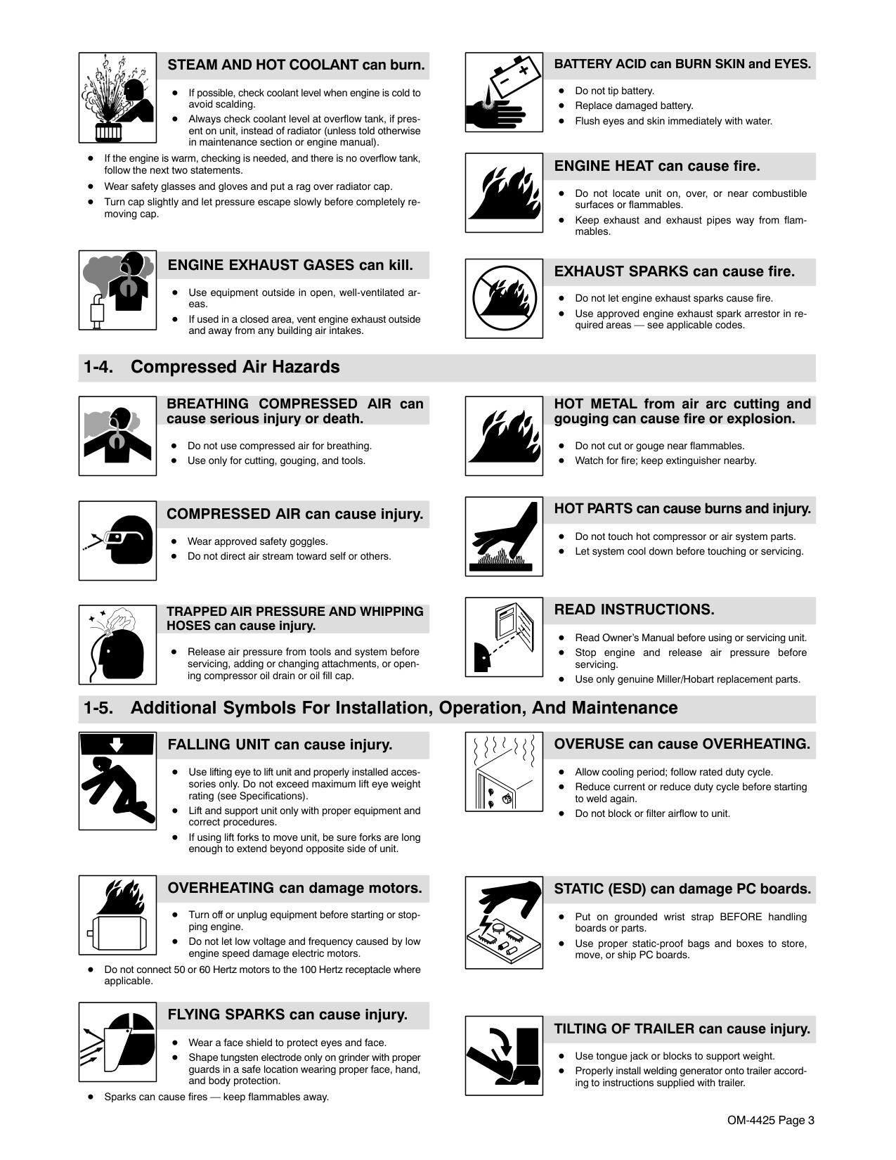 Read Owner’s Manual before using or servicing unit. Stop engine and release air pressure before servicing. Use only genuine Miller/Hobart replacement parts. 1-5. Additional Symbols For Installation, Operation, And Maintenance FALLING UNIT can cause injury. Use lifting eye to lift unit and properly installed acces- sories only. Do not exceed maximum lift eye weight rating (see Specifications). Lift and support unit only with proper equipment and correct procedures. If using lift forks to move unit, be sure forks are long enough to extend beyond opposite side of unit. OVERHEATING can damage motors. Turn off or unplug equipment before starting or stop- ping engine. Do not let low voltage and frequency caused by low engine speed damage electric motors. Do not connect 50 or 60 Hertz motors to the 100 Hertz receptacle where applicable. FLYING SPARKS can cause injury. Wear a face shield to protect eyes and face. Shape tungsten electrode only on grinder with proper guards in a safe location wearing proper face, hand, and body protection. Sparks can cause fires — keep flammables away. OVERUSE can cause OVERHEATING. Allow cooling period; follow rated duty cycle. Reduce current or reduce duty cycle before starting to weld again. Do not block or filter airflow to unit. STATIC (ESD) can damage PC boards. Put on grounded wrist strap BEFORE handling boards or parts. Use proper static-proof bags and boxes to store, move, or ship PC boards. TILTING OF TRAILER can cause injury. Use tongue jack or blocks to support weight. Properly install welding generator onto trailer accord- ing to instructions supplied with trailer.OM-4425 Page 4