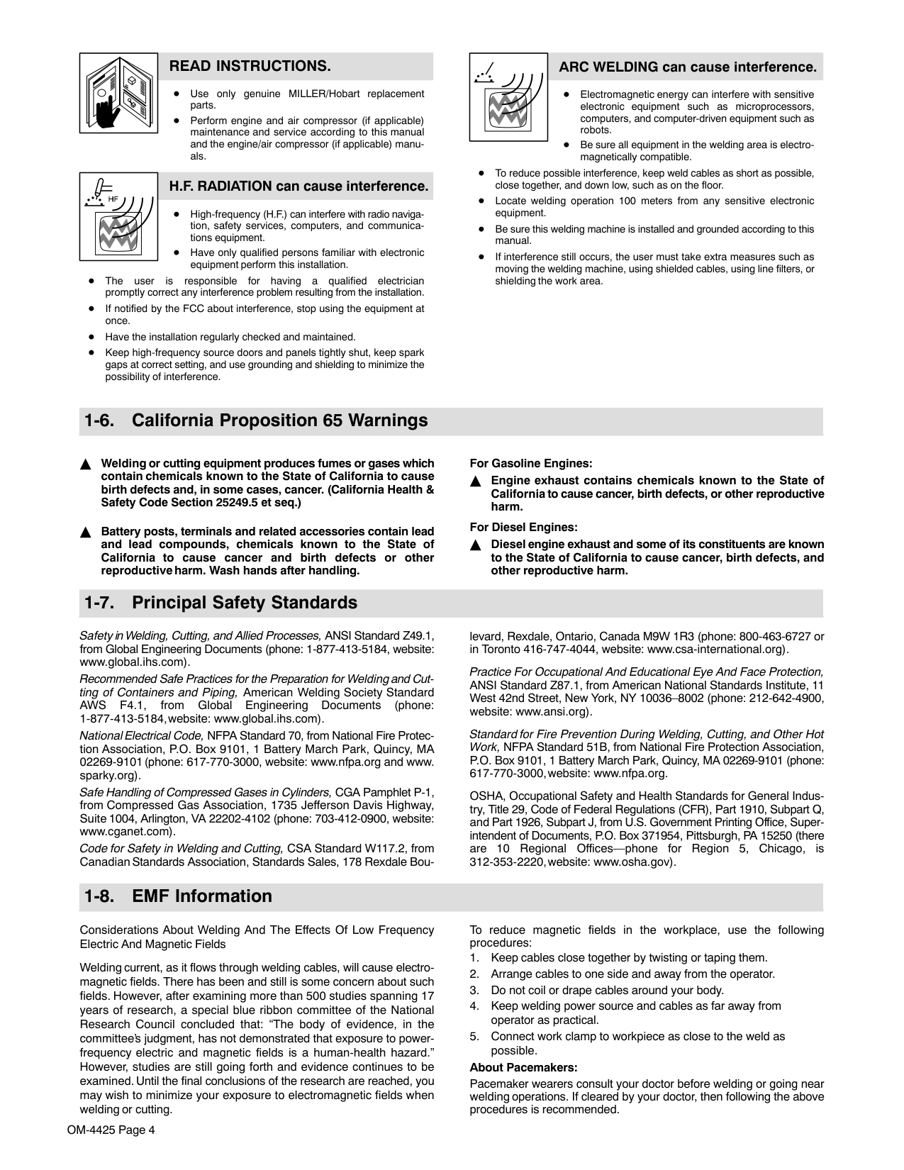 Use only genuine MILLER/Hobart replacement parts. Perform engine and air compressor (if applicable) maintenance and service according to this manual and the engine/air compressor (if applicable) manu- als. H.F. RADIATION can cause interference. High-frequency (H.F.) can interfere with radio naviga- tion, safety services, computers, and communica- tions equipment. Have only qualified persons familiar with electronic equipment perform this installation. The user is responsible for having a qualified electrician promptly correct any interference problem resulting from the installation. If notified by the FCC about interference, stop using the equipment at once. Have the installation regularly checked and maintained. Keep high-frequency source doors and panels tightly shut, keep spark gaps at correct setting, and use grounding and shielding to minimize the possibility of interference. ARC WELDING can cause interference. Electromagnetic energy can interfere with sensitive electronic equipment such as microprocessors, computers, and computer-driven equipment such as robots. Be sure all equipment in the welding area is electro- magnetically compatible. To reduce possible interference, keep weld cables as short as possible, close together, and down low, such as on the floor. Locate welding operation 100 meters from any sensitive electronic equipment. Be sure this welding machine is installed and grounded according to this manual. If interference still occurs, the user must take extra measures such as moving the welding machine, using shielded cables, using line filters, or shielding the work area. 1-6. California Proposition 65 Warnings Welding or cutting equipment produces fumes or gases which contain chemicals known to the State of California to cause birth defects and, in some cases, cancer. (California Health & Safety Code Section 25249.5 et seq.) Battery posts, terminals and related accessories contain lead and lead compounds, chemicals known to the State of California to cause cancer and birth defects or other reproductive harm. Wash hands after handling. For Gasoline Engines: Engine exhaust contains chemicals known to the State of California to cause cancer, birth defects, or other reproductive harm. For Diesel Engines: Diesel engine exhaust and some of its constituents are known to the State of California to cause cancer, birth defects, and other reproductive harm. 1-7. Principal Safety Standards Safety in Welding, Cutting, and Allied Processes, ANSI Standard Z49.1, from Global Engineering Documents (phone: 1-877-413-5184, website: www.global.ihs.com). Recommended Safe Practices for the Preparation for Welding and Cut- ting of Containers and Piping, American Welding Society StandardAws