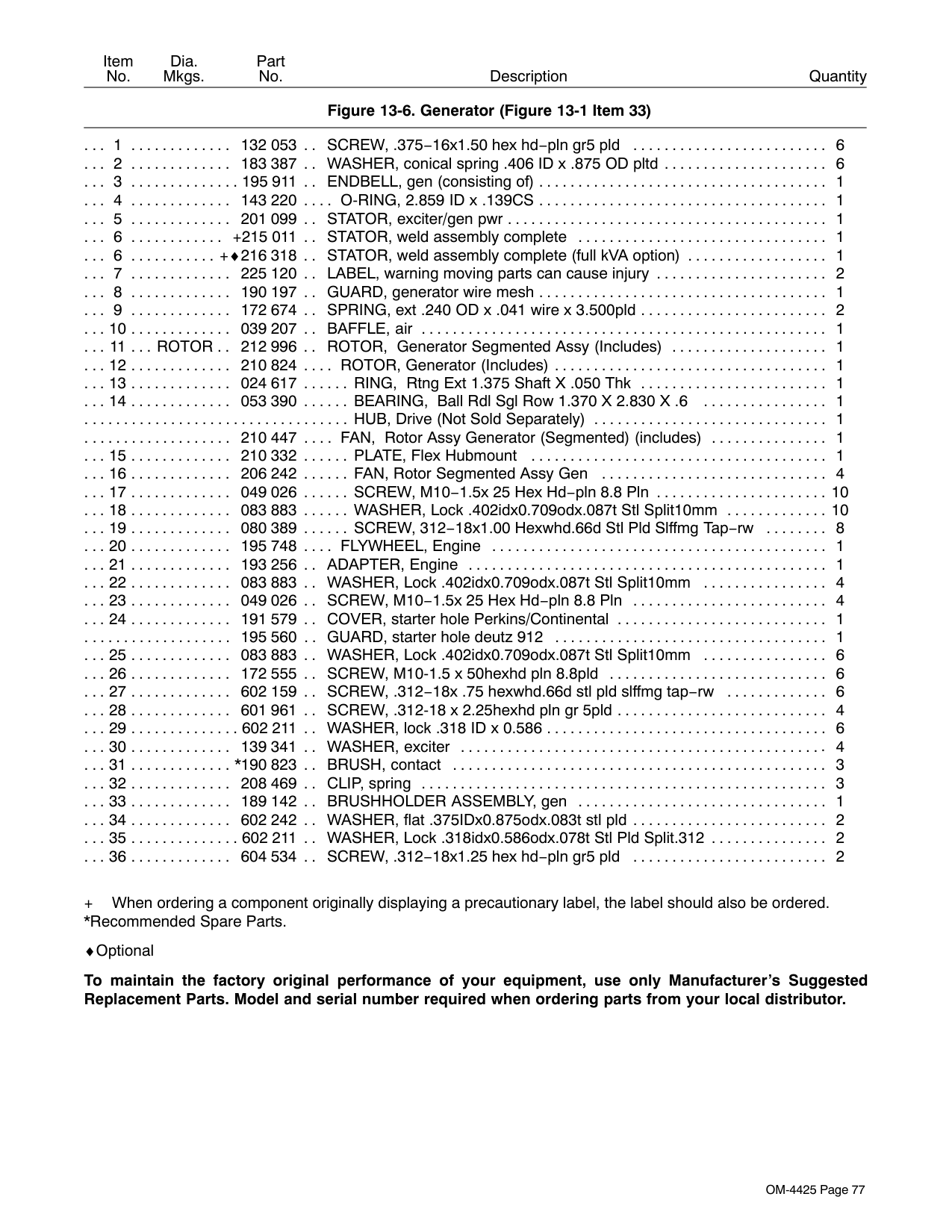 212 996 ROTOR, Generator Segmented Assy (Includes) 1 . . . . . . . . . . . . . . . . . . . . . . . . . . . . . . 12 210 824 ROTOR, Generator (Includes) 1 . . . . . . . . . . . . . . . . . . . . . . . . . . . . . . . . . . . . . . . . . . . . . . . . . . . . . . . 13 024 617 RING, Rtng Ext 1.375 Shaft X .050 Thk 1 . . . . . . . . . . . . . . . . . . . . . . . . . . . . . . . . . . . . . . . . . . . . . . 14 053 390 BEARING, Ball Rdl Sgl Row 1.370 X 2.830 X .6 1 . . . . . . . . . . . . . . . . . . . . . . . . . . . . . . . . . . . . . . HUB, Drive (Not Sold Separately) 1 . . . . . . . . . . . . . . . . . . . . . . . . . . . . . . . . . . . . . . . . . . . . . . . . . . . . . . . . . . . . . . . . 210 447 FAN, Rotor Assy Generator (Segmented) (includes) 1 . . . . . . . . . . . . . . . . . . . . . . . . . . . . . . . . . . . . . . 15 210 332 PLATE, Flex Hubmount 1 . . . . . . . . . . . . . . . . . . . . . . . . . . . . . . . . . . . . . . . . . . . . . . . . . . . . . . . . . . . . 16 206 242 FAN, Rotor Segmented Assy Gen 4 . . . . . . . . . . . . . . . . . . . . . . . . . . . . . . . . . . . . . . . . . . . . . . . . . . . 17 049 026 SCREW, M10−1.5x 25 Hex Hd−pln 8.8 Pln 10 . . . . . . . . . . . . . . . . . . . . . . . . . . . . . . . . . . . . . . . . . . . . 18 083 883 WASHER, Lock .402idx0.709odx.087t Stl Split10mm 10 . . . . . . . . . . . . . . . . . . . . . . . . . . . . . . . . . . . 19 080 389 SCREW, 312−18x1.00 Hexwhd.66d Stl Pld Slffmg Tap−rw 8 . . . . . . . . . . . . . . . . . . . . . . . . . . . . . . 20 195 748 FLYWHEEL, Engine 1 . . . . . . . . . . . . . . . . . . . . . . . . . . . . . . . . . . . . . . . . . . . . . . . . . . . . . . . . . . . . . . . 21 193 256 ADAPTER, Engine 1 . . . . . . . . . . . . . . . . . . . . . . . . . . . . . . . . . . . . . . . . . . . . . . . . . . . . . . . . . . . . . . . . 22 083 883 WASHER, Lock .402idx0.709odx.087t Stl Split10mm 4 . . . . . . . . . . . . . . . . . . . . . . . . . . . . . . . . . . 23 049 026 SCREW, M10−1.5x 25 Hex Hd−pln 8.8 Pln 4 . . . . . . . . . . . . . . . . . . . . . . . . . . . . . . . . . . . . . . . . . . . 24 191 579 COVER, starter hole Perkins/Continental 1 . . . . . . . . . . . . . . . . . . . . . . . . . . . . . . . . . . . . . . . . . . . . . 195 560 GUARD, starter hole deutz 912 1 . . . . . . . . . . . . . . . . . . . . . . . . . . . . . . . . . . . . . . . . . . . . . . . . . . . . . . . . 25 083 883 WASHER, Lock .402idx0.709odx.087t Stl Split10mm 6 . . . . . . . . . . . . . . . . . . . . . . . . . . . . . . . . . . 26 172 555 SCREW, M10-1.5 x 50hexhd pln 8.8pld 6 . . . . . . . . . . . . . . . . . . . . . . . . . . . . . . . . . . . . . . . . . . . . . . 27 602 159 SCREW, .312−18x .75 hexwhd.66d stl pld slffmg tap−rw 6 . . . . . . . . . . . . . . . . . . . . . . . . . . . . . . . 28 601 961 SCREW, .312-18 x 2.25hexhd pln gr 5pld 4 . . . . . . . . . . . . . . . . . . . . . . . . . . . . . . . . . . . . . . . . . . . . . 29 602 211 WASHER, lock .318 ID x 0.586 6 . . . . . . . . . . . . . . . . . . . . . . . . . . . . . . . . . . . . . . . . . . . . . . . . . . . . . . . 30 139 341 WASHER, exciter 4 . . . . . . . . . . . . . . . . . . . . . . . . . . . . . . . . . . . . . . . . . . . . . . . . . . . . . . . . . . . . . . . . . 31 *190 823 BRUSH, contact 3 . . . . . . . . . . . . . . . . . . . . . . . . . . . . . . . . . . . . . . . . . . . . . . . . . . . . . . . . . . . . . . . . . . 32 208 469 CLIP, spring 3 . . . . . . . . . . . . . . . . . . . . . . . . . . . . . . . . . . . . . . . . . . . . . . . . . . . . . . . . . . . . . . . . . . . . . . 33 189 142 BRUSHHOLDER ASSEMBLY, gen 1 . . . . . . . . . . . . . . . . . . . . . . . . . . . . . . . . . . . . . . . . . . . . . . . . . . 34 602 242 WASHER, flat .375IDx0.875odx.083t stl pld 2 . . . . . . . . . . . . . . . . . . . . . . . . . . . . . . . . . . . . . . . . . . . 35 602 211 WASHER, Lock .318idx0.586odx.078t Stl Pld Split.312 2 . . . . . . . . . . . . . . . . . . . . . . . . . . . . . . . . . . 36 604 534 SCREW, .312−18x1.25 hex hd−pln gr5 pld 2 . . . . . . . . . . . . . . . . . . . . . . . . . . . . . . . . . . . . . . . . . . . + When ordering a component originally displaying a precautionary label, the label should also be ordered. *Recommended Spare Parts. ♦Optional To maintain the factory original performance of your equipment, use only Manufacturer’s Suggested Replacement Parts. Model and serial number required when ordering parts from your local distributor.OM-4425 Page 78 Hardware is common and not available unless listed.