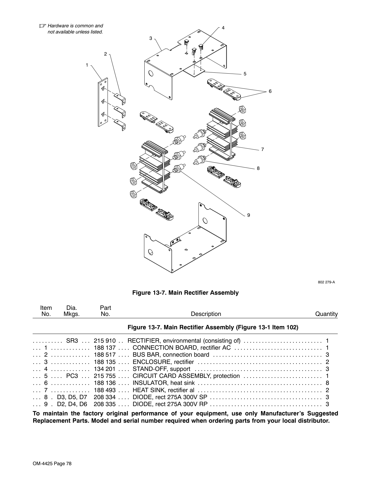 1 2 3 4 6 5 7 8 9 Figure 13-7. Main Rectifier Assembly Description Part No. Dia. Mkgs. Item No. Figure 13-7. Main Rectifier Assembly (Figure 13-1 Item 102) QuantitySr3