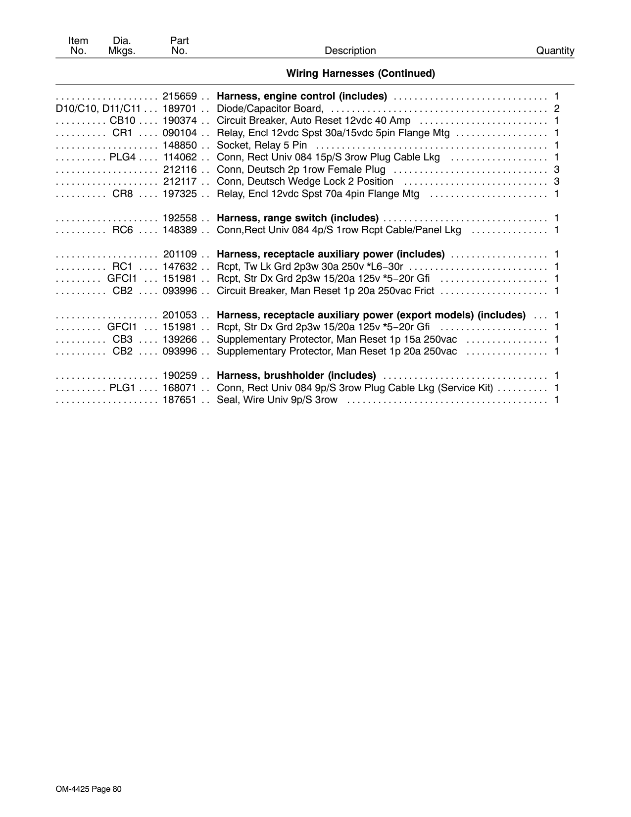 158465 Conn, Rect Univ 084 12p/S 3row Plug Cable Lkg 1 . . . . . . . . . . . . . . . . . . . . . . . . . . . . . . . . . . . 187654 Seal, Wire Univ 12p/S 3row 1 . . . . . . . . . . . . . . . . . . . . . . . . . . . . . . . . . . . . . . . . . . . . . . . . . . . . . . . . . . . . 196602 Plug, Cavity 18,30 Position Cinch Connector 6 . . . . . . . . . . . . . . . . . . . . . . . . . . . . . . . . . . . . . . . . . . . . .OM-4425 Page 80 Description Part No. Dia. Mkgs. Item No. Wiring Harnesses (Continued) Quantity 215659 Harness, engine control (includes) 1 . . . . . . . . . . . . . . . . . . . . . . . . . . . . . . . . . . . . . . . . . . . . . . . . . . . .
