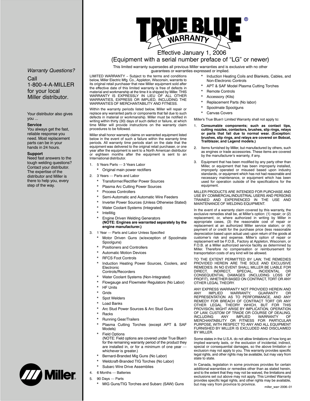 for your local Miller distributor. miller_warr 2006−01 Your distributor also gives you ... Service You always get the fast, reliable response you need. Most replacement parts can be in your hands in 24 hours. Support Need fast answers to the tough welding questions? Contact your distributor. The expertise of the distributor and Miller is there to help you, every step of the way. Effective January 1, 2006 (Equipment with a serial number preface of “LG” or newer) This limited warranty supersedes all previous Miller warranties and is exclusive with no other guarantees or warranties expressed or implied. LIMITED WARRANTY − Subject to the terms and conditions below, Miller Electric Mfg. Co., Appleton, Wisconsin, warrants to its original retail purchaser that new Miller equipment sold after the effective date of this limited warranty is free of defects in material and workmanship at the time it is shipped by Miller. THISWarranty Is Expressly In Lieu Of All Other