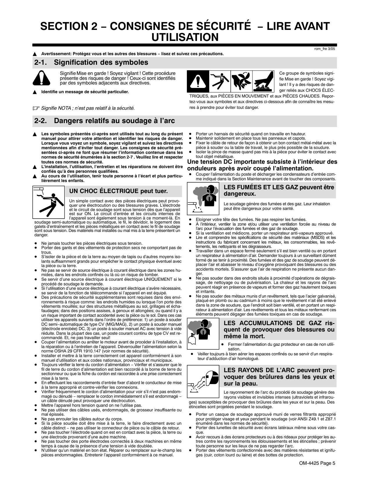 rom_fre 3/05 Avertissement: Protégez vous et les autres des blessures − lisez et suivez ces précautions. 2-1. Signification des symboles Signifie Mise en garde ! Soyez vigilant ! Cette procédure présente des risques de danger ! Ceux-ci sont identifiés par des symboles adjacents aux directives. Identifie un message de sécurité particulier. Signifie NOTA ; n’est pas relatif à la sécurité. Ce groupe de symboles signi- fie Mise en garde ! Soyez vigi- lant ! Il y a des risques de dan- ger reliés aux CHOCS ÉLEC- TRIQUES, aux PIÈCES EN MOUVEMENT et aux PIÈCES CHAUDES. Repor- tez-vous aux symboles et aux directives ci-dessous afin de connaître les mesu- res à prendre pour éviter tout danger. 2-2. Dangers relatifs au soudage à l’arc Les symboles présentés ci-après sont utilisés tout au long du présent manuel pour attirer votre attention et identifier les risques de danger. Lorsque vous voyez un symbole, soyez vigilant et suivez les directives mentionnées afin d’éviter tout danger. Les consignes de sécurité pré- sentées ci-après ne font que résumer l’information contenue dans les normes de sécurité énumérées à la section 2-7 . Veuillez lire et respecter toutes ces normes de sécurité. L’installation, l’utilisation, l’entretien et les réparations ne doivent être confiés qu’à des personnes qualifiées. Au cours de l’utilisation, tenir toute personne à l’écart et plus particu- lièrement les enfants. UN CHOC ÉLECTRIQUE peut tuer. Un simple contact avec des pièces électriques peut provo- quer une électrocution ou des blessures graves. L’électrode et le circuit de soudage sont sous tension dès que l’appareil est sur ON. Le circuit d’entrée et les circuits internes de l’appareil sont également sous tension à ce moment-là. En soudage semi-automatique ou automatique, le fil, le dévidoir, le logement des galets d’entraînement et les pièces métalliques en contact avec le fil de soudage sont sous tension. Des matériels mal installés ou mal mis à la terre présentent un danger. Ne jamais toucher les pièces électriques sous tension. Porter des gants et des vêtements de protection secs ne comportant pas de trous. S’isoler de la pièce et de la terre au moyen de tapis ou d’autres moyens iso- lants suffisamment grands pour empêcher le contact physique éventuel avec la pièce ou la terre. Ne pas se servir de source électrique à courant électrique dans les zones hu- mides, dans les endroits confinés ou là où on risque de tomber. Se servir d’une source électrique à courant électrique UNIQUEMENT si le procédé de soudage le demande. Si l’utilisation d’une source électrique à courant électrique s’avère nécessaire, se servir de la fonction de télécommande si l’appareil en est équipé. Des précautions de sécurité supplémentaires sont requises dans des envi- ronnements à risque comme: les endroits humides ou lorsque l’on porte des vêtements mouillés; sur des structures métalliques au sol, grillages et écha- faudages; dans des positions assises, à genoux et allongées; ou quand il y a un risque important de contact accidentel avec la pièce ou le sol. Dans ces cas utiliser les appareils suivants dans l’ordre de préférence: 1) un poste à souder DC semi−automatique de type CV (MIG/MAG), 2) un poste à souder manuel (électrode enrobée) DC, 3) un poste à souder manuel AC avec tension à vide réduite. Dans la plupart des cas, un poste courant continu de type CV est re- commandé. Et, ne pas travailler seul! Couper l’alimentation ou arrêter le moteur avant de procéder à l’installation, à la réparation ou à l’entretien de l’appareil. Déverrouiller l’alimentation selon la norme OSHA 29 CFR 1910.147 (voir normes de sécurité). Installer et mettre à la terre correctement cet appareil conformément à son manuel d’utilisation et aux codes nationaux, provinciaux et municipaux. Toujours vérifier la terre du cordon d’alimentation − Vérifier et s’assurer que le fil de terre du cordon d’alimentation est bien raccordé à la borne de terre du sectionneur ou que la fiche du cordon est raccordée à une prise correctement mise à la terre. En effectuant les raccordements d’entrée fixer d’abord le conducteur de mise à la terre approprié et contre-vérifier les connexions. Vérifier fréquemment le cordon d’alimentation pour voir s’il n’est pas endom- magé ou dénudé − remplacer le cordon immédiatement s’il est endommagé − un câble dénudé peut provoquer une électrocution. Mettre l’appareil hors tension quand on ne l’utilise pas. Ne pas utiliser des câbles usés, endommagés, de grosseur insuffisante ou mal épissés. Ne pas enrouler les câbles autour du corps. Si la pièce soudée doit être mise à la terre, le faire directement avec un câble distinct − ne pas utiliser le connecteur de pièce ou le câble de retour. Ne pas toucher l’électrode quand on est en contact avec la pièce, la terre ou une électrode provenant d’une autre machine. Ne pas toucher des porte électrodes connectés à deux machines en même temps à cause de la présence d’une tension à vide doublée. N’utiliser qu’un matériel en bon état. Réparer ou remplacer sur-le-champ les pièces endommagées. Entretenir l’appareil conformément à ce manuel. Porter un harnais de sécurité quand on travaille en hauteur. Maintenir solidement en place tous les panneaux et capots. Fixer le câble de retour de façon à obtenir un bon contact métal-métal avec la pièce à souder ou la table de travail, le plus près possible de la soudure. Isoler la pince de masse quand pas mis à la pièce pour éviter le contact avec tout objet métallique. Une tension DC importante subsiste à l’intérieur des onduleurs après avoir coupé l’alimentation. Couper l’alimentation du poste et décharger les condensateurs d’entrée com- me indiqué dans la Secti