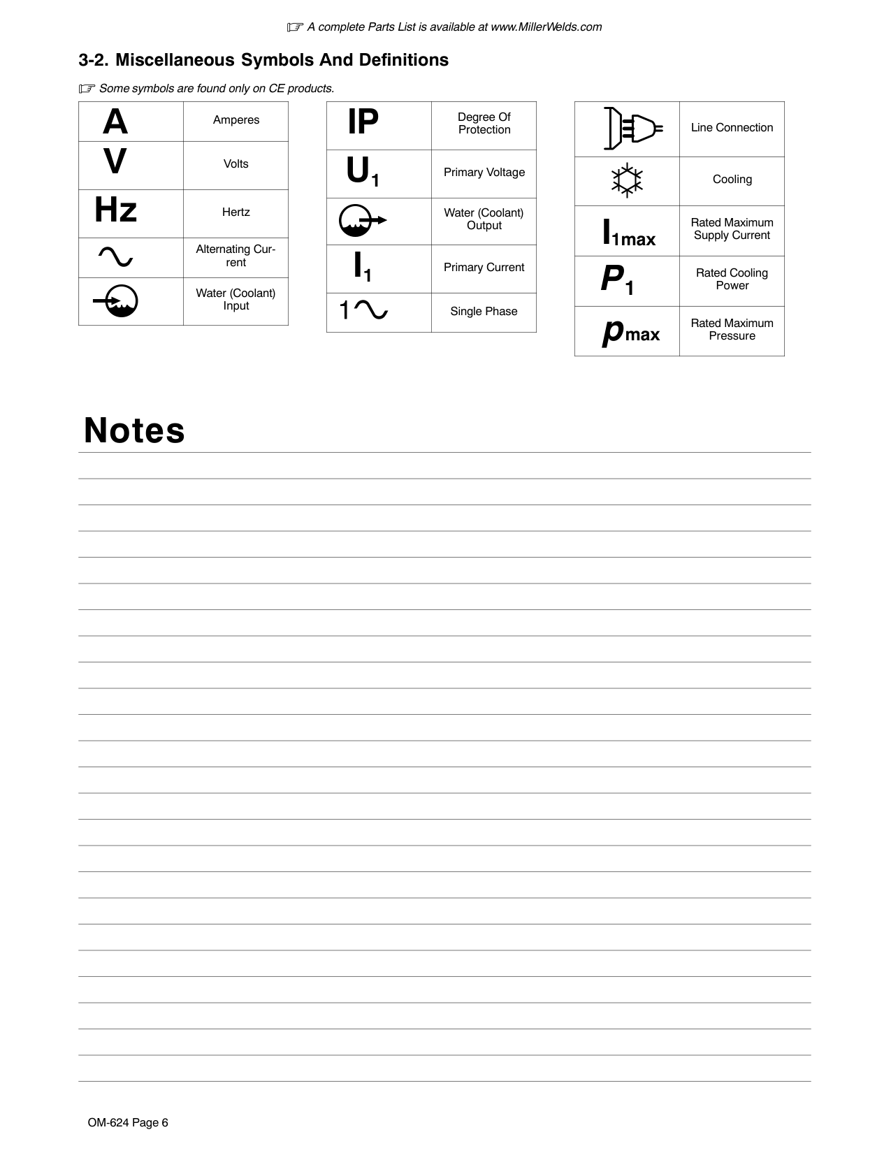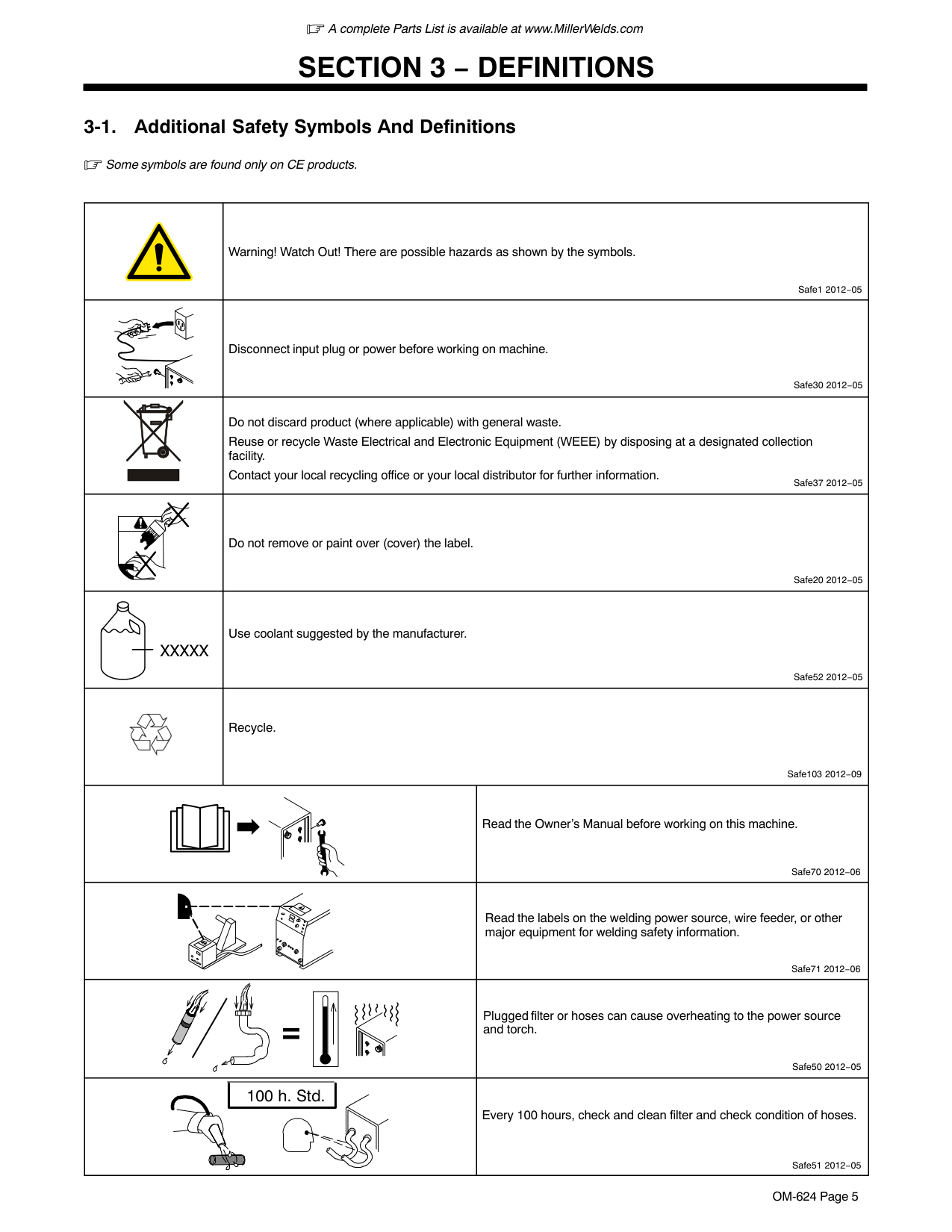Use coolant suggested by the manufacturer. Safe52 2012−05 Recycle. Safe103 2012−09 Read the Owner’s Manual before working on this machine. Safe70 2012−06 Read the labels on the welding power source, wire feeder, or other major equipment for welding safety information. Safe71 2012−06 Safe50 2012−05 Plugged filter or hoses can cause overheating to the power source and torch. 100 h. Std. Safe51 2012−05 Every 100 hours, check and clean filter and check condition of hoses.A complete Parts List is available at www.MillerWelds.com OM-624 Page 6 3-2. Miscellaneous Symbols And Definitions Some symbols are found only on CE products.
