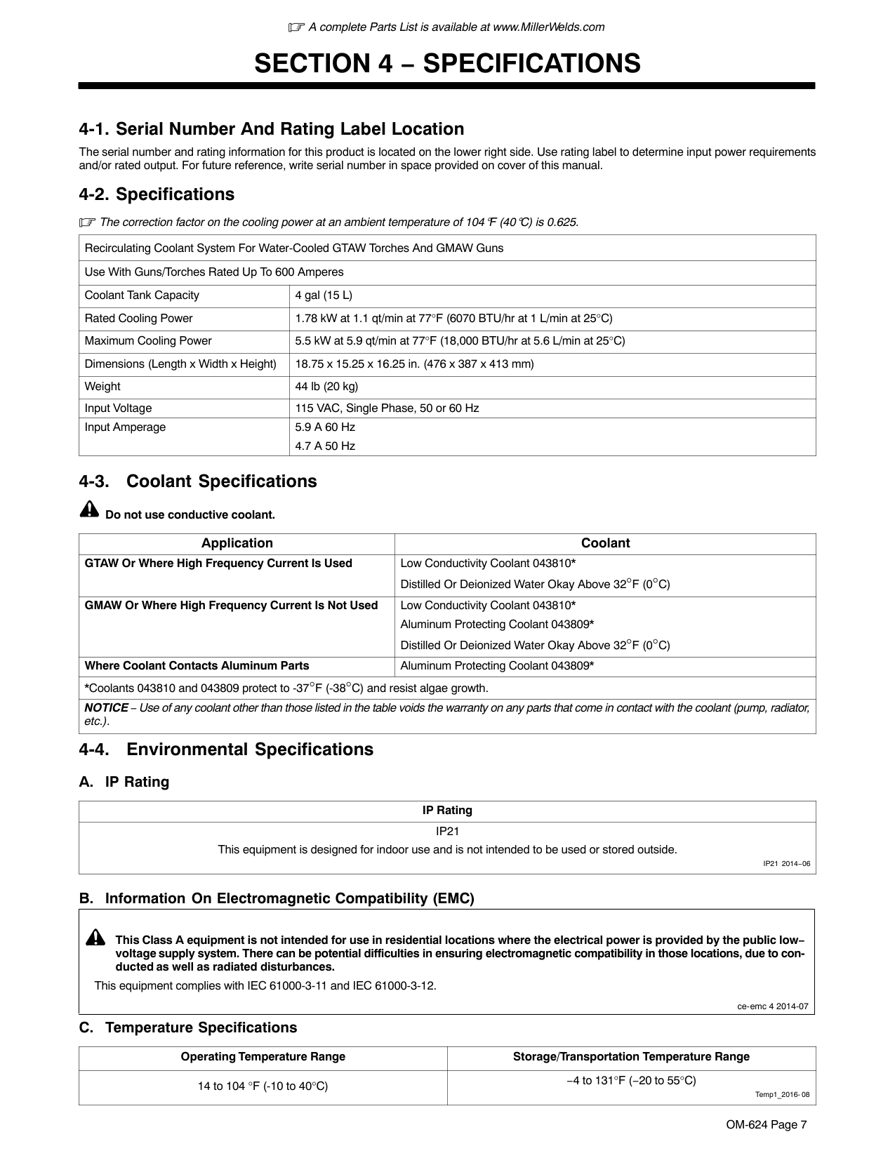 Temperature Specifications Operating Temperature Range Storage/Transportation Temperature Range 14 to 104 °F (-10 to 40°C) −4 to 131°F (−20 to 55°C) Temp1_2016- 08A complete Parts List is available at www.MillerWelds.com OM-624 Page 8