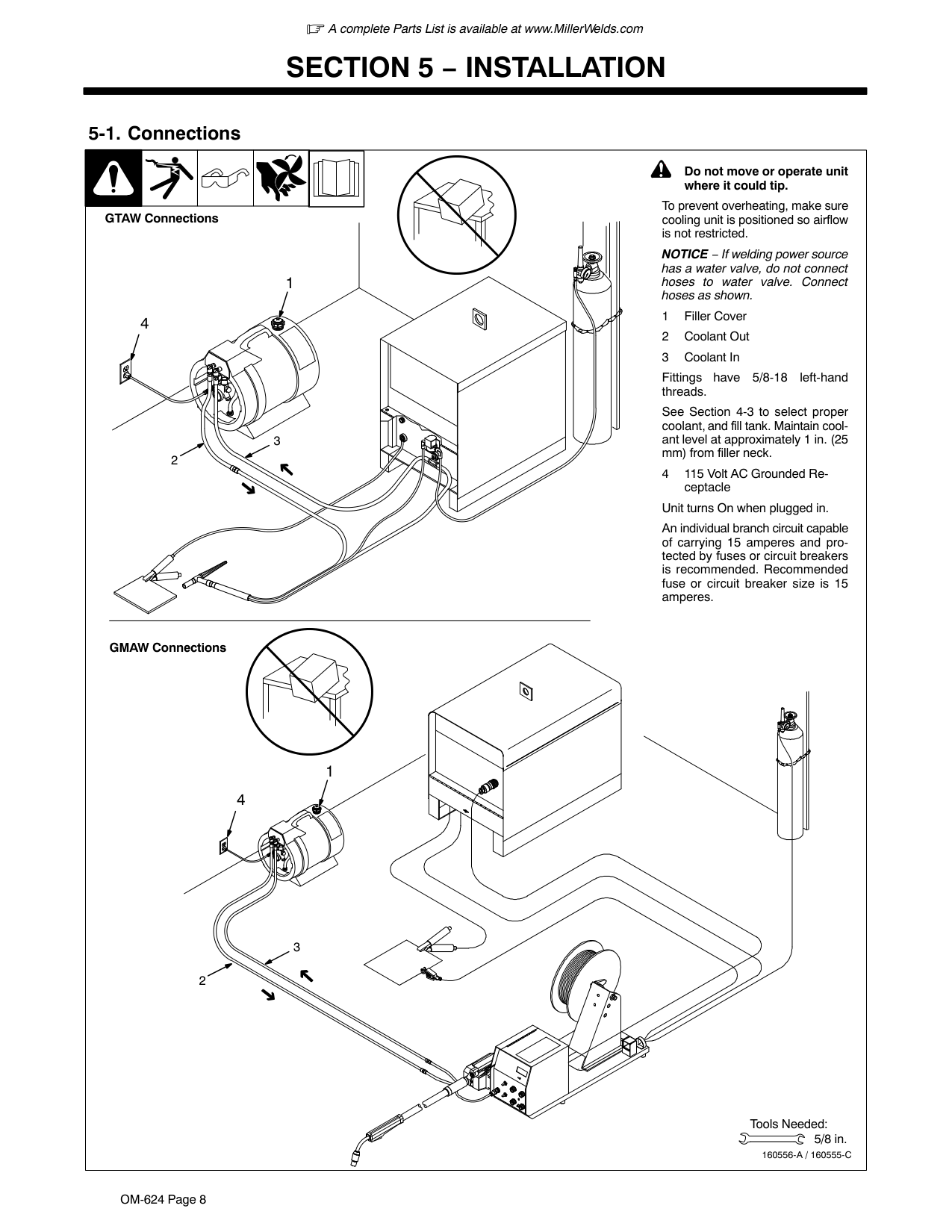 ! Do not move or operate unit where it could tip. To prevent overheating, make sure cooling unit is positioned so airflow is not restricted. NOTICE − If welding power source has a water valve, do not connect hoses to water valve. Connect hoses as shown. 1 Filler Cover 2 Coolant Out 3 Coolant In Fittings have 5/8-18 left-hand threads. See Section 4-3 to select proper coolant, and fill tank. Maintain cool- ant level at approximately 1 in. (25 mm) from filler neck. 4 115 Volt AC Grounded Re- ceptacle Unit turns On when plugged in. An individual branch circuit capable of carrying 15 amperes and pro- tected by fuses or circuit breakers is recommended. Recommended fuse or circuit breaker size is 15 amperes. GTAW Connections GMAW Connections 1 2 3 4 Tools Needed: 5/8 in. 1 2 3 4A complete Parts List is available at www.MillerWelds.com OM-624 Page 9