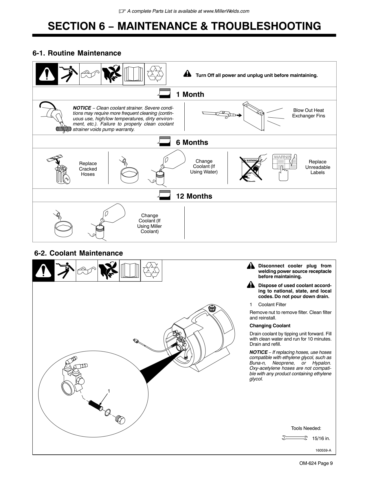 6-1. Routine Maintenance ! Turn Off all power and unplug unit before maintaining. 1 Month Blow Out Heat Exchanger Fins NOTICE − Clean coolant strainer. Severe condi- tions may require more frequent cleaning (contin- uous use, high/low temperatures, dirty environ- ment, etc.). Failure to properly clean coolant strainer voids pump warranty. 6 Months Replace Cracked Hoses Replace Unreadable Labels Change Coolant (If Using Water) 12 Months Change Coolant (If Using Miller Coolant) 6-2. Coolant Maintenance 1 15/16 in. Tools Needed:160559-A