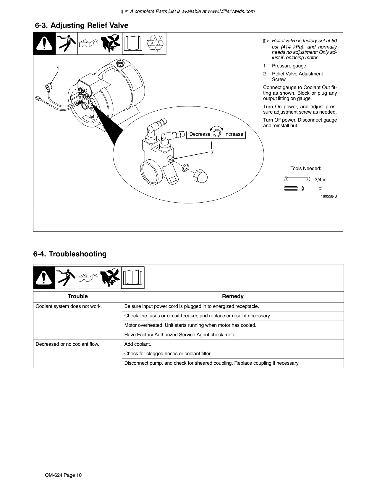 Relief valve is factory set at 60 psi (414 kPa), and normally needs no adjustment: Only ad- just if replacing motor. 1 Pressure gauge 2 Relief Valve Adjustment Screw Connect gauge to Coolant Out fit- ting as shown. Block or plug any output fitting on gauge. Turn On power, and adjust pres- sure adjustment screw as needed. Turn Off power. Disconnect gauge and reinstall nut. 3/4 in. 2 1 Increase Decrease 6-4. Troubleshooting Trouble Remedy Coolant system does not work. Be sure input power cord is plugged in to energized receptacle. Check line fuses or circuit breaker, and replace or reset if necessary. Motor overheated. Unit starts running when motor has cooled. Have Factory Authorized Service Agent check motor. Decreased or no coolant flow. Add coolant. Check for clogged hoses or coolant filter. Disconnect pump, and check for sheared coupling. Replace coupling if necessary.A complete Parts List is available at www.MillerWelds.com OM-624 Page 11