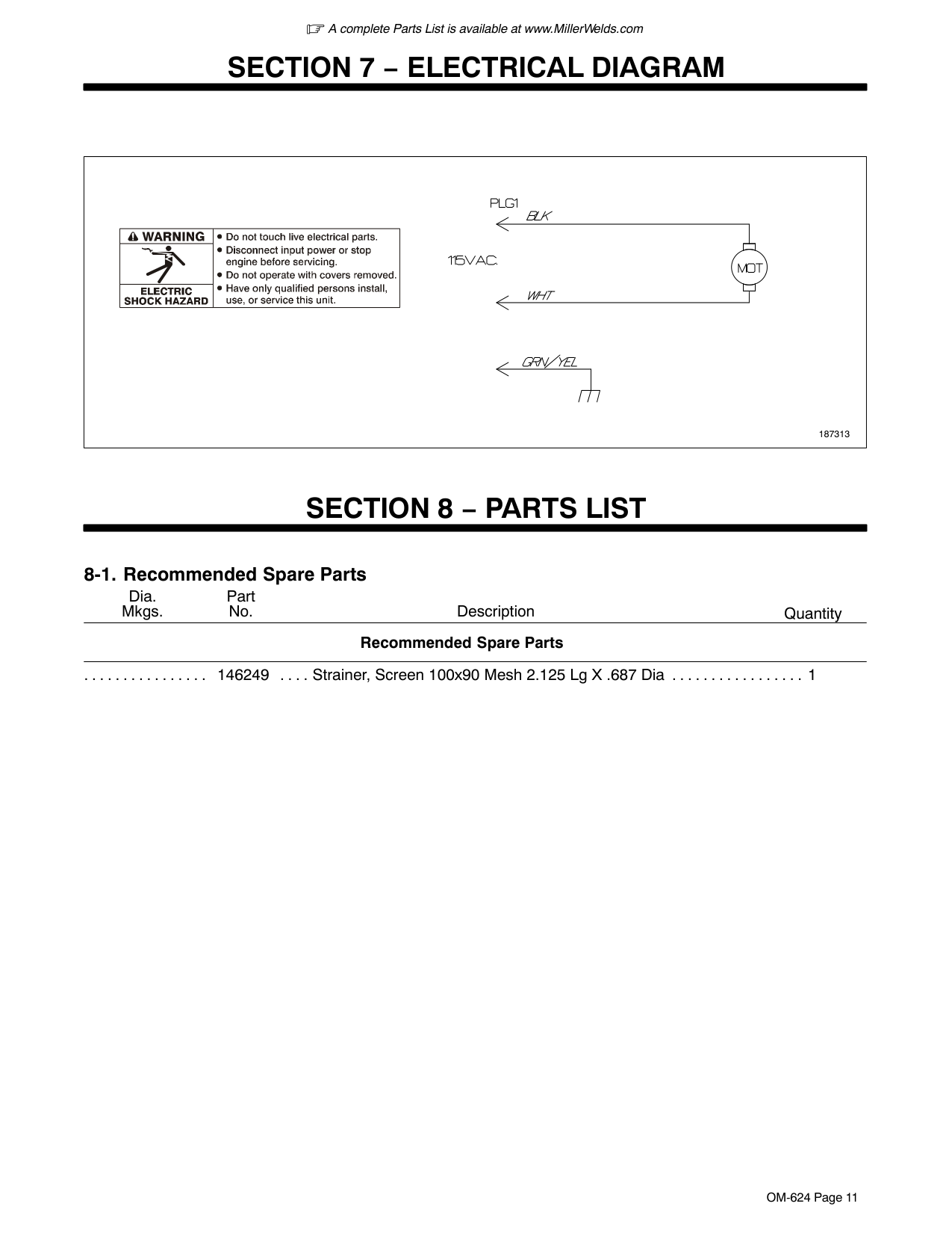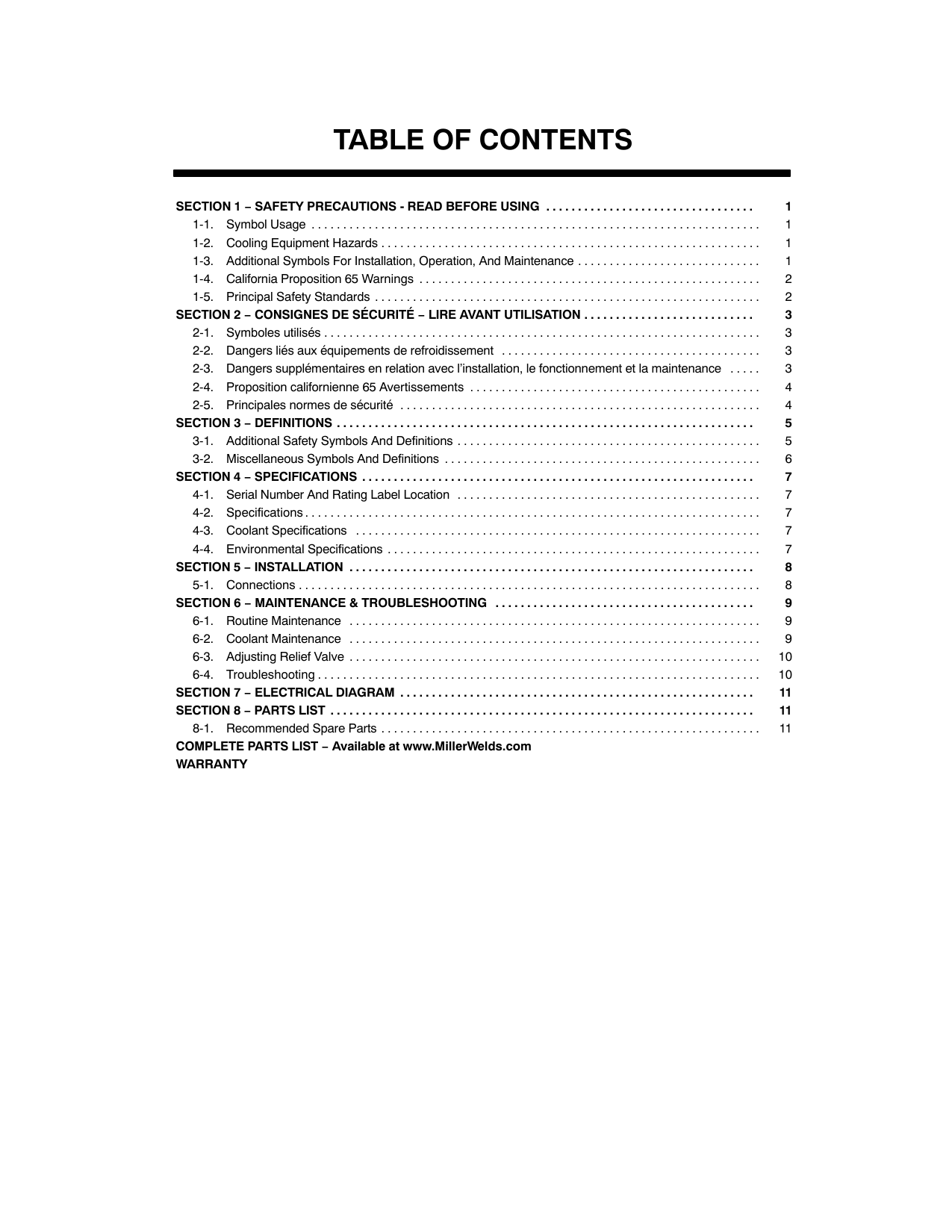 11 . . . . . . . . . . . . . . . . . . . . . . . . . . . . . . . . . . . . . . . . . . . . . . . . . . . . . . . . . . . . . . . . . . . 8-1. Recommended Spare Parts 11 . . . . . . . . . . . . . . . . . . . . . . . . . . . . . . . . . . . . . . . . . . . . . . . . . . . . . . . . . . . . COMPLETE PARTS LIST − Available at www.MillerWelds.comWarranty